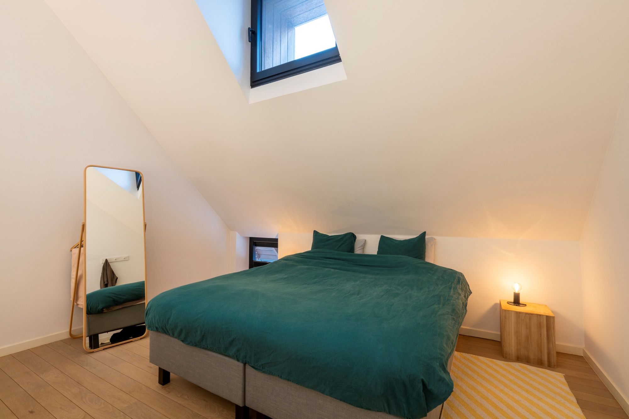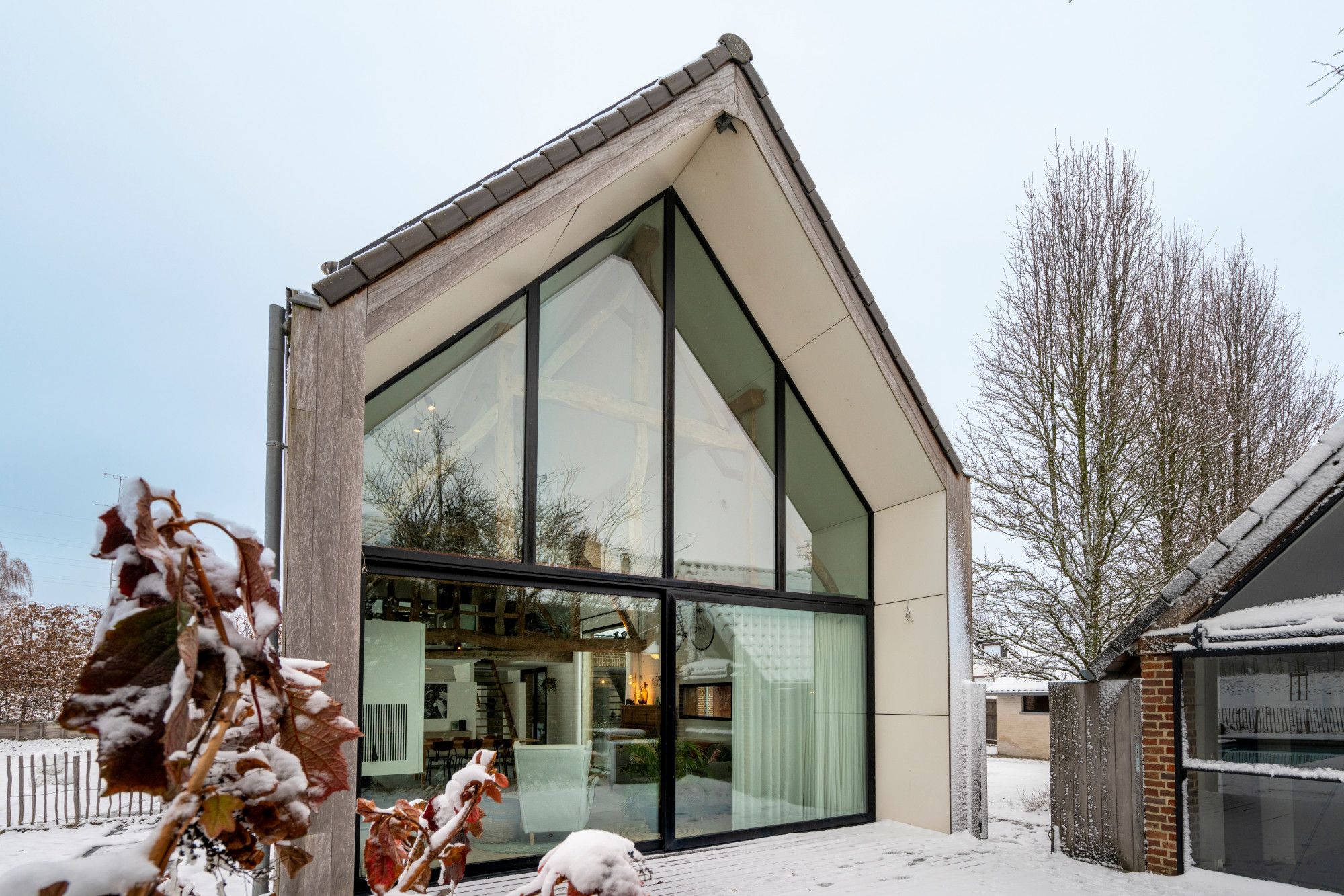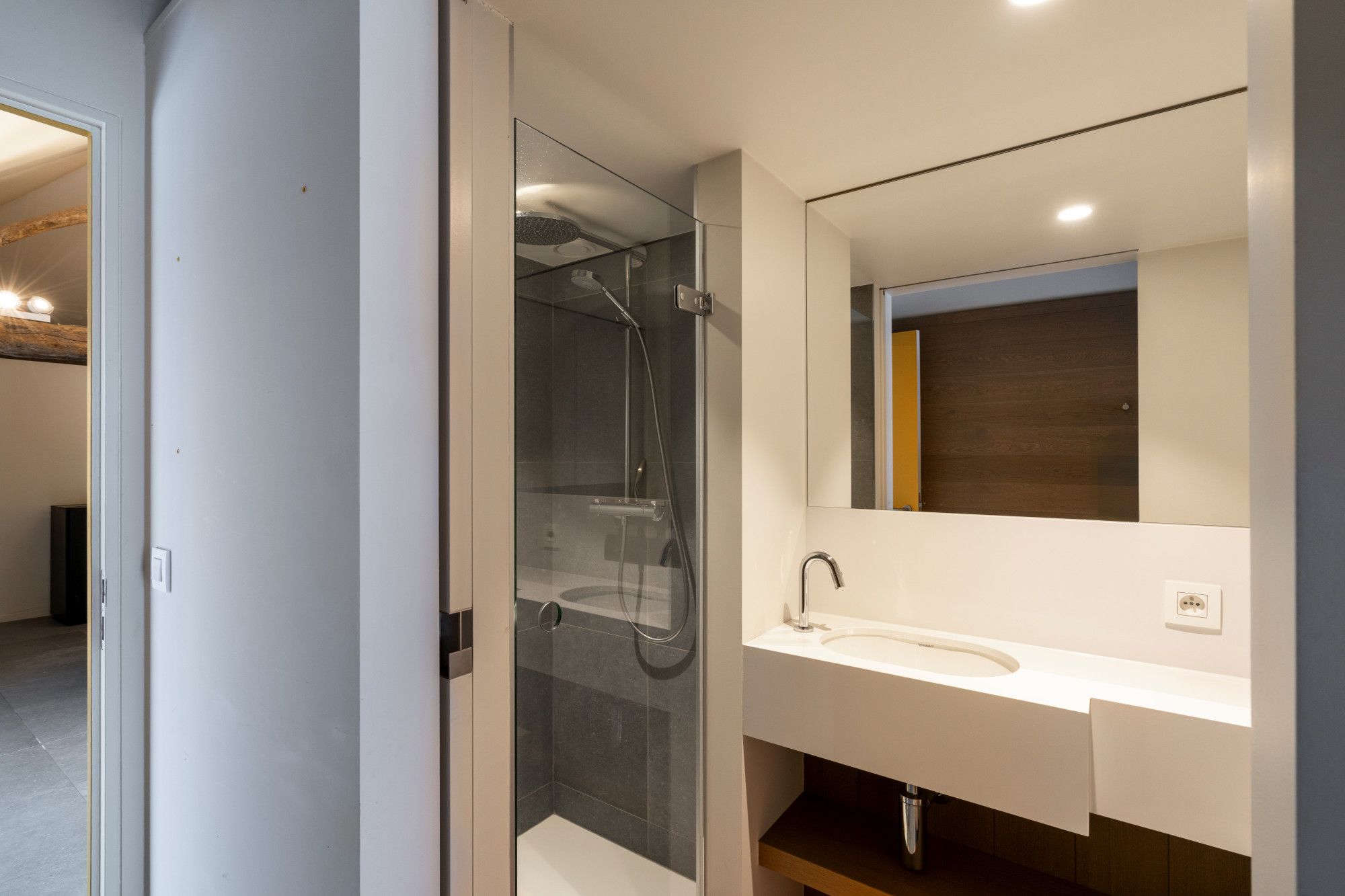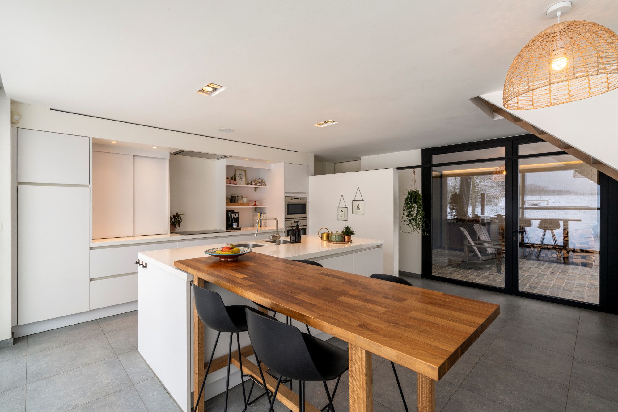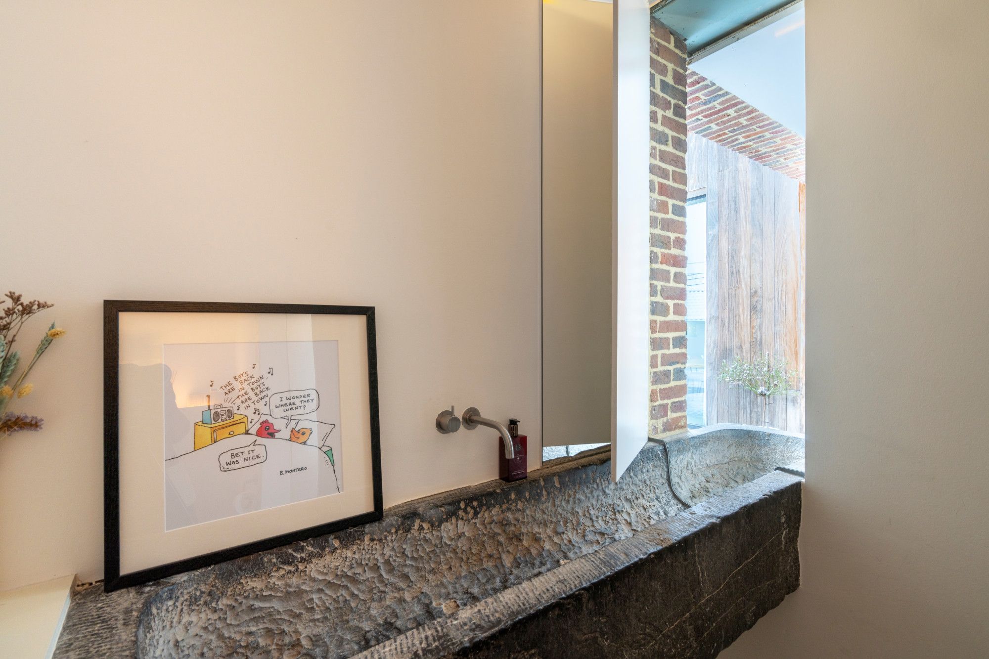 Het leefgedeelte straalt ruimte en licht uit. De moderne, volledig uitgeruste keuken met kookeiland vormt het hart van de woning en beschikt over hoogwaardige toestellen zoals een koelkast, oven, microgolfoven, inductiekookplaat, dampkap en vaatwasser. Aansluitend bevindt zich de eethoek en de zithoek met een open haard op hout. De plafonds lopen hier open tot in de nok, waardoor de originele dakstructuur volledig zichtbaar blijft en een prachtige verbinding ontstaat met de kantoorruimte op de verdieping.