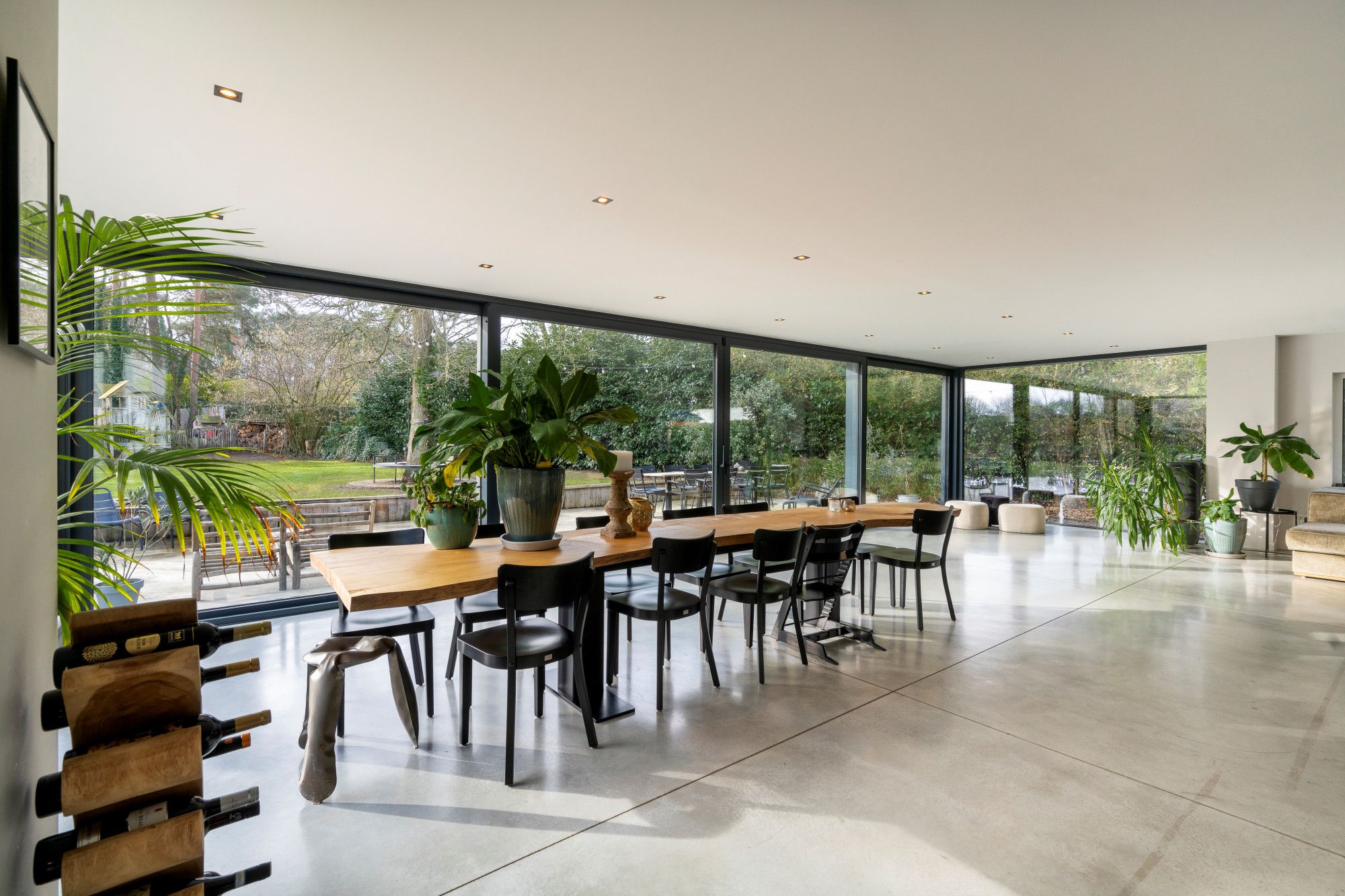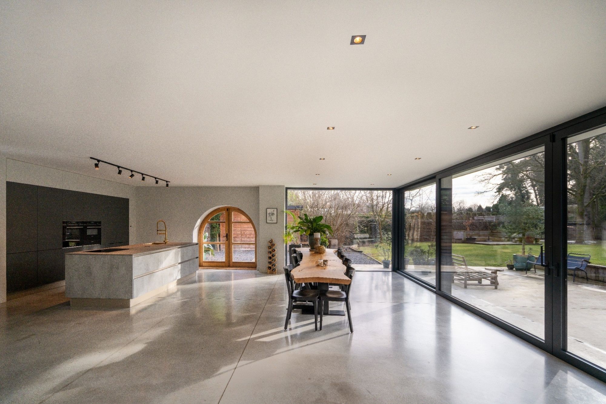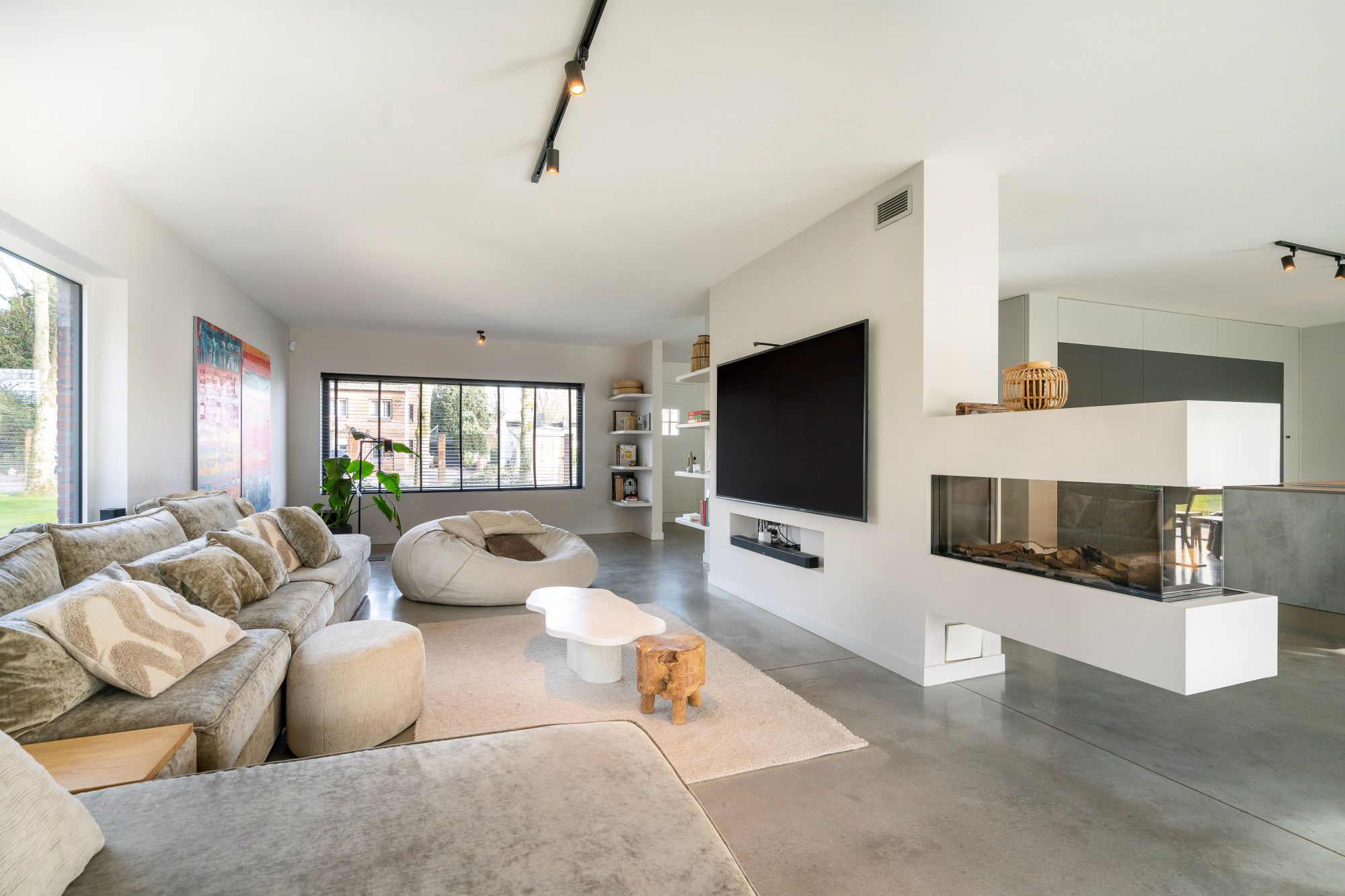 Aansluitend bevindt zich de royale leefruimte, opgevat als één open geheel met een centrale doorkijk gashaard en verschillende functionele zones: zithoek, eethoek, studeerhoek en speelhoek. De open maatwerkkeuken met kookeiland sluit hier naadloos op aan en is uitgerust met alle gebruikelijke hoogwaardige inbouwtoestellen. De afwezigheid van overbodige deuren versterkt het open en vloeiende karakter van het interieur.