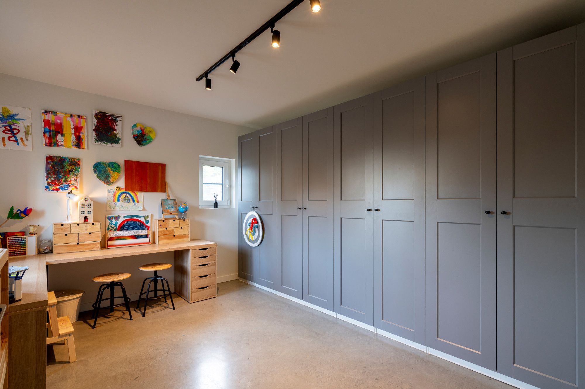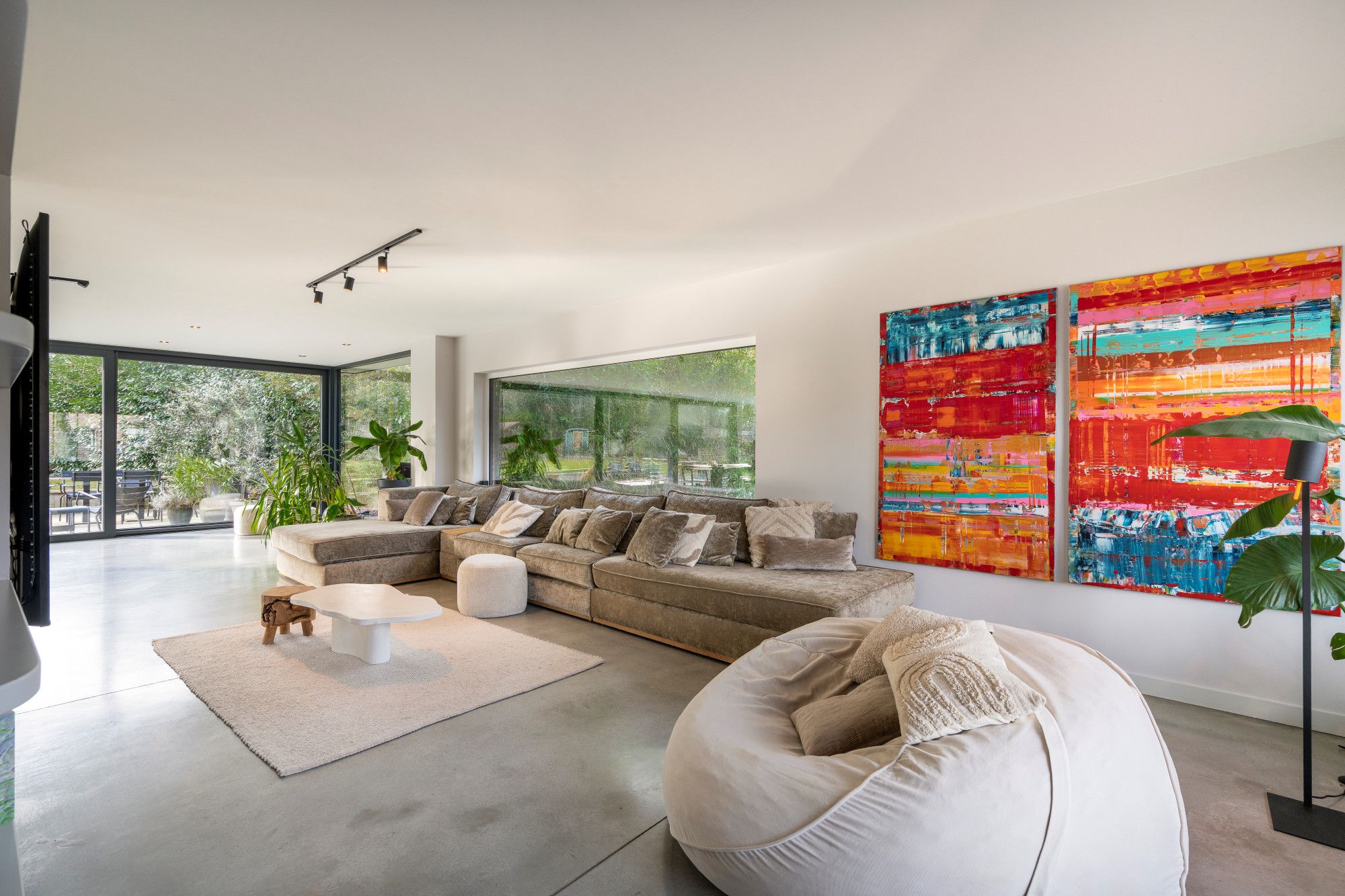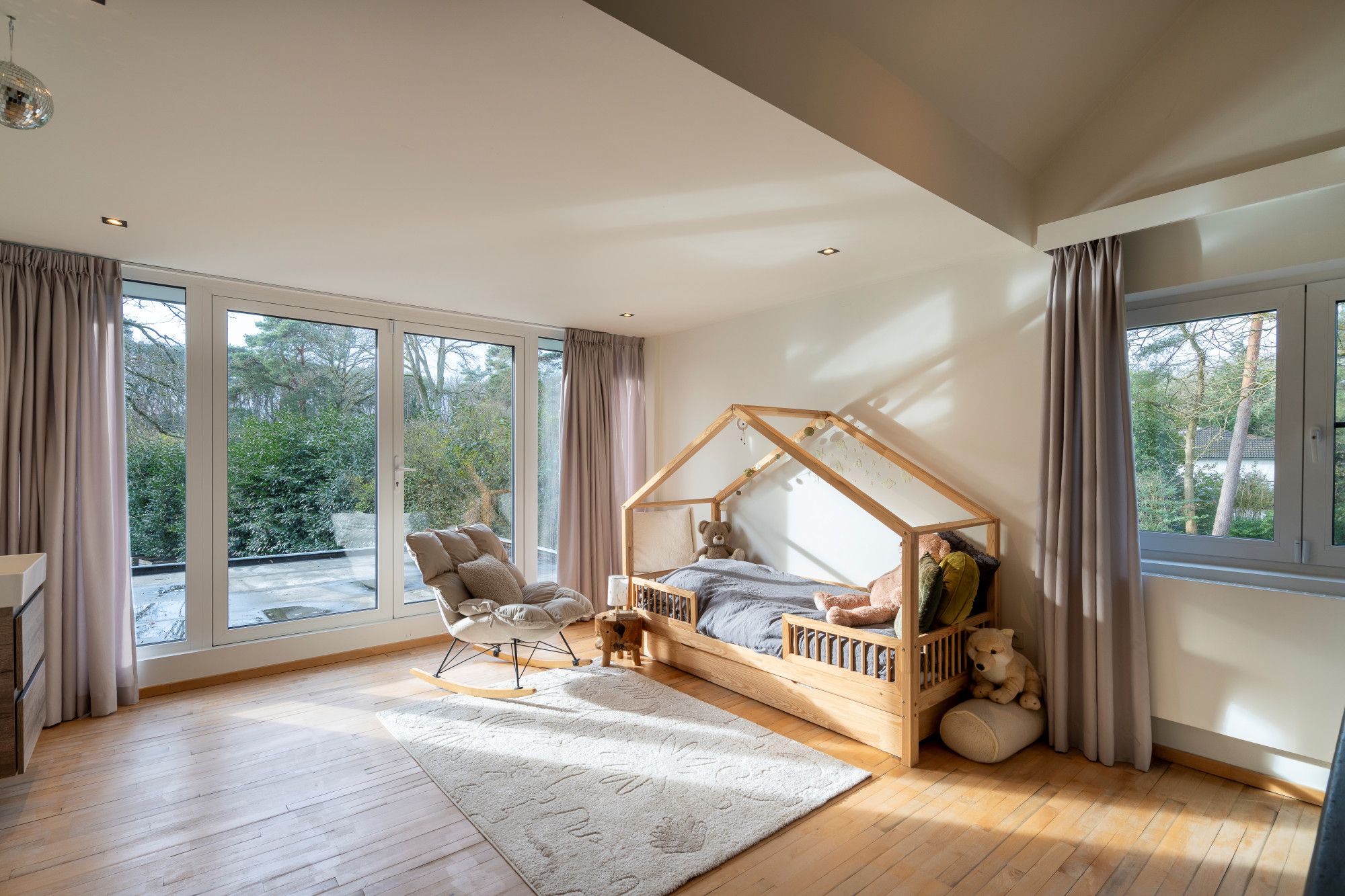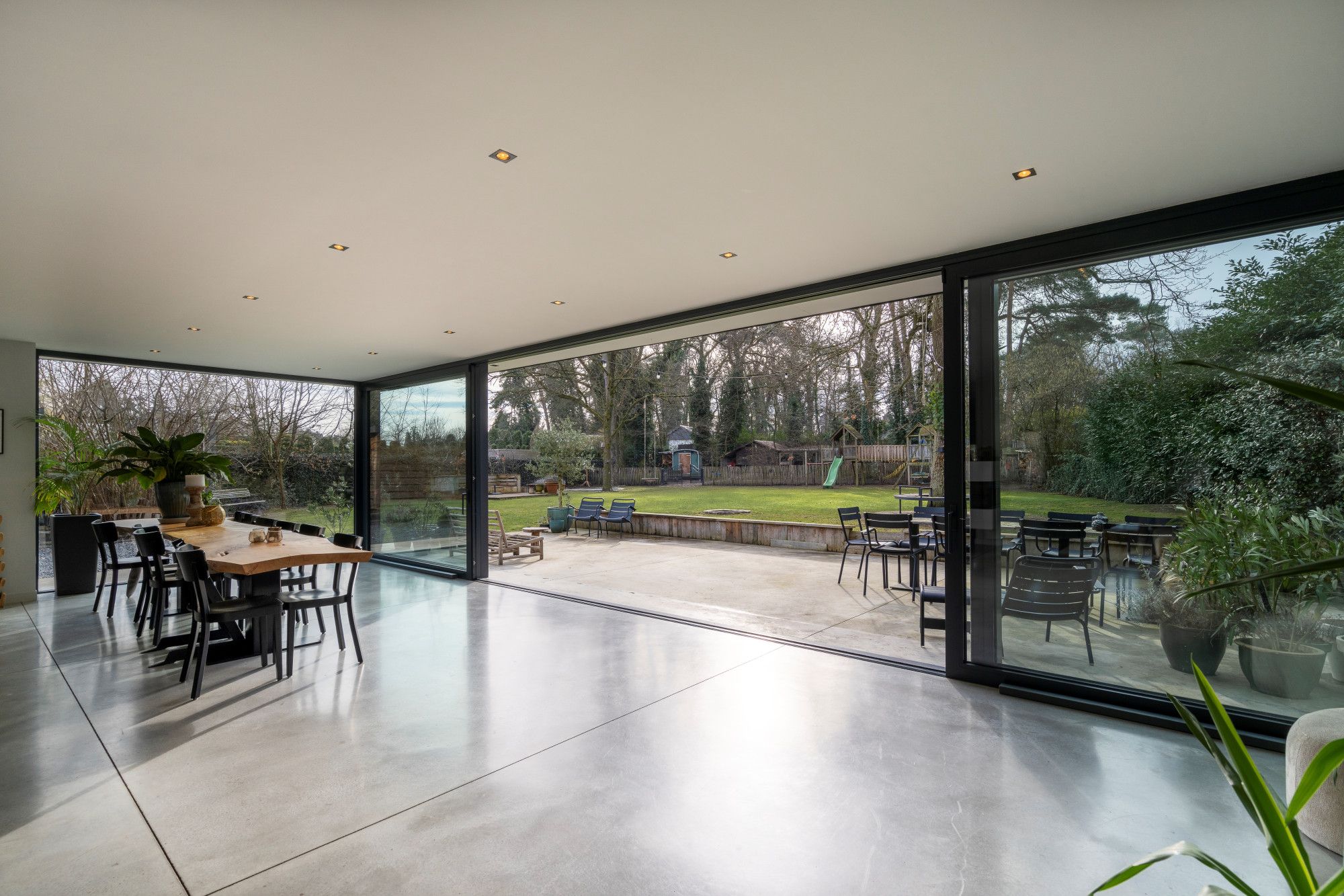 Aansluitend bevindt zich de royale leefruimte, opgevat als één open geheel met een centrale doorkijk gashaard en verschillende functionele zones: zithoek, eethoek, studeerhoek en speelhoek. De open maatwerkkeuken met kookeiland sluit hier naadloos op aan en is uitgerust met alle gebruikelijke hoogwaardige inbouwtoestellen. De afwezigheid van overbodige deuren versterkt het open en vloeiende karakter van het interieur.