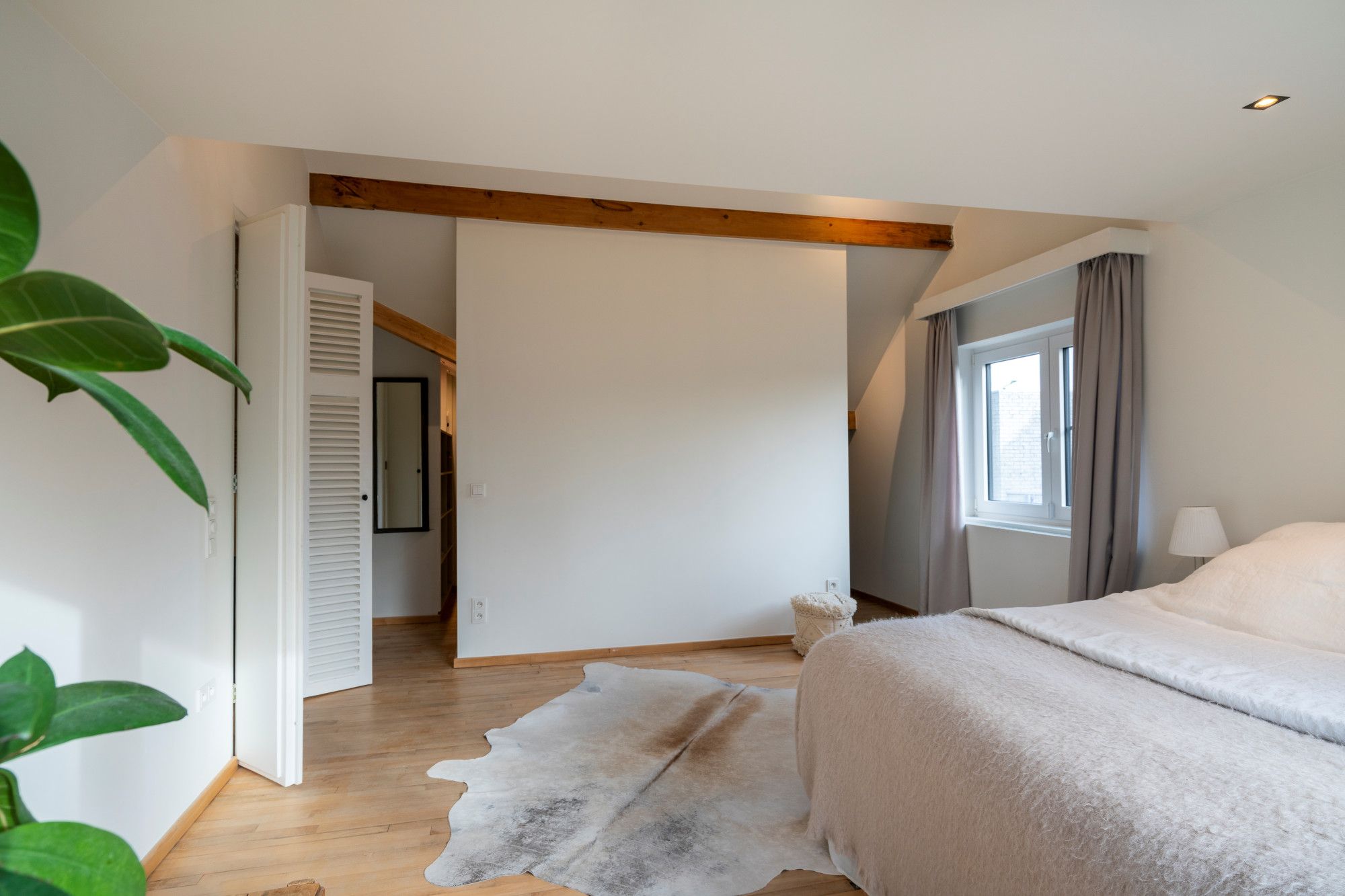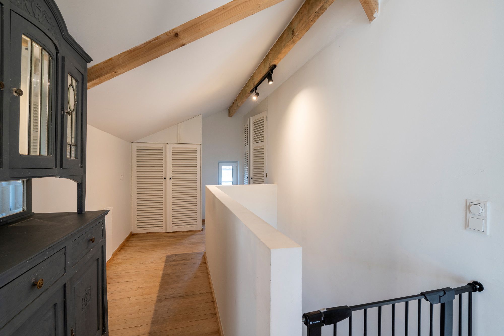 Op de verdieping bevinden zich twee ruime slaapkamers, elk met een privatieve dressing. Centraal is er een stijlvol ingerichte badkamer met een vrijstaand designbad, een inloopdouche en een dubbele wastafel. Verder zijn er nog een apart toilet, een technische ruimte voor de verwarmingsinstallatie en een praktische berging.