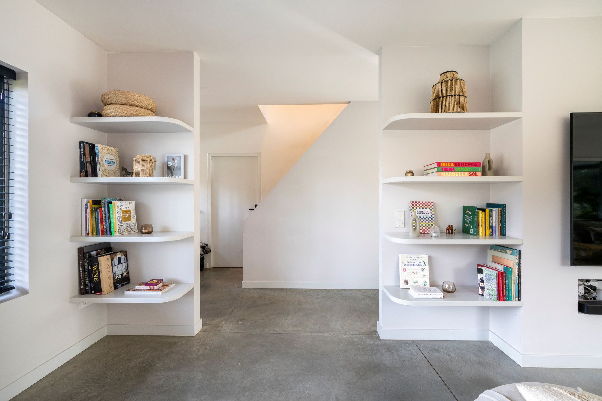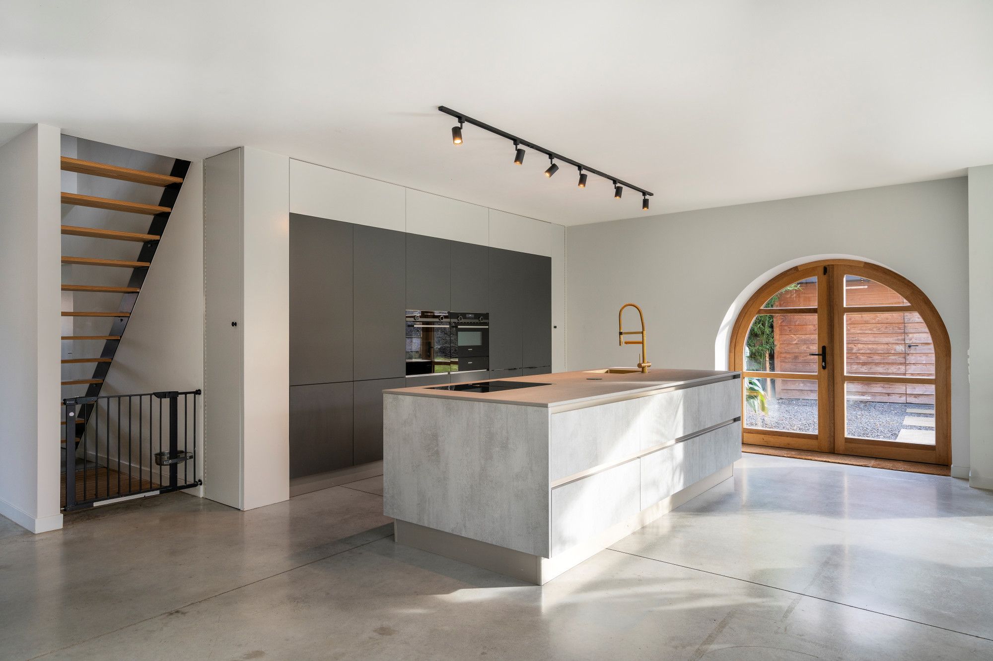 De gesloten voorgevel straalt rust en privacy uit, terwijl de achtergevel en aanbouw werden uitgewerkt met grote glaspartijen en schuiframen. Hierdoor ontstaat een sterke relatie tussen binnen en buiten, met maximale lichtinval en een open zicht op de tuin. Ze werd bovendien afgewerkt met kwalitatieve materialen, waaronder een gepolierde betonvloer op het gelijkvloers en parketvloeren op de verdieping, wat bijdraagt aan een stijlvolle en tijdloze uitstraling.