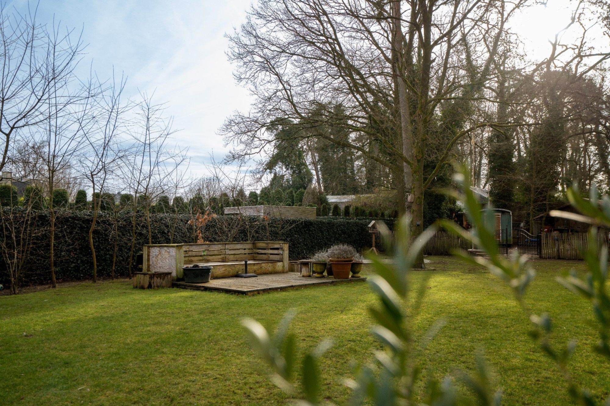 De tuin is Zuid georienteerd, beschikt over meerdere terrassen en een praktische tuinbering. Er zijn twee automatische poorten en het perceel is volledig omheind.
