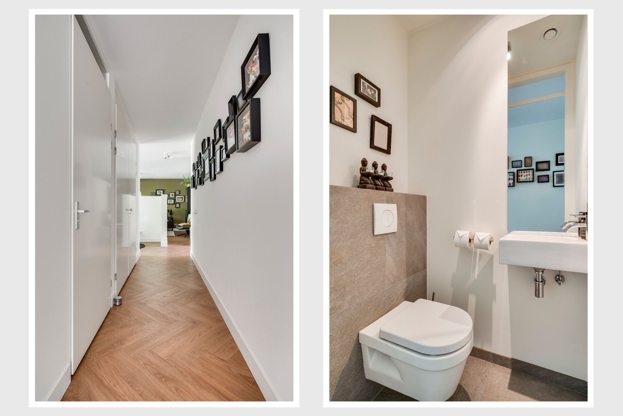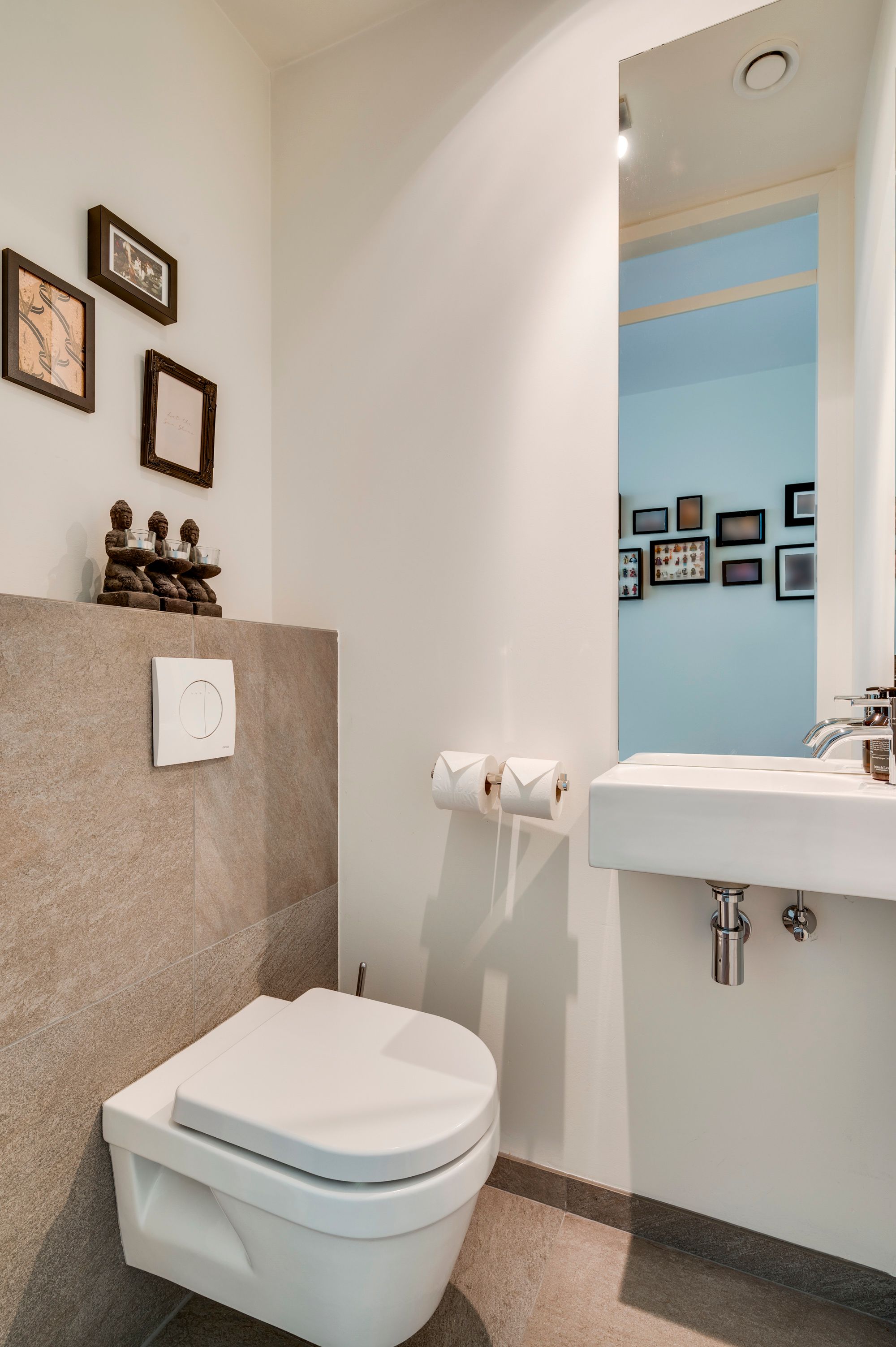 In de doorgang gelegen, eigentijds strak gastentoilet voorzien van een zwevend wandcloset en fonteintje. Naastgelegen wandkast waar geplaatst de witgoedaansluitingen voor wasmachine en droger, alsmede de wamtepompinstallatie met circulair systeem en centrale mechanische ventilatiebox.
