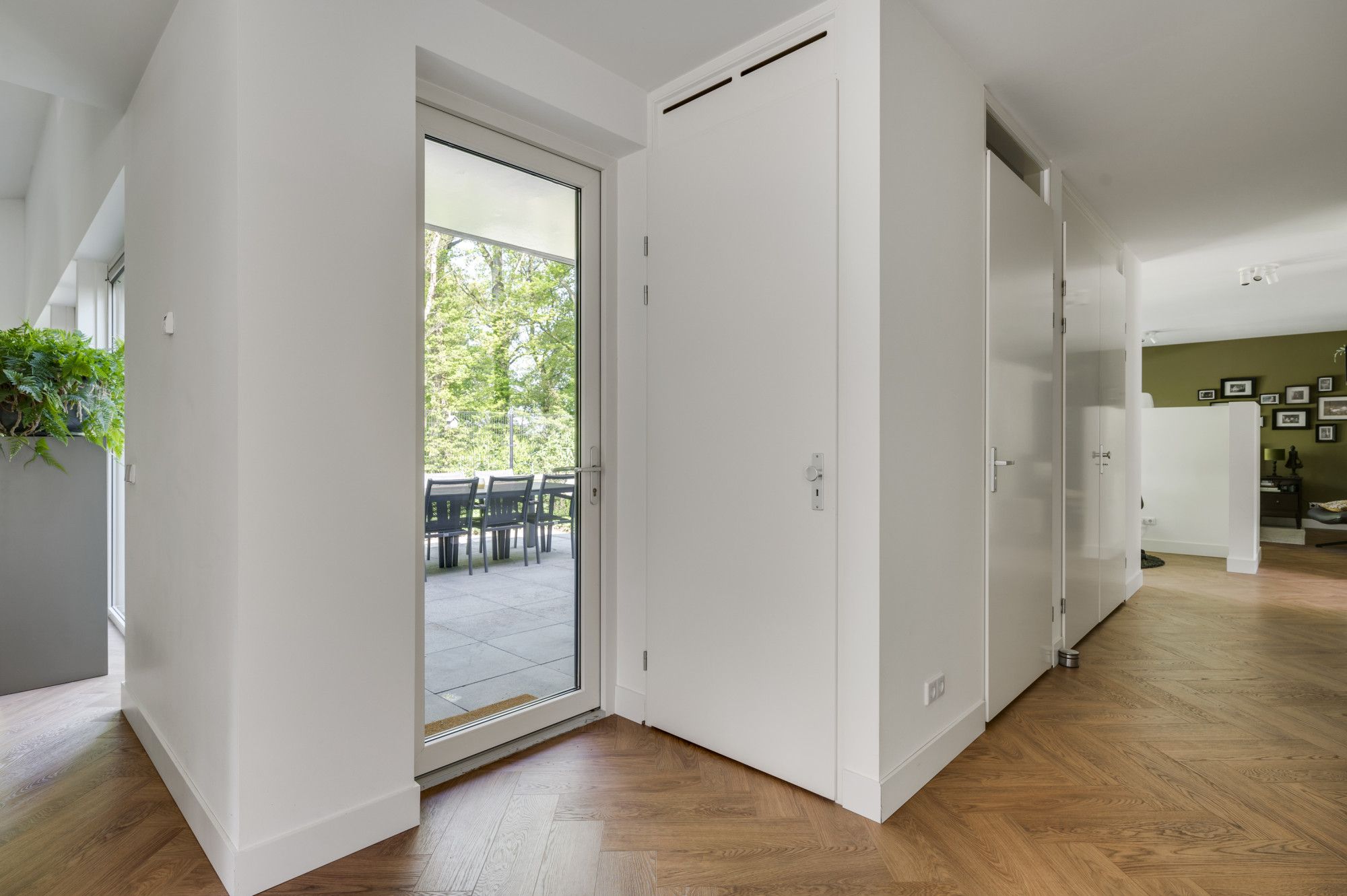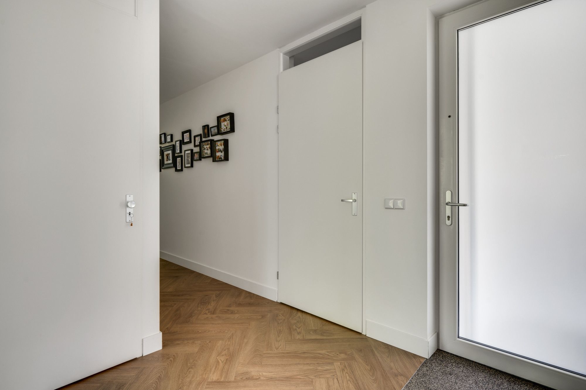Centrale hal/entree welke in open verbinding staat met de woonkamer, keuken, slaapkamer, werkkamer en badkamer.