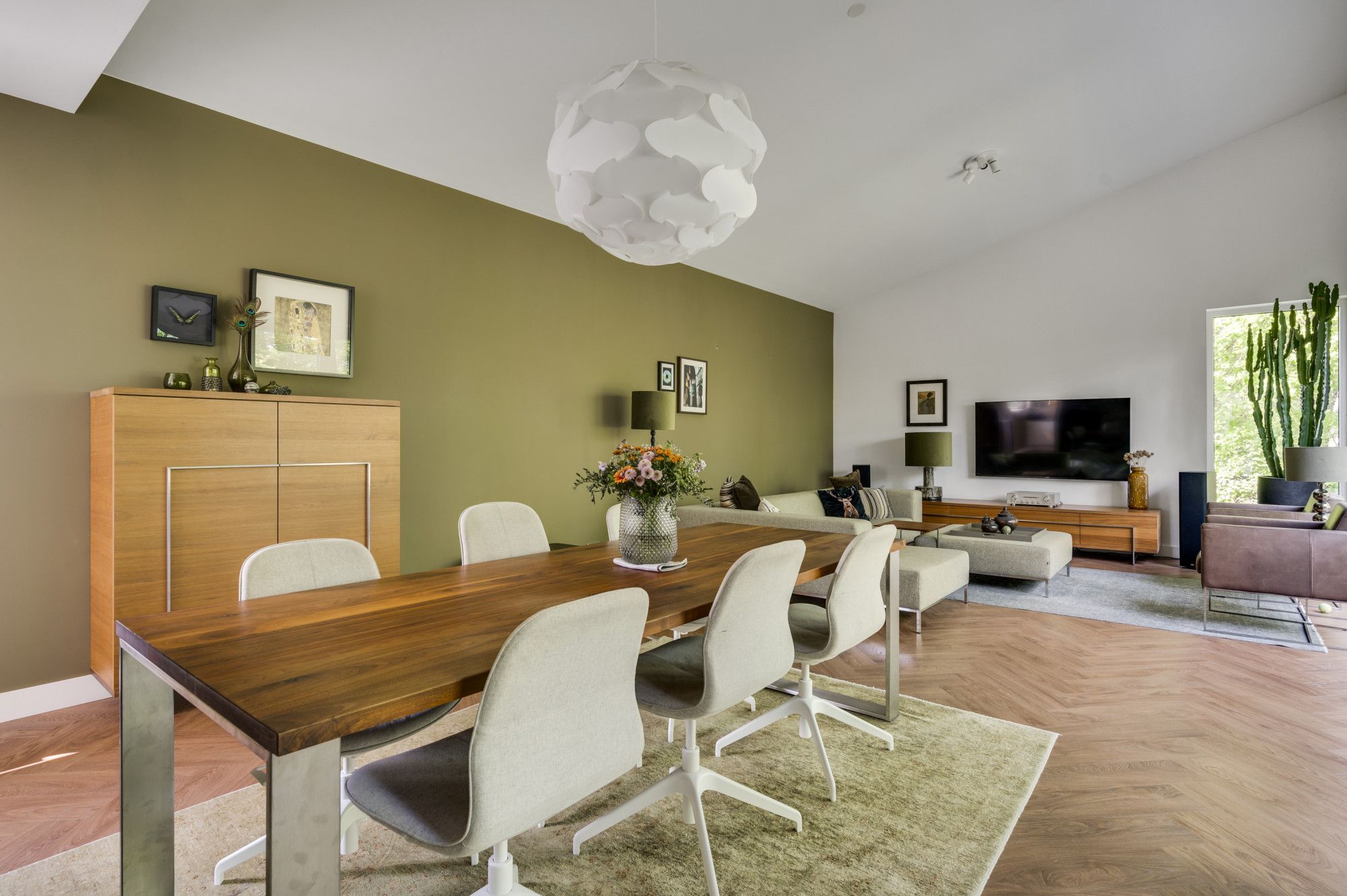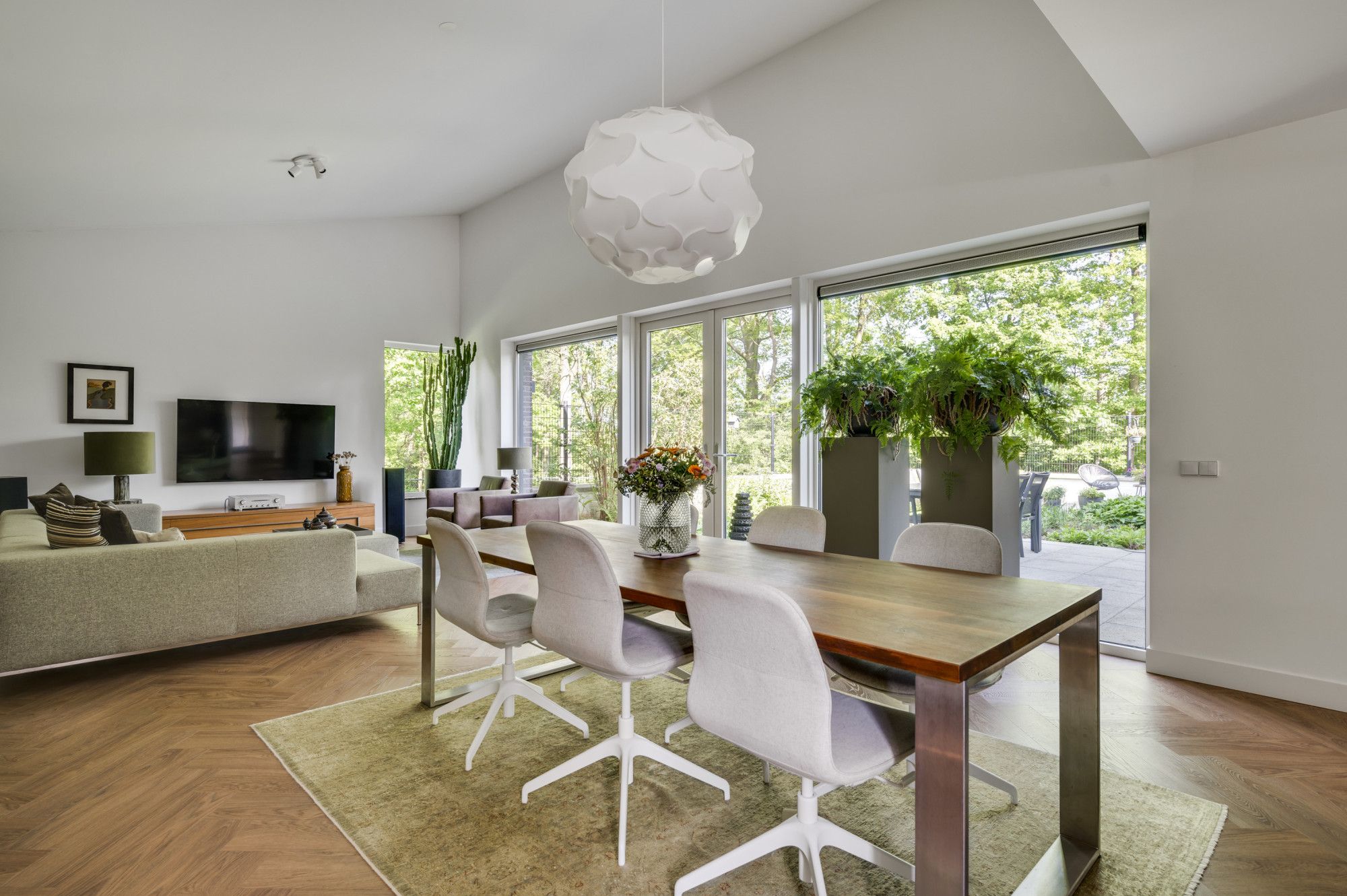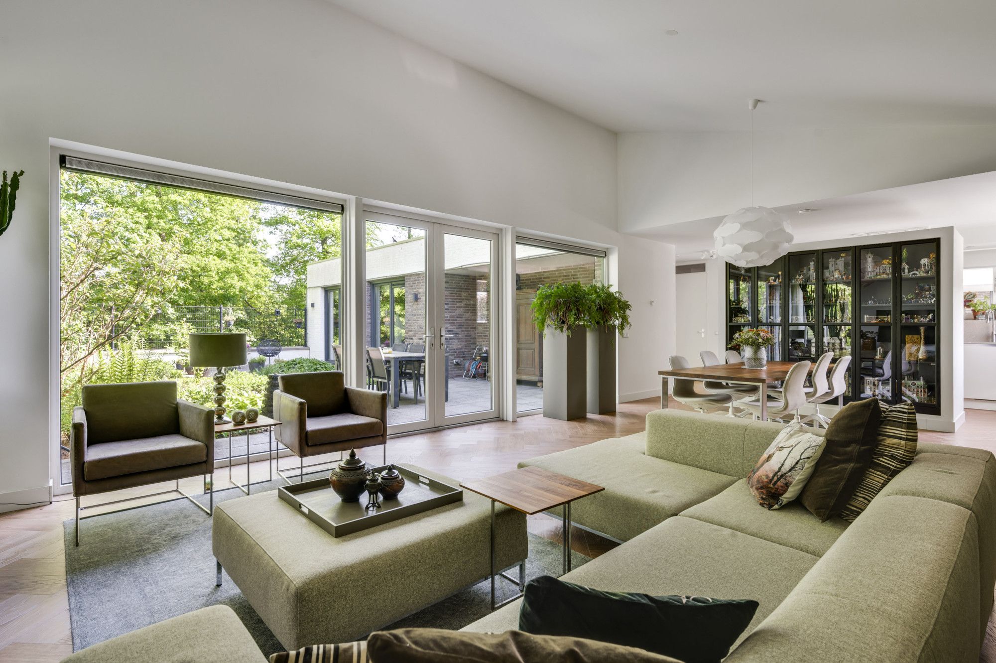 Moderne woonkamer met veel lichtinval door de grote raampartijen, het hoge lessenaarsdak geeft een extra ruimtelijke beleving en biedt plaats aan de living/lounge met multimediale aansluitingen en een royale eethoek. De vaste kastenwand functioneert als roomdivider en biedt veel opslagruimte. Dubbele openslaande tuindeuren geven direct tuincontact naar de patio-tuin met vrij uitzicht op het glooiende Limburgse landschap.