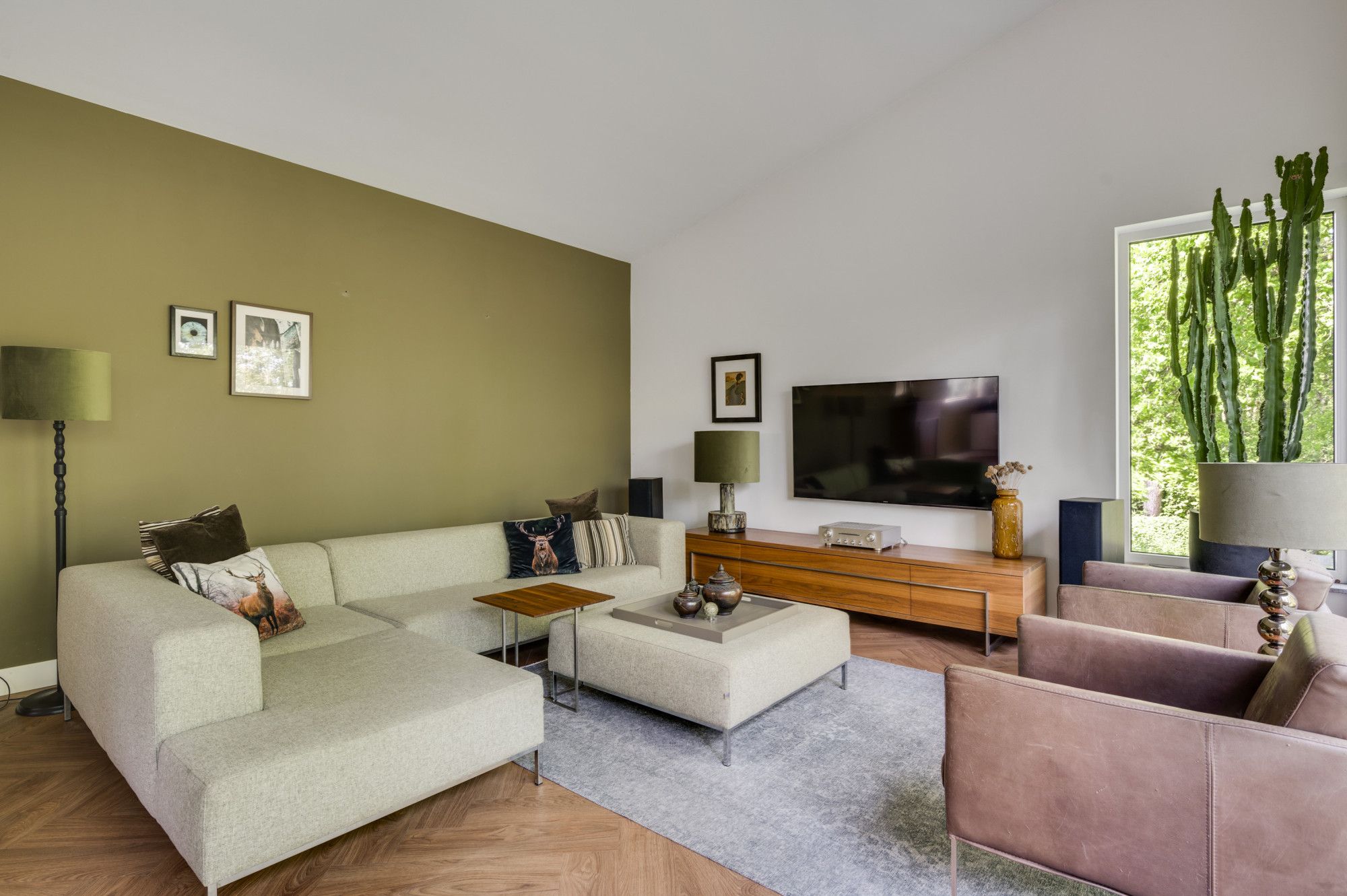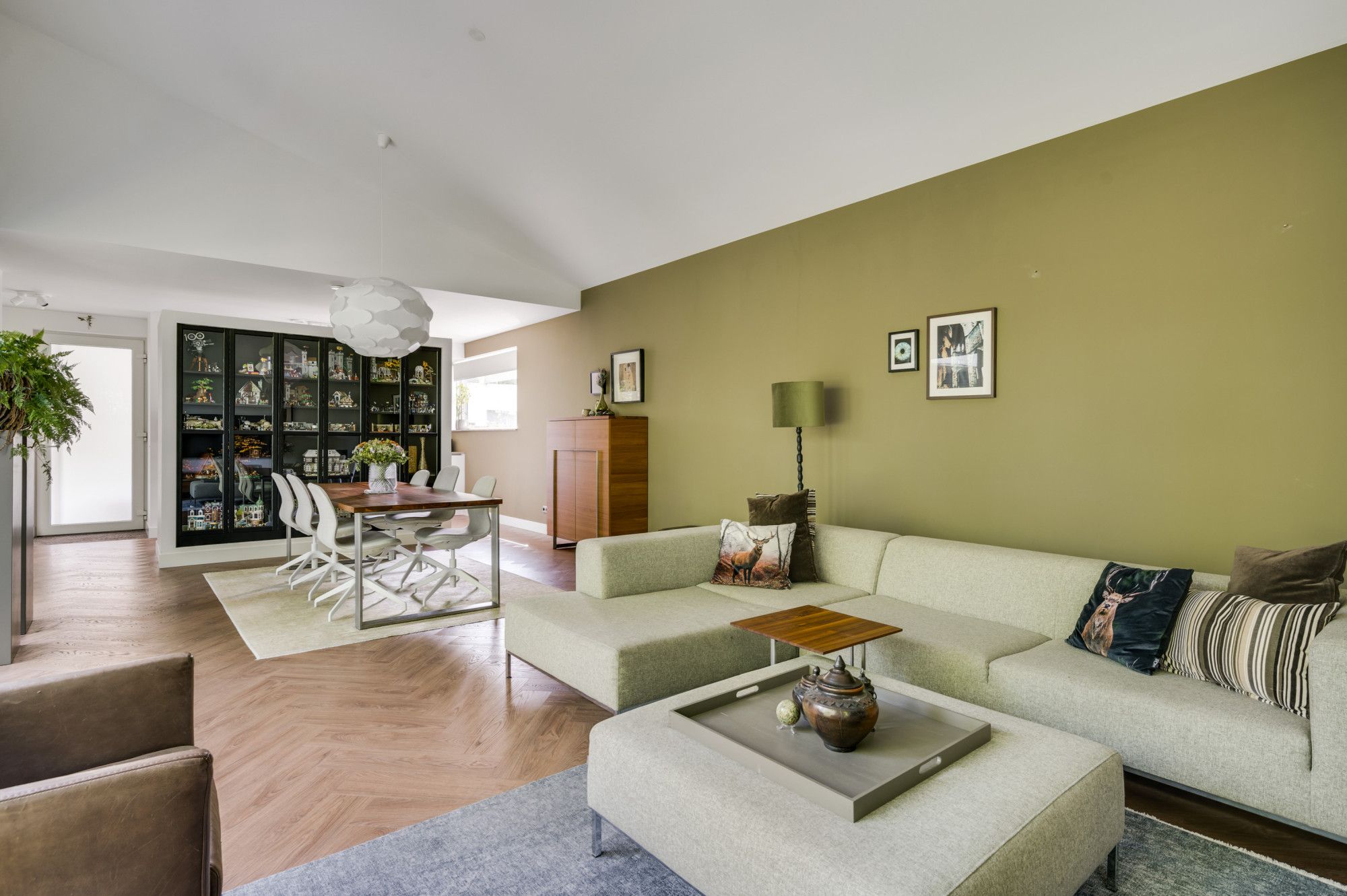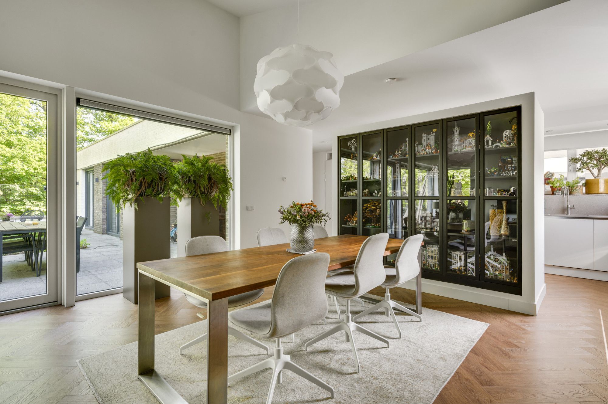 Moderne woonkamer met veel lichtinval door de grote raampartijen, het hoge lessenaarsdak geeft een extra ruimtelijke beleving en biedt plaats aan de living/lounge met multimediale aansluitingen en een royale eethoek. De vaste kastenwand functioneert als roomdivider en biedt veel opslagruimte. Dubbele openslaande tuindeuren geven direct tuincontact naar de patio-tuin met vrij uitzicht op het glooiende Limburgse landschap.