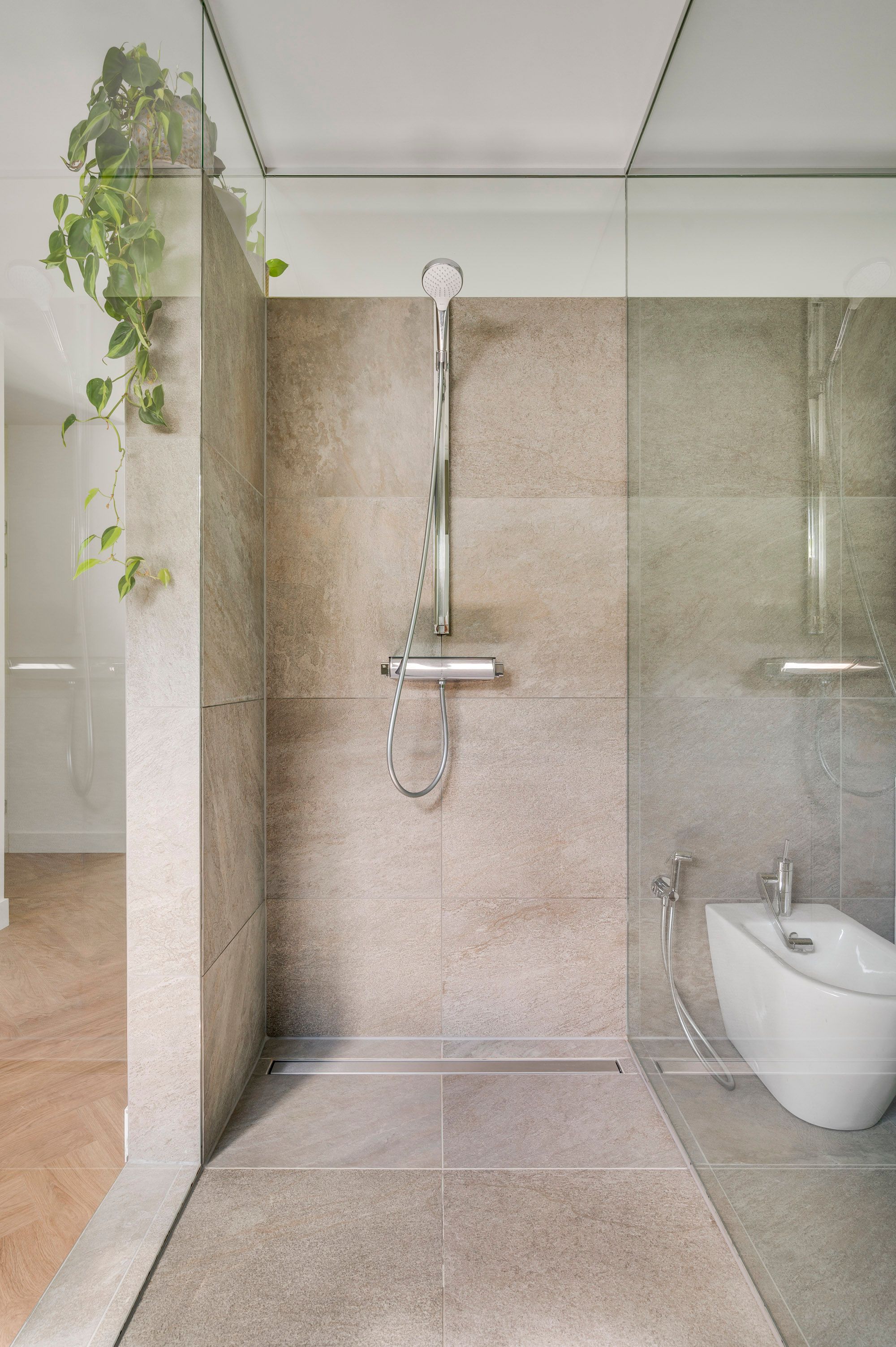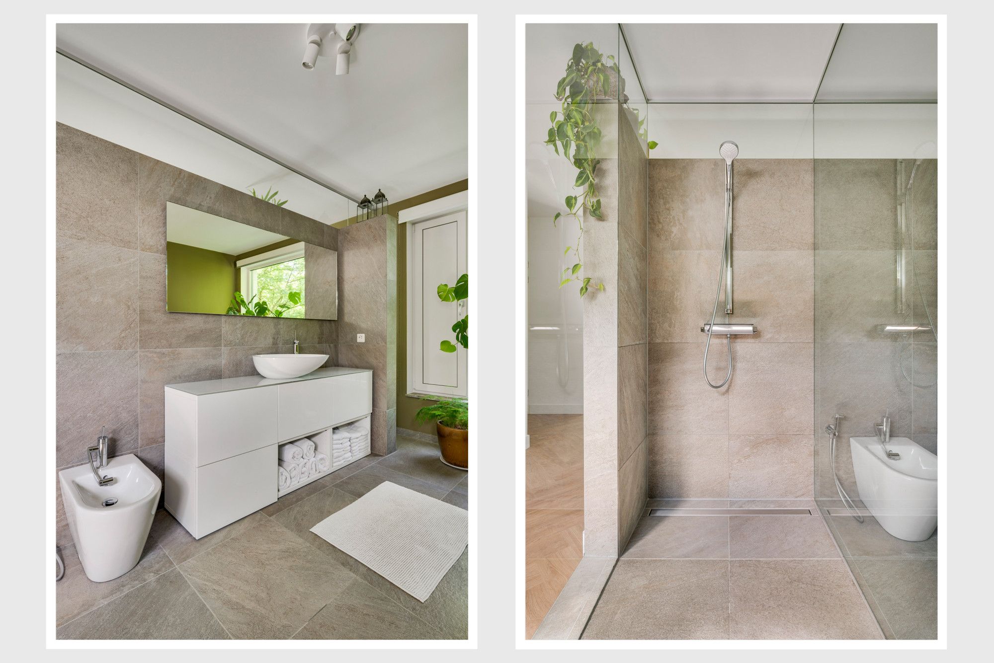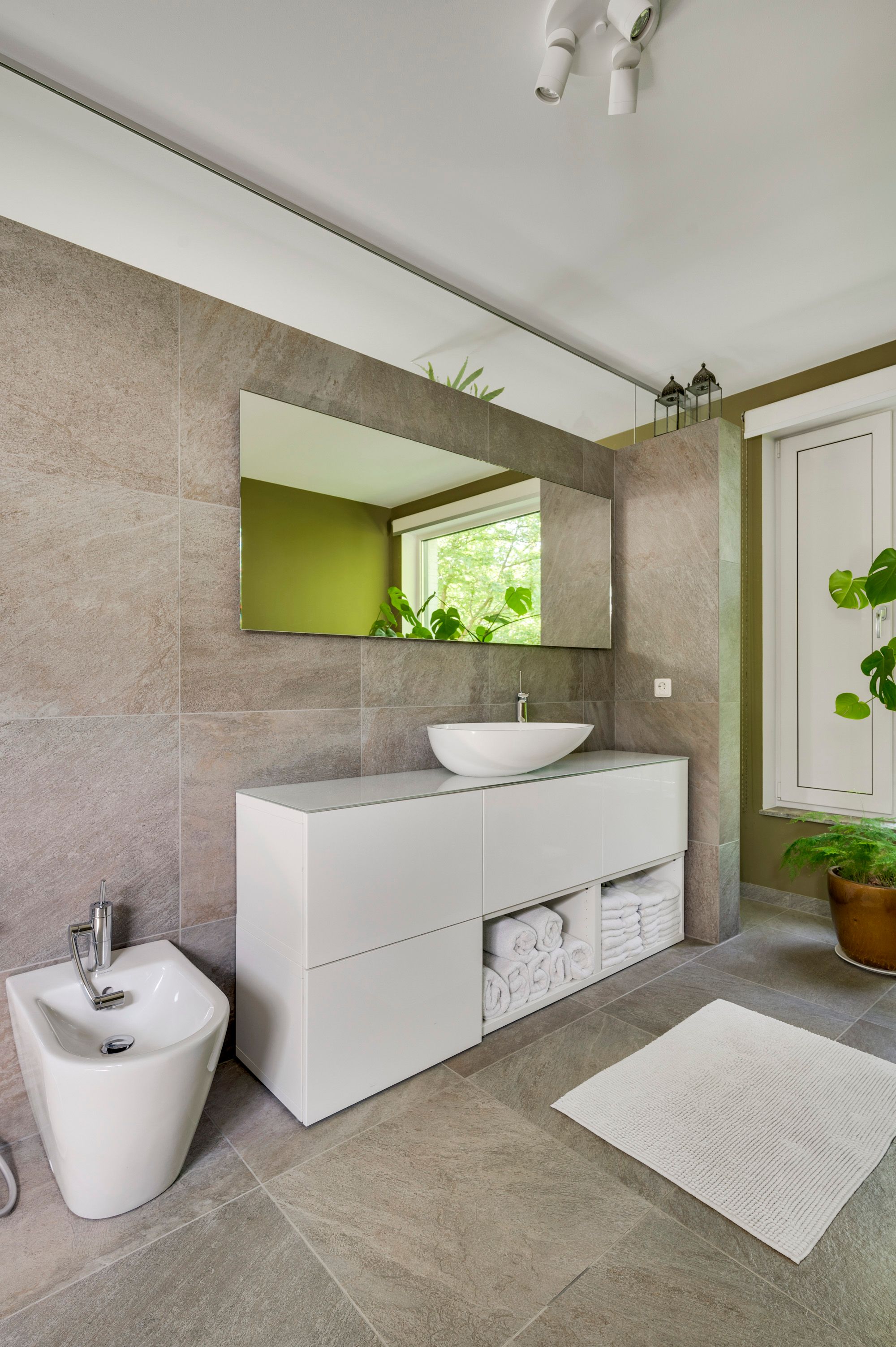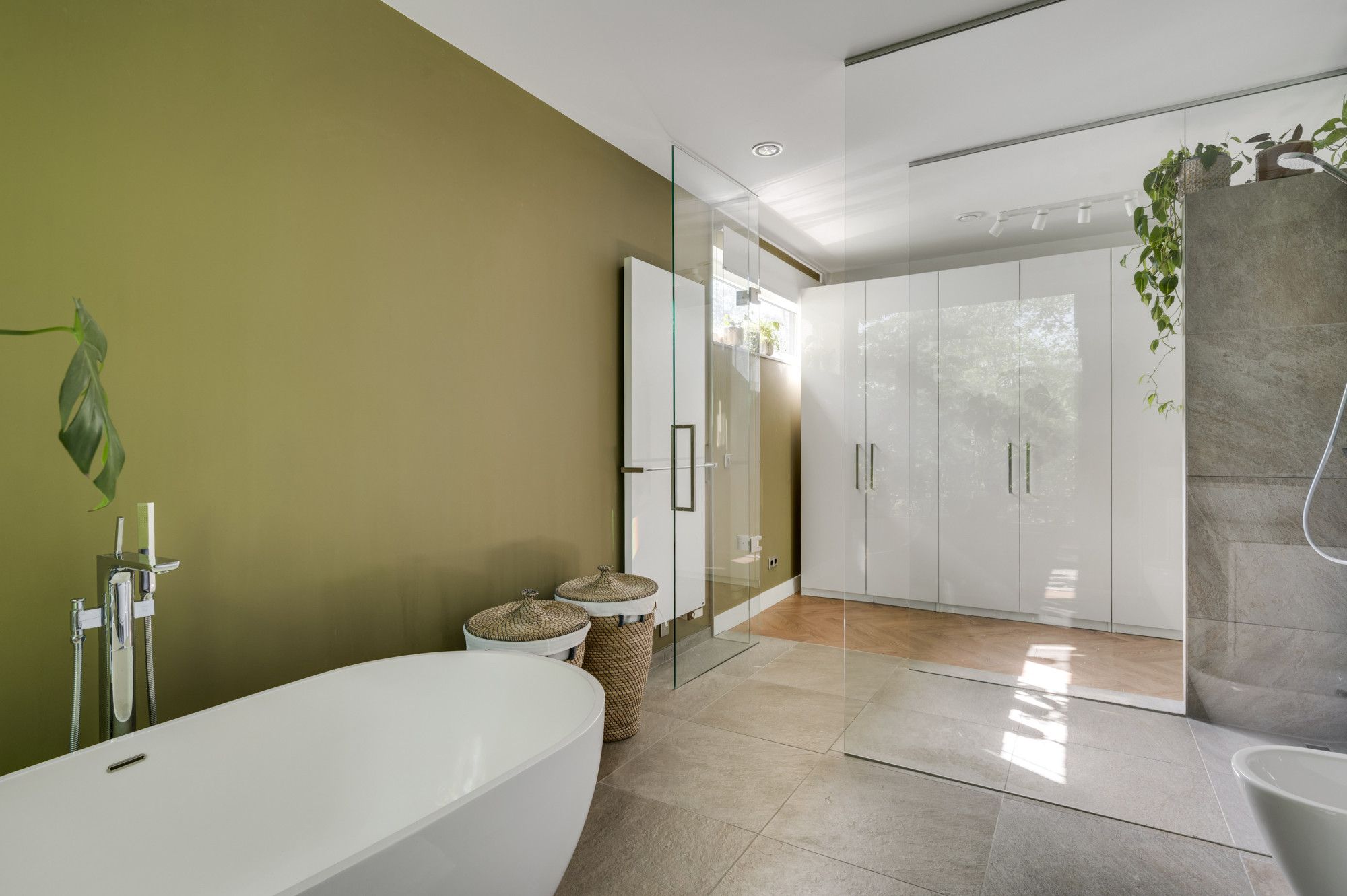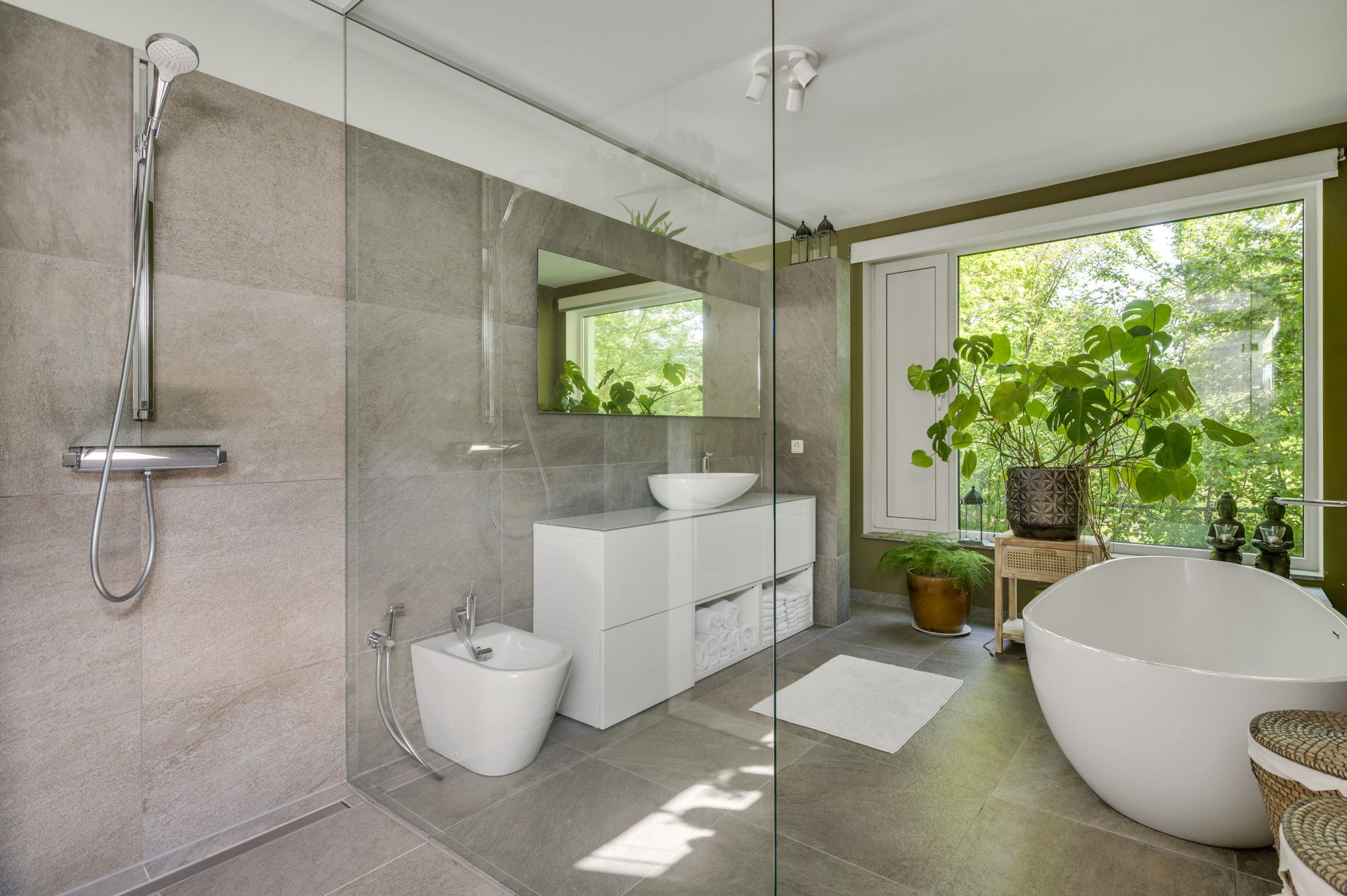 De badkamer is uitgevoerd in een tijdloos design met natuurtinten en geeft een luxe wellness beleving met een vrijstaand ligbad / waskom op een badkamermeubel / grote verwarmde spiegel / inloopdouche / bidet en vloerverwarming. De glazen scheidingswand geeft een open en ruimtelijke ervaring en middels een groot raam is er zicht op de rustgevende groene omgeving.