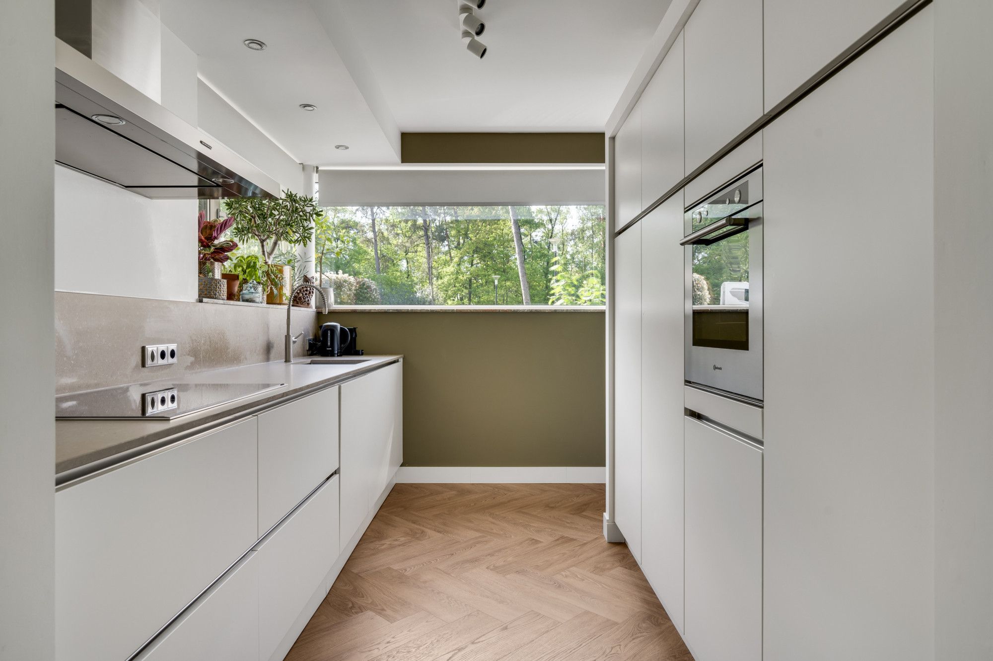 Halfopen keukenruimte voorzien van een hoogwaardige inbouwkeuken, greeploos in hoogglans wit met softclose-sluiting, voorzien van apparatuur, te weten: 4 zones inductiekookplaat / RVS wandschouw afzuigkap / grote koelkast / elektrische oven / wasbak / vaatwasmachine / composiet werkblad en veel opbergmogelijkheden.