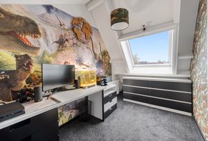 Via een vaste trap bereikt u de zolderverdieping, waar een extra slaapkamer is ingericht. Deze kamer is uitgerust met een houten Velux-dakraam met dubbel glas en elektrisch rolluik. Hier bevindt zich ook de aansluiting voor de wasmachine.