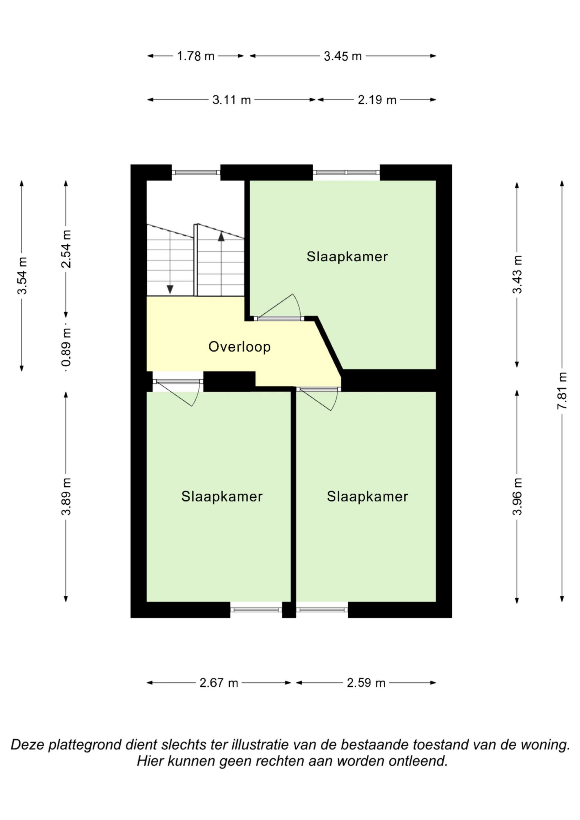 Vanuit de overloop heeft men toegang tot 3 slaapkamers. Slaapkamer I (3,89 m x 2,67 m) en slaapkamer II (3,96 m x 2,59 m) zijn beide aan de voorkant gelegen. Slaapkamer III (3,45 m x 3,43 m) is aan de achterzijde gelegen.