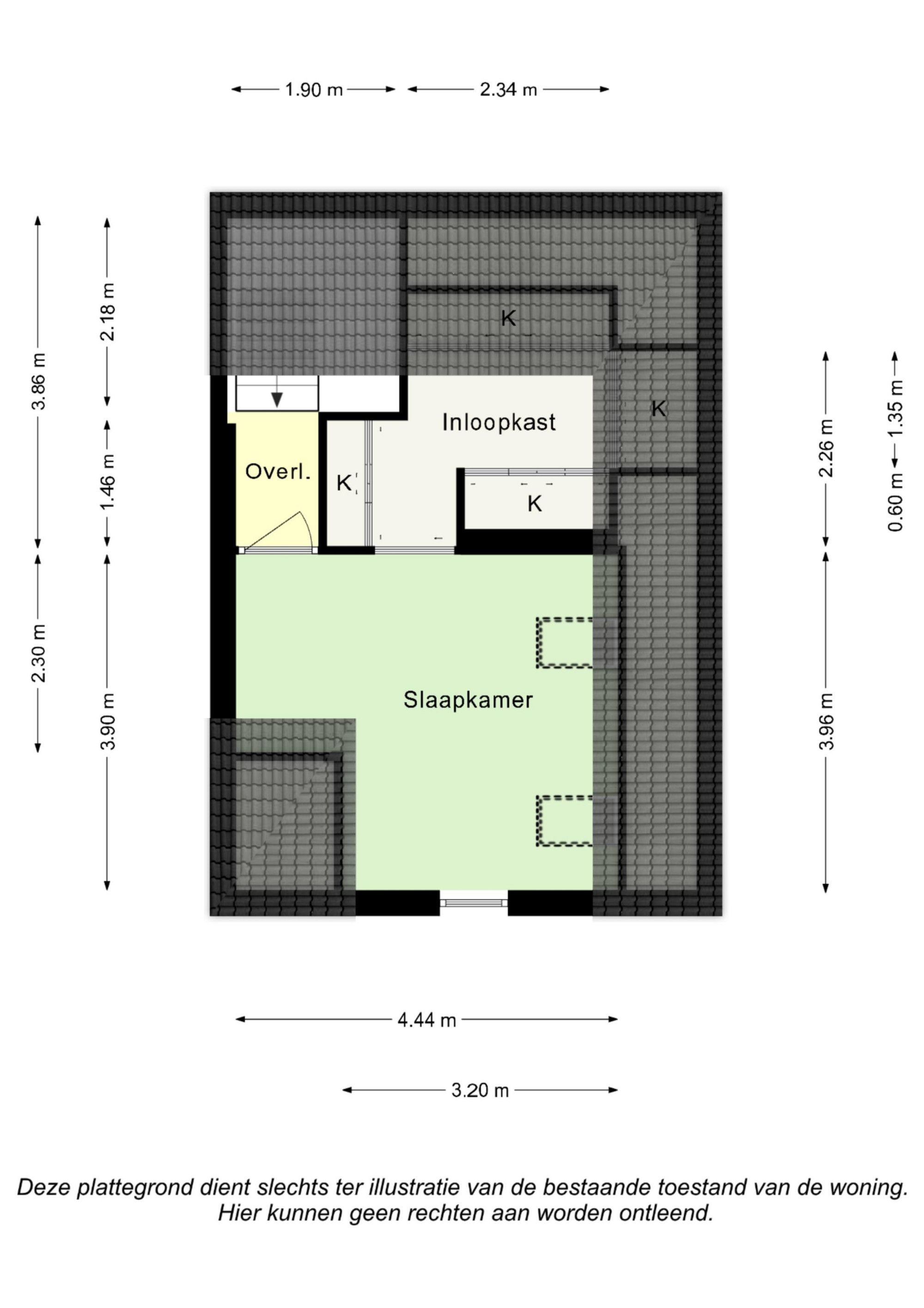 Vanuit de overloop bereikt men slaapkamer VI (4,44 m/ 3,20 m x 3,90 m) v.v. eigen inloopkast.