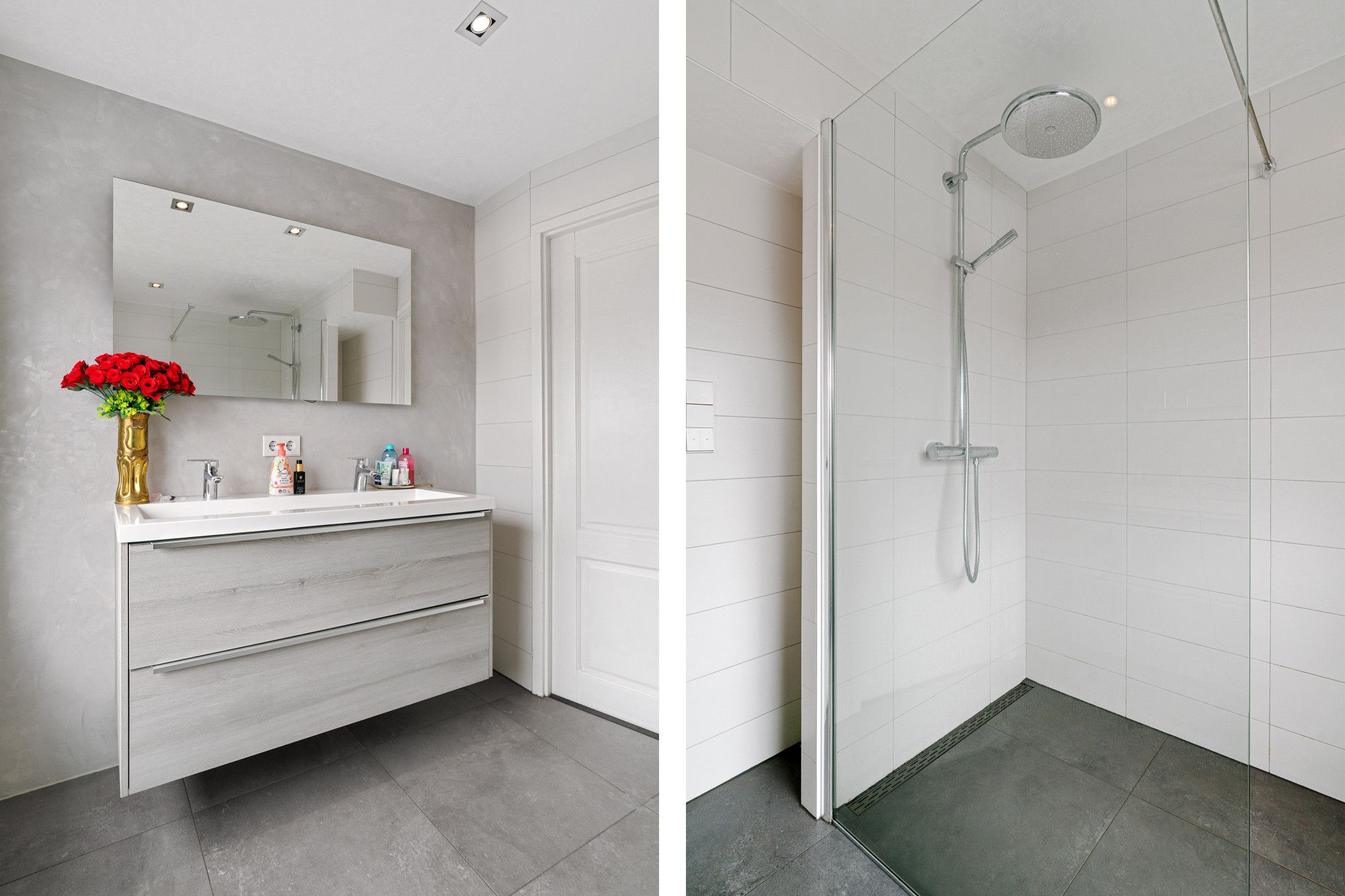 Op de eerste verdieping bevinden zich twee slaapkamers en een overloop met handige inloopkast/werkruimte. De hoofdslaapkamer aan de achterzijde is voorzien van airconditioning. De badkamer is modern, strak afgewerkt en ingericht met een royale inloopdouche en een breed wastafelmeubel met dubbele kraan.