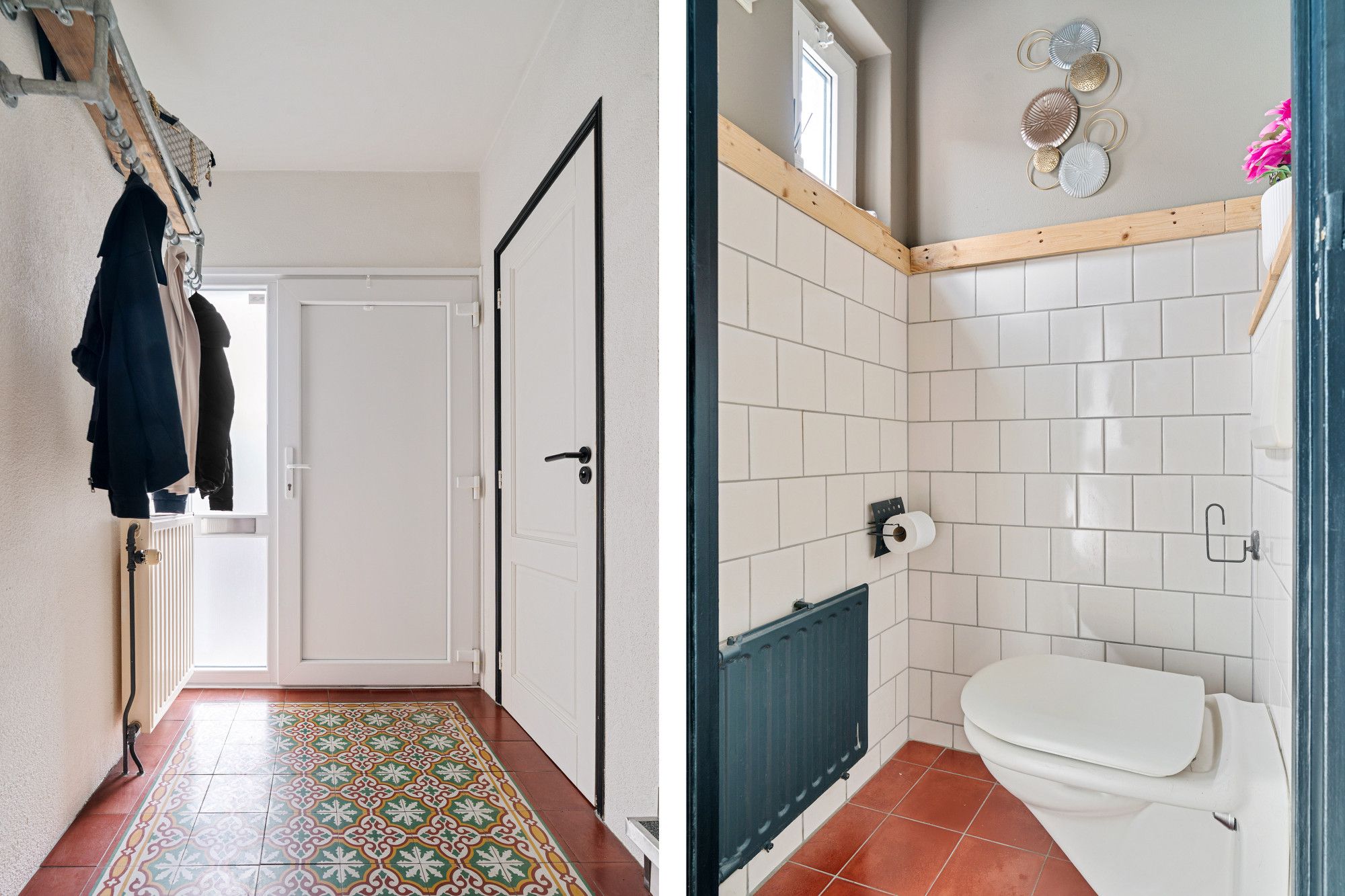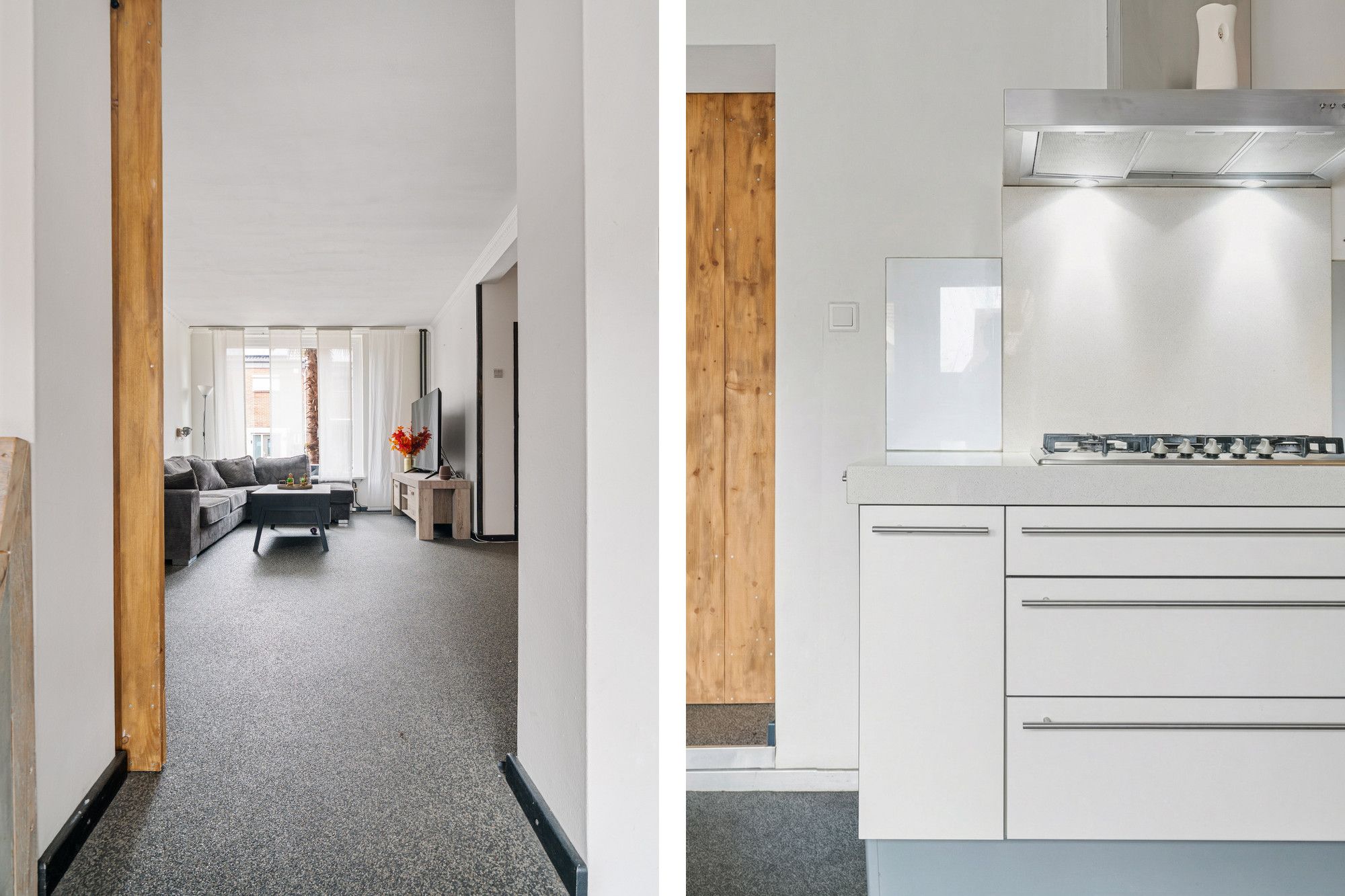 Via de entreehal met moderne toiletruimte en trapopgang betreedt u de begane grond. De lichte woonkamer voelt direct prettig aan en vormt een fijne leefruimte voor het hele gezin. De pelletkachel zorgt hier voor extra sfeer en comfort. Aan de achterzijde is de woning uitgebouwd, waardoor een ruime woonkeuken is ontstaan. De moderne L-vormige keuken met witte frontjes is compleet uitgerust met een 5-pits gaskookplaat, afzuigkap, vaatwasser, koelkast en combi-oven. Vanuit de keuken bereikt u de praktische bijkeuken met aansluitingen voor wasmachine en droger.