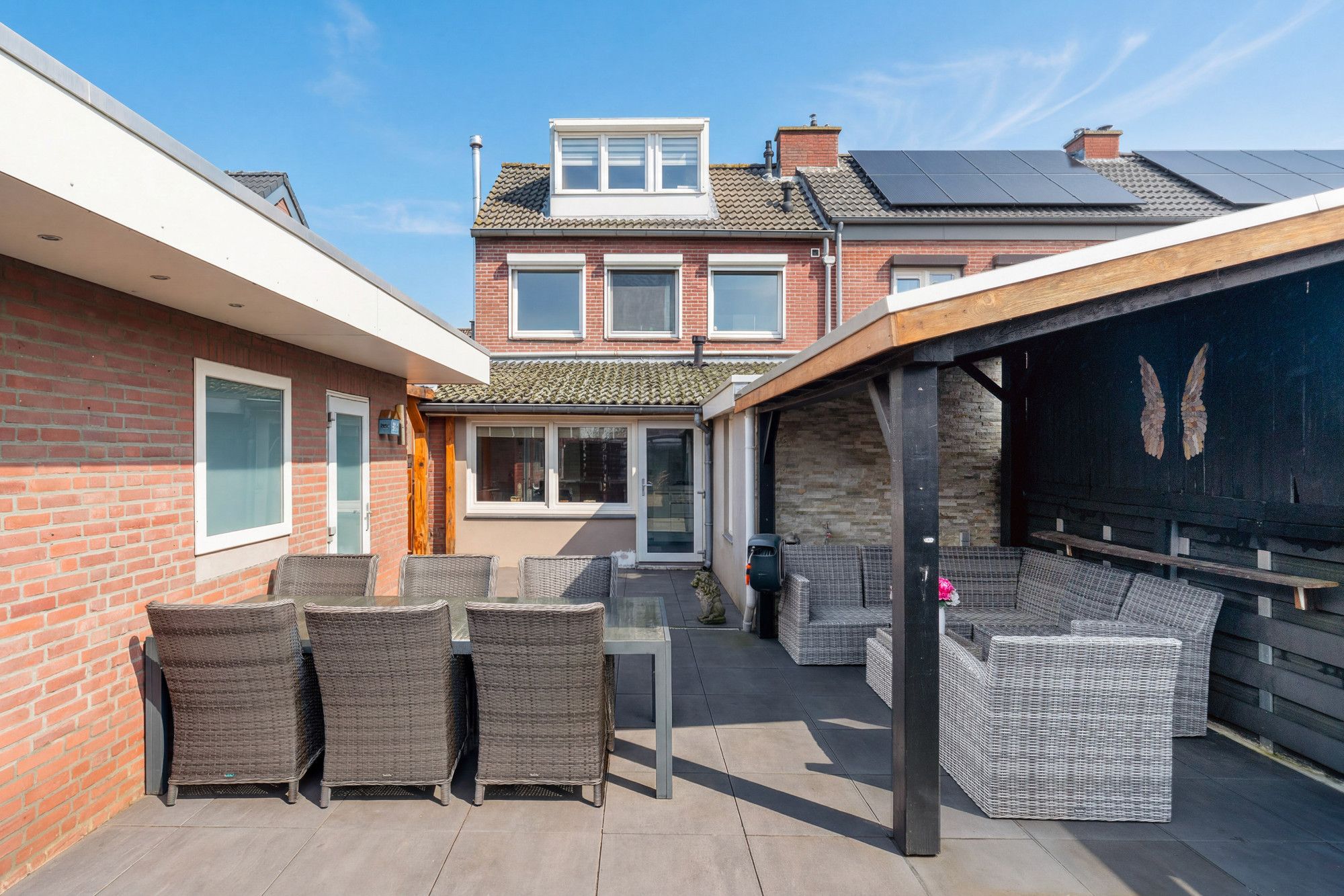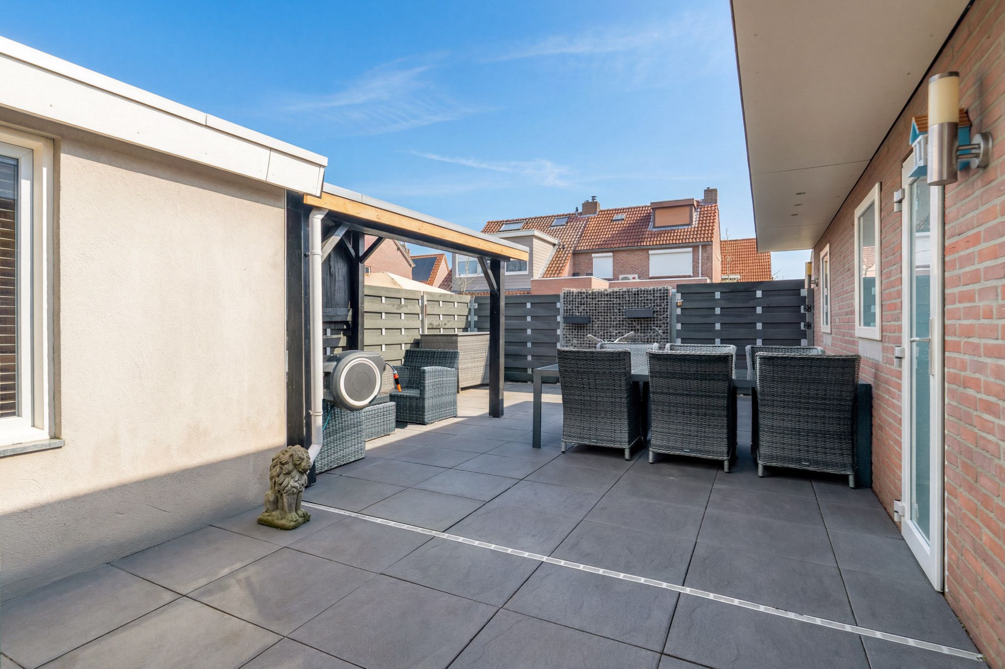 De strak aangelegde achtertuin is gunstig gelegen op het westen, waardoor u volop kunt genieten van de middag- en avondzon. Onder de sfeervolle terrasoverkapping is het heerlijk ontspannen, borrelen of lang tafelen met familie en vrienden. De tuin is tevens via een zijingang bereikbaar.