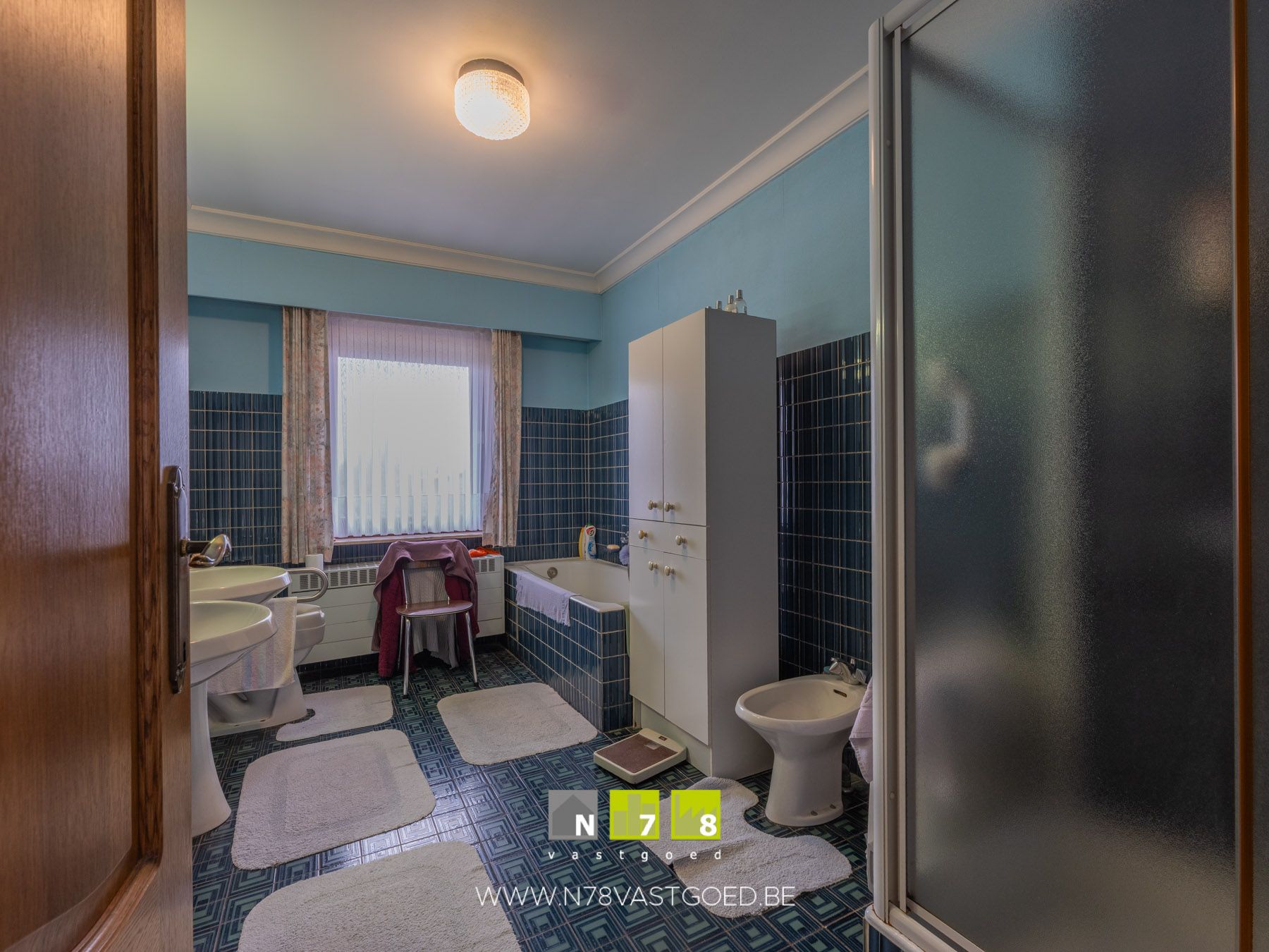- Badkamer (4,00m x 2,50m = 10,00m²): dubbele lavabo, bidet, douche, ligbad, zittoilet, wandbetegeling, tegelvloer.