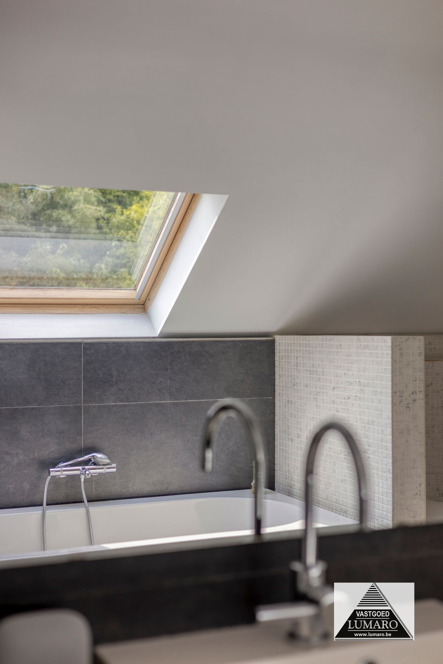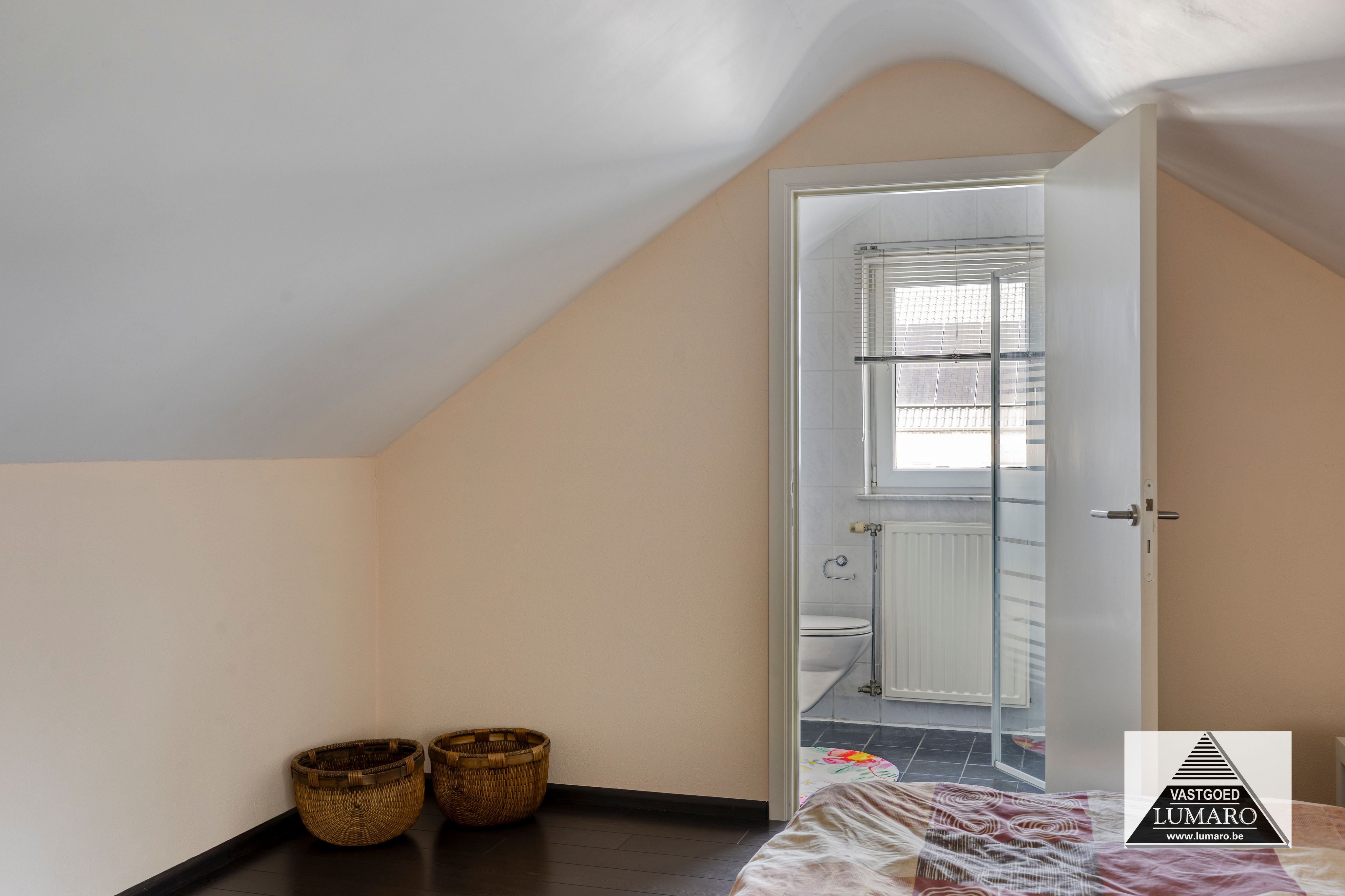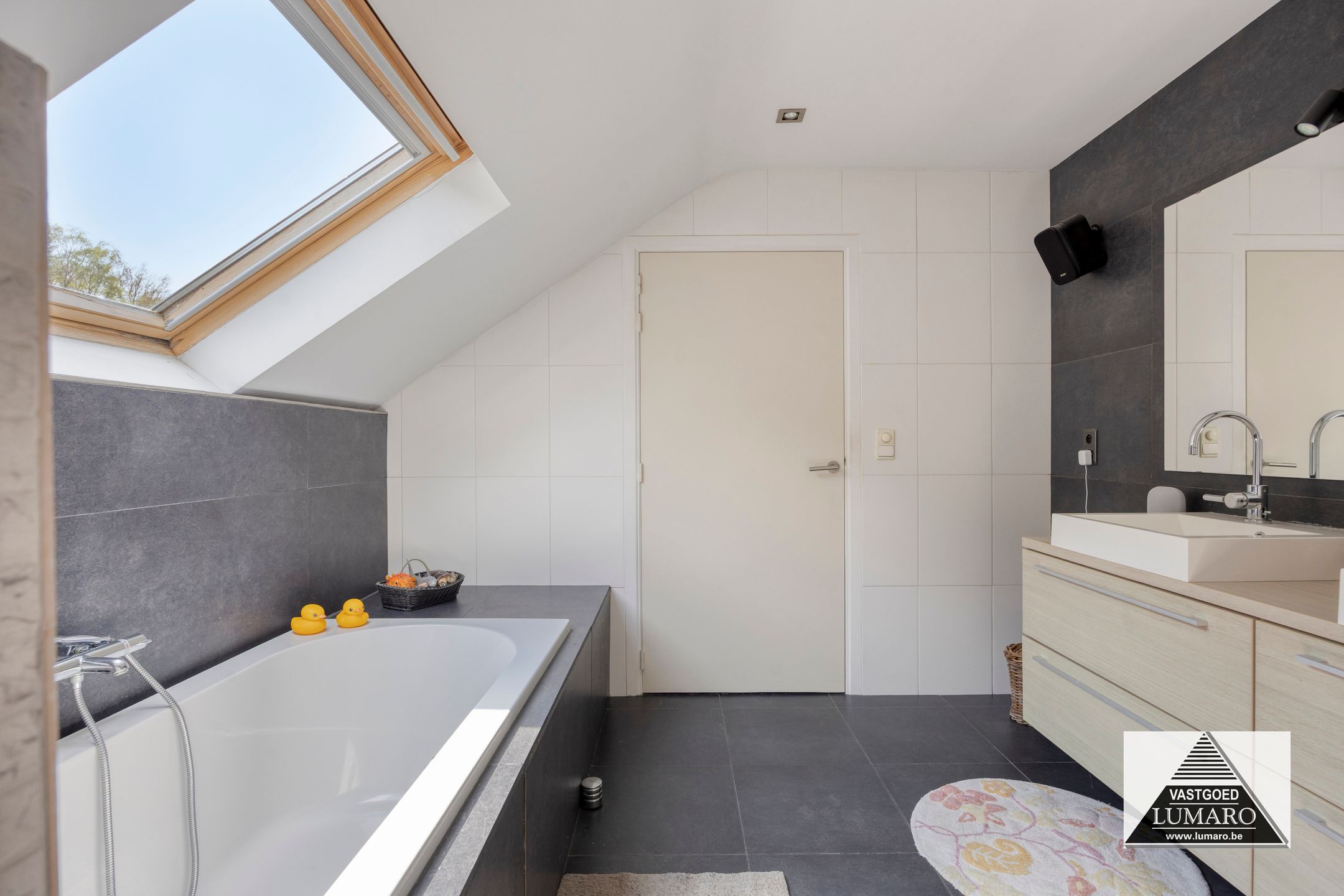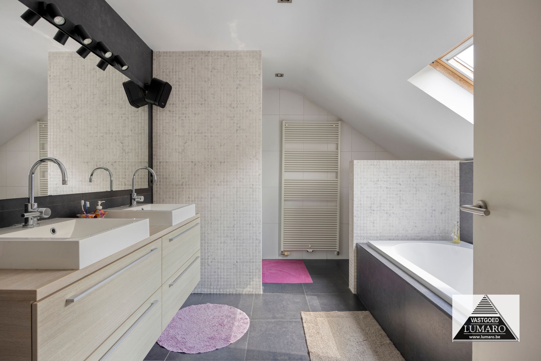 - Badkamer 1: (3,80 m x 3,12 m = 11,86 m²) – tegelvloer – rechtstreeks toegankelijk vanuit de masterbedroom – badkamer (veluxraam), gelegen aan de tuinkant – verzorgd ingericht met ligbad – douche met thermostatische kraan en jets (Grohe) – breed badmeubel : 2 spoeltafels, eengreepsmengkranen, laden in onderkast, brede spiegel – plafond met inbouwspots – toilet – handdoekradiator (met eigen thermostaat) – volledige muurbetegeling.