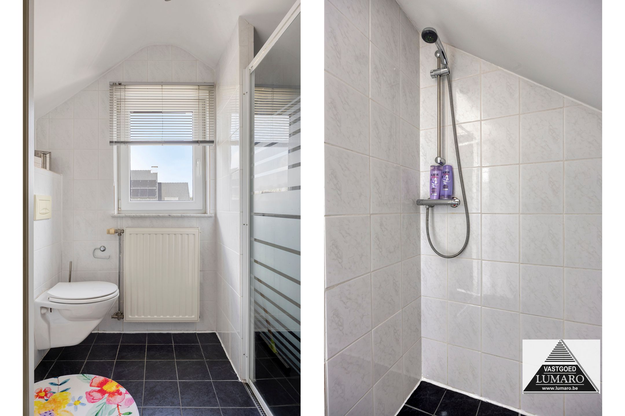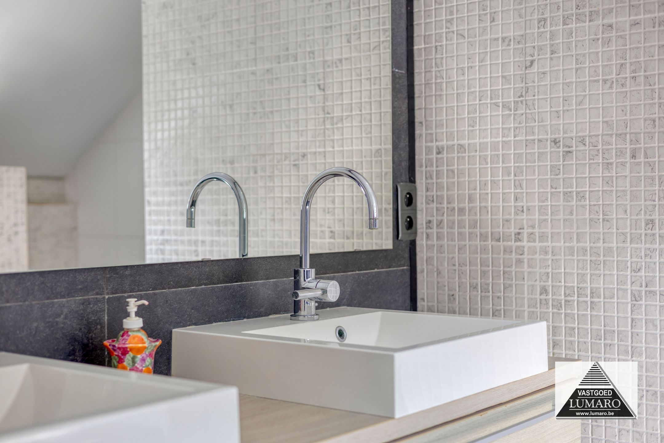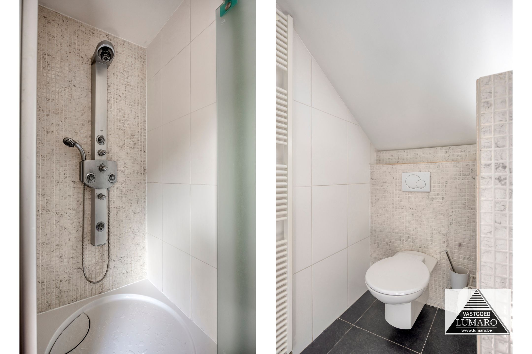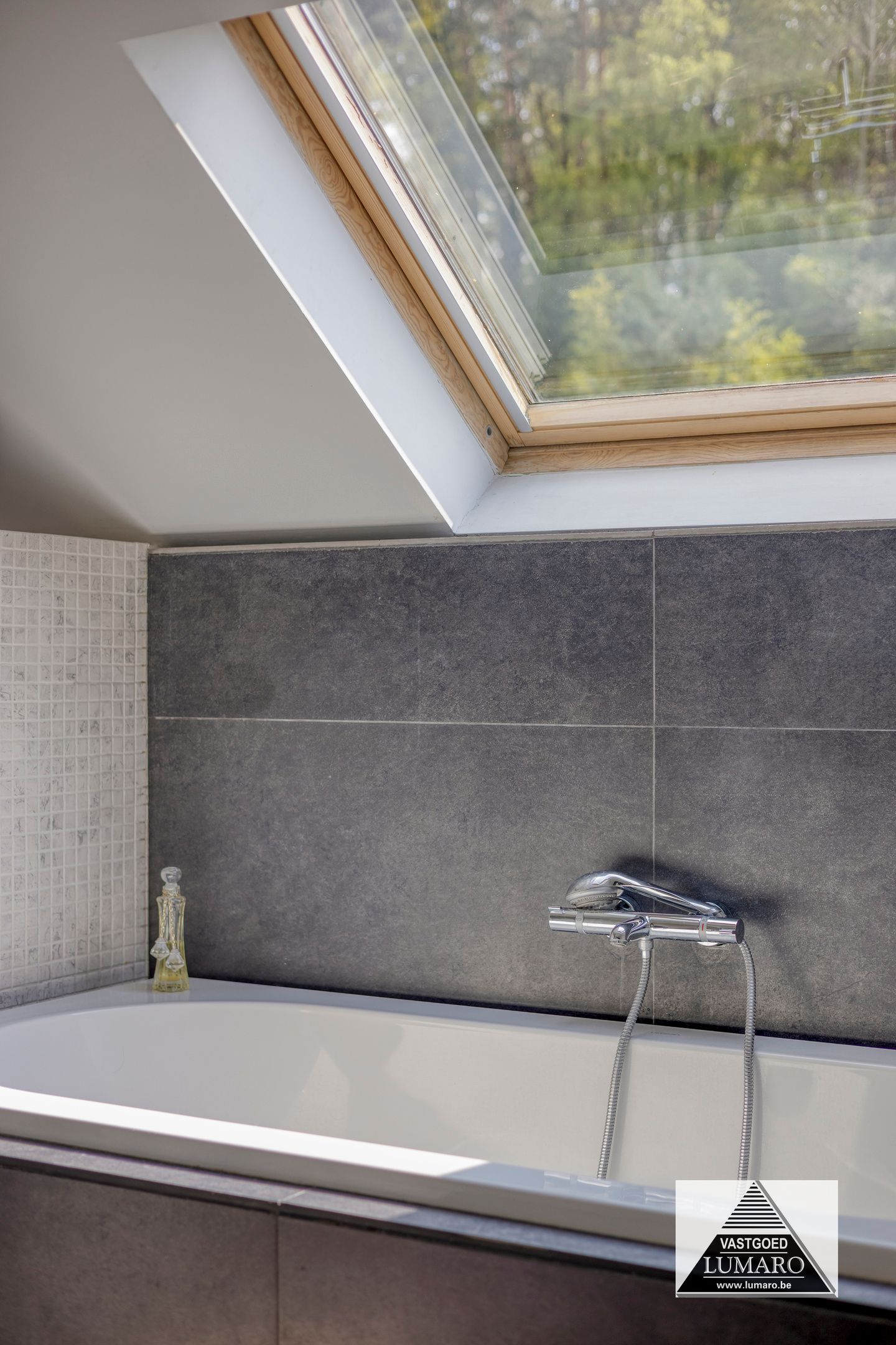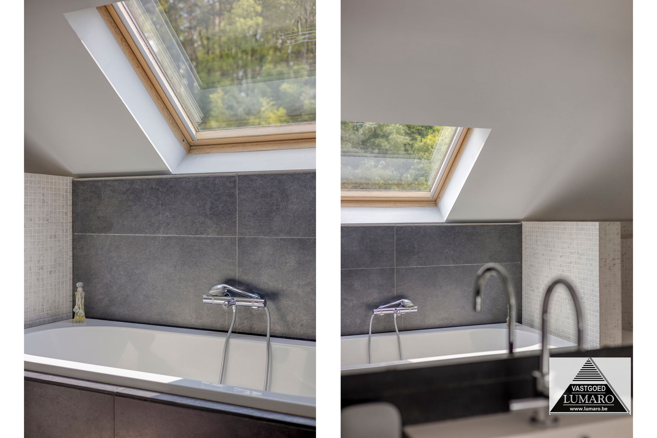 - Badkamer 1: (3,80 m x 3,12 m = 11,86 m²) – tegelvloer – rechtstreeks toegankelijk vanuit de masterbedroom – badkamer (veluxraam), gelegen aan de tuinkant – verzorgd ingericht met ligbad – douche met thermostatische kraan en jets (Grohe) – breed badmeubel : 2 spoeltafels, eengreepsmengkranen, laden in onderkast, brede spiegel – plafond met inbouwspots – toilet – handdoekradiator (met eigen thermostaat) – volledige muurbetegeling.
