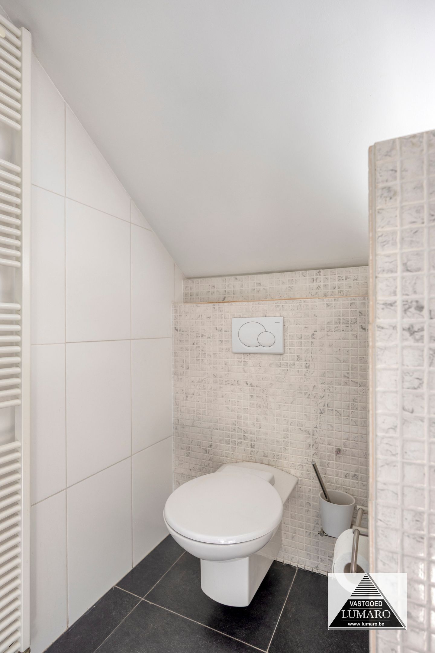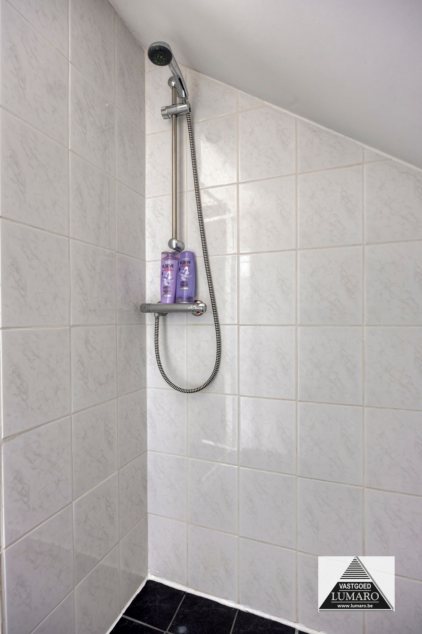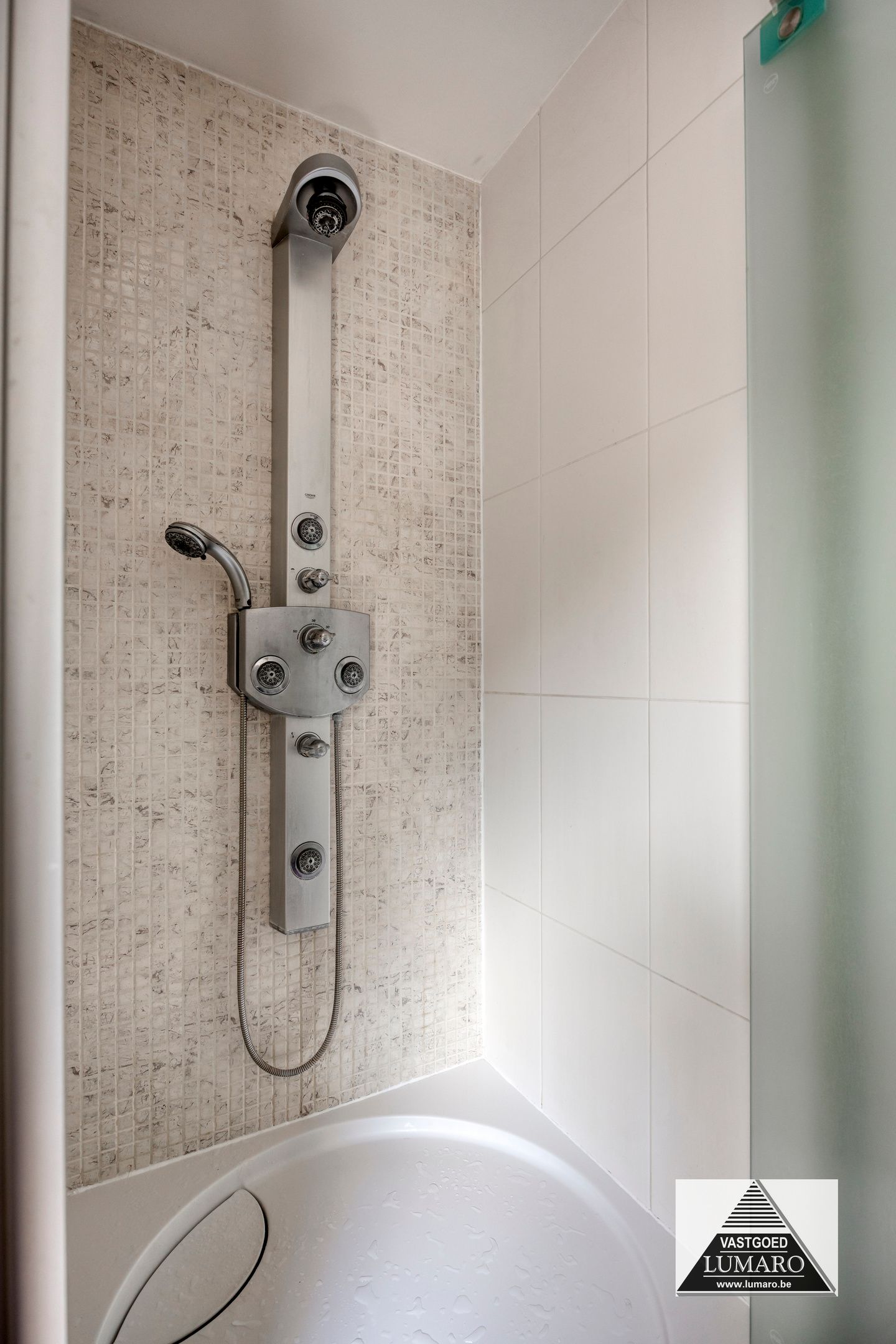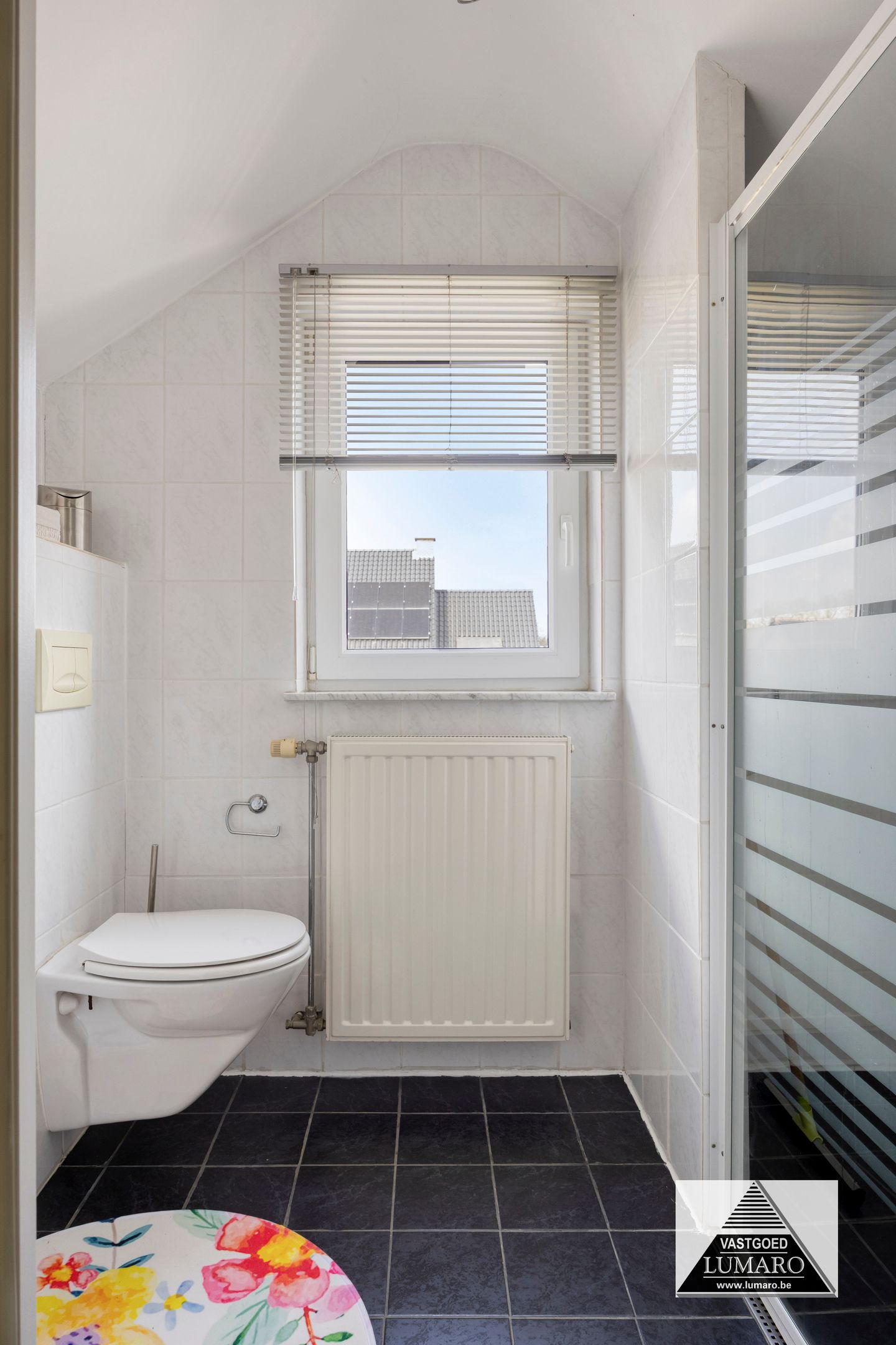 - Badkamer 1: (3,80 m x 3,12 m = 11,86 m²) – tegelvloer – rechtstreeks toegankelijk vanuit de masterbedroom – badkamer (veluxraam), gelegen aan de tuinkant – verzorgd ingericht met ligbad – douche met thermostatische kraan en jets (Grohe) – breed badmeubel : 2 spoeltafels, eengreepsmengkranen, laden in onderkast, brede spiegel – plafond met inbouwspots – toilet – handdoekradiator (met eigen thermostaat) – volledige muurbetegeling.