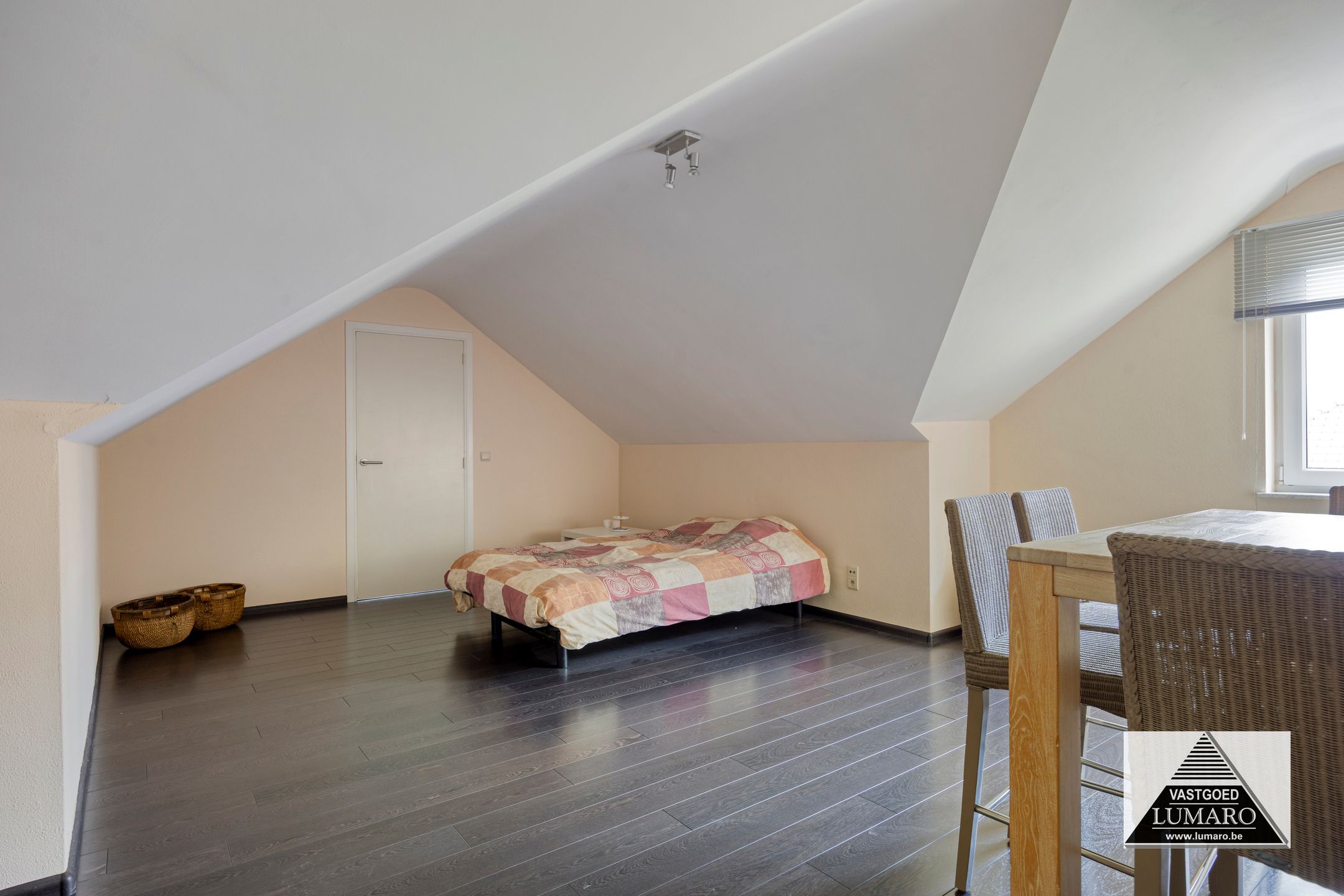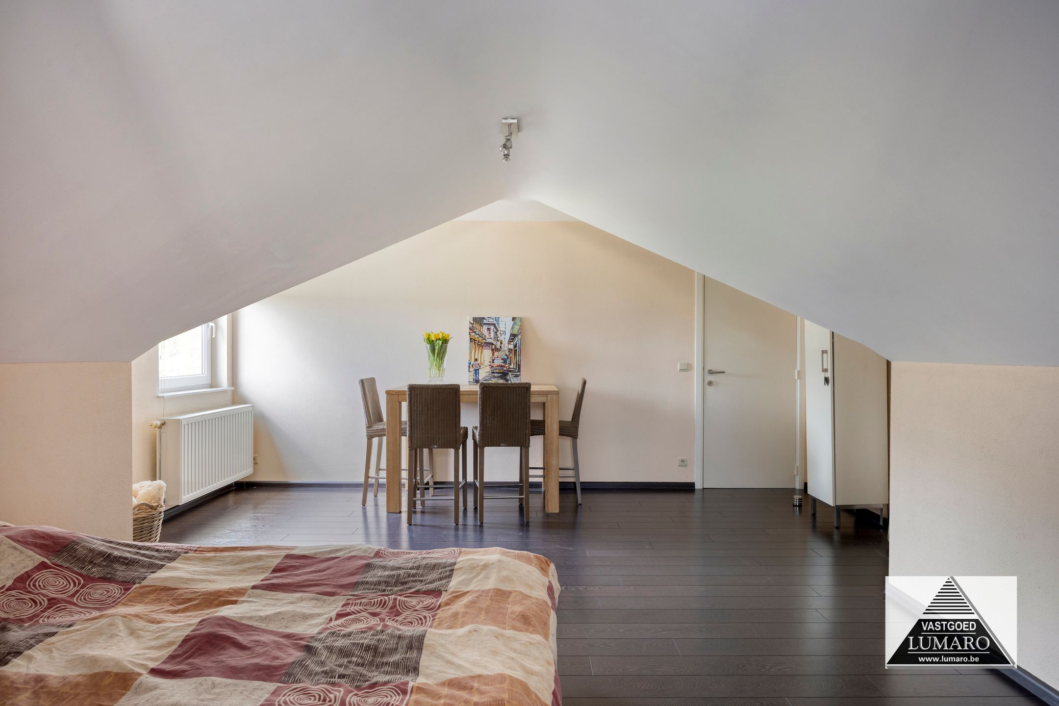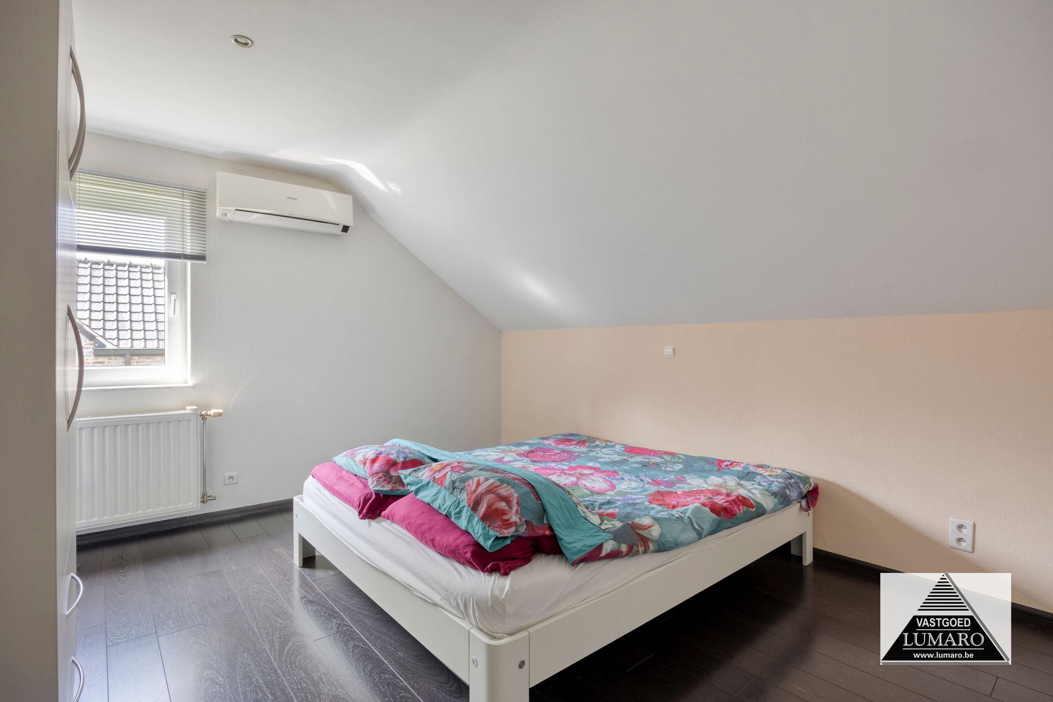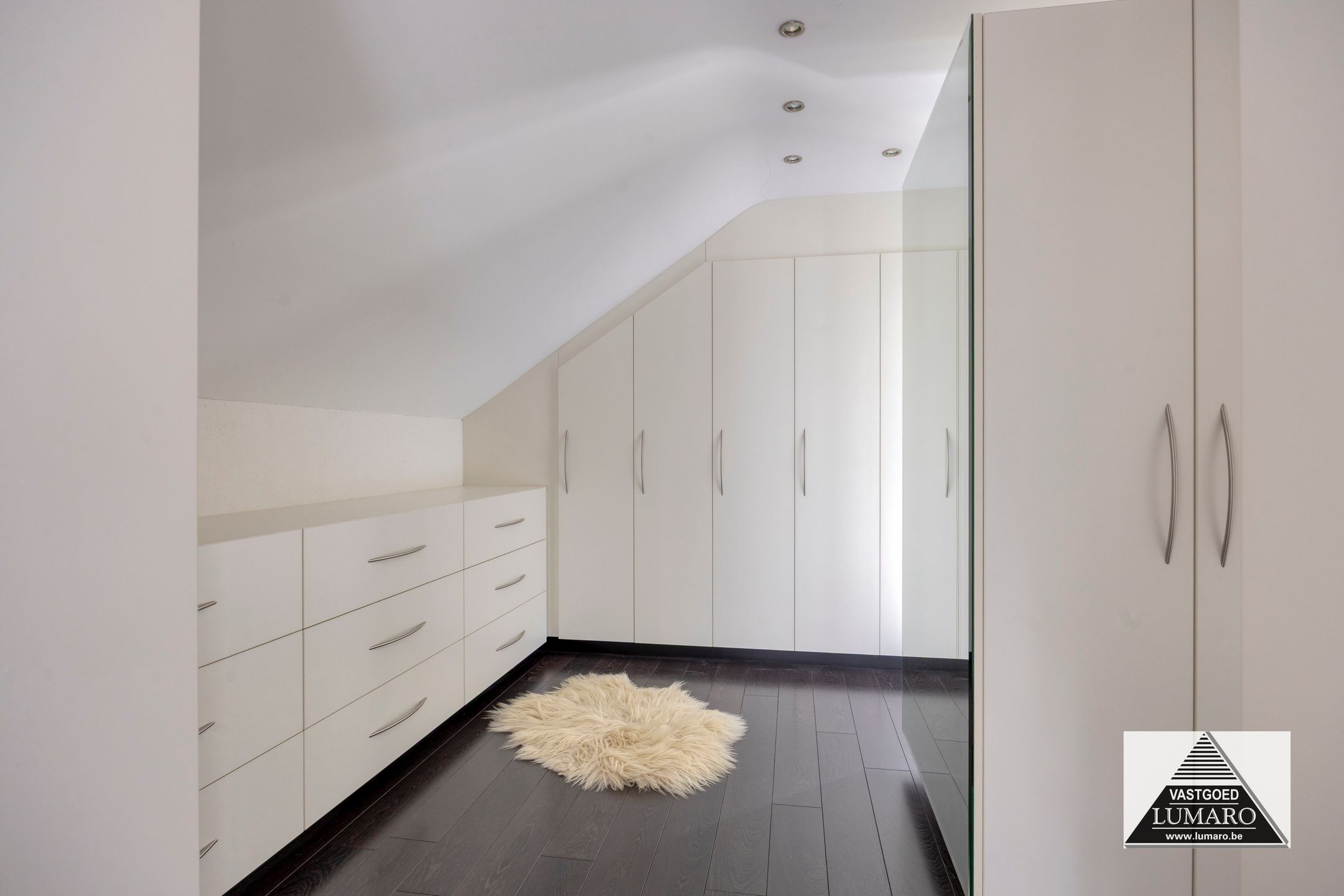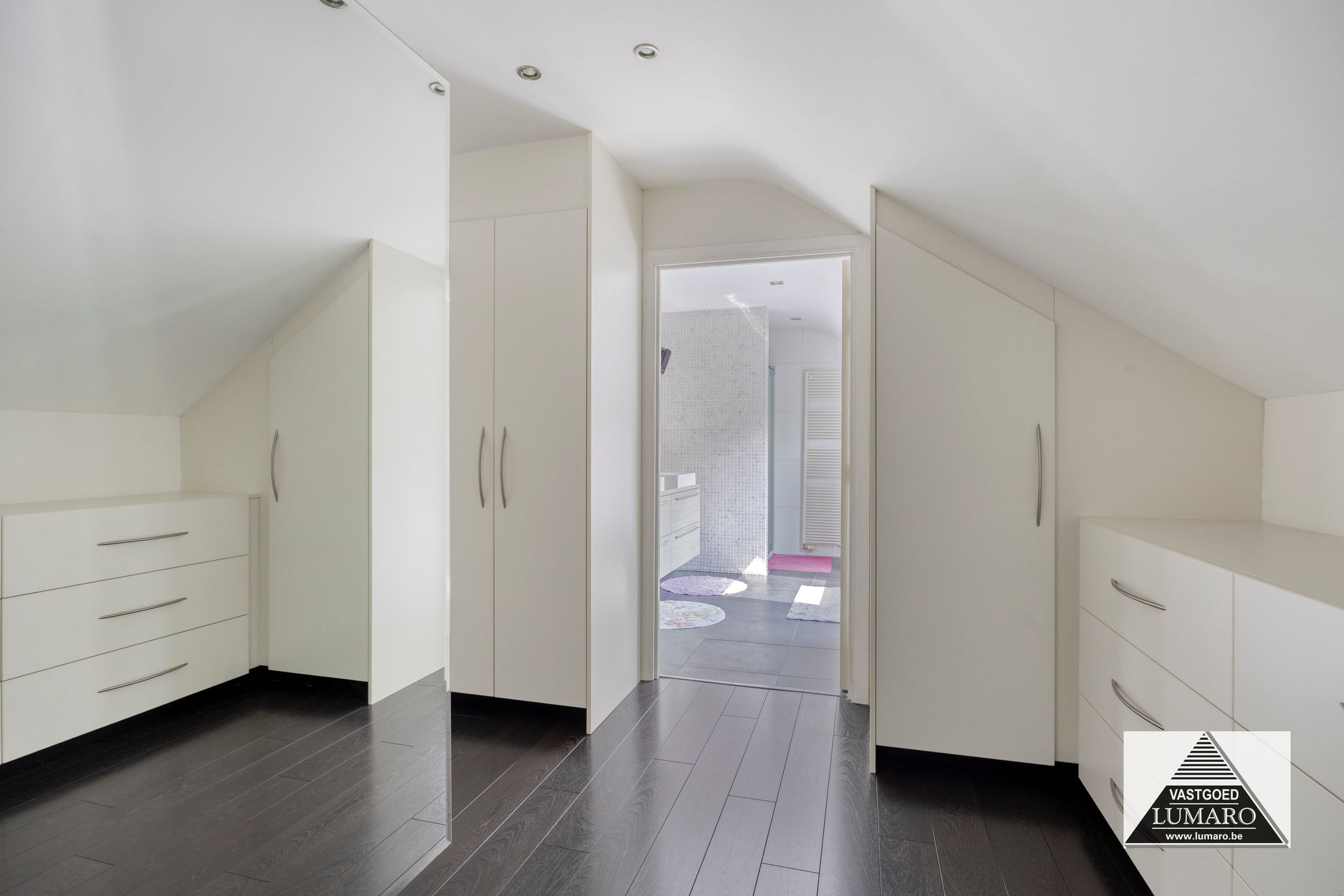- Slaapkamer 1: (4,05 m x 7,22 m = 29,24 m²) – degelijke laminaat in donkere tint – masterbedroom met door binnenhuisarchitect ontworpen ingerichte dressing – deze dressing bestaat uit kasten, laden en tv-kast die richting bed gericht is – de kastenblok in het midden van de ruimte werd niet tot tegen het plafond gemaakt, waardoor het ruimtelijke van de kamer blijft behouden! – airco (merk Panasonic) – plafond met inbouwverlichting, afzonderlijk te schakelen in slaapruimte en dressing.
