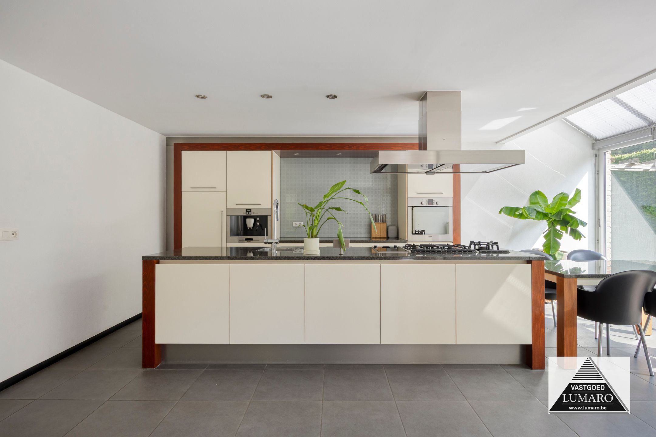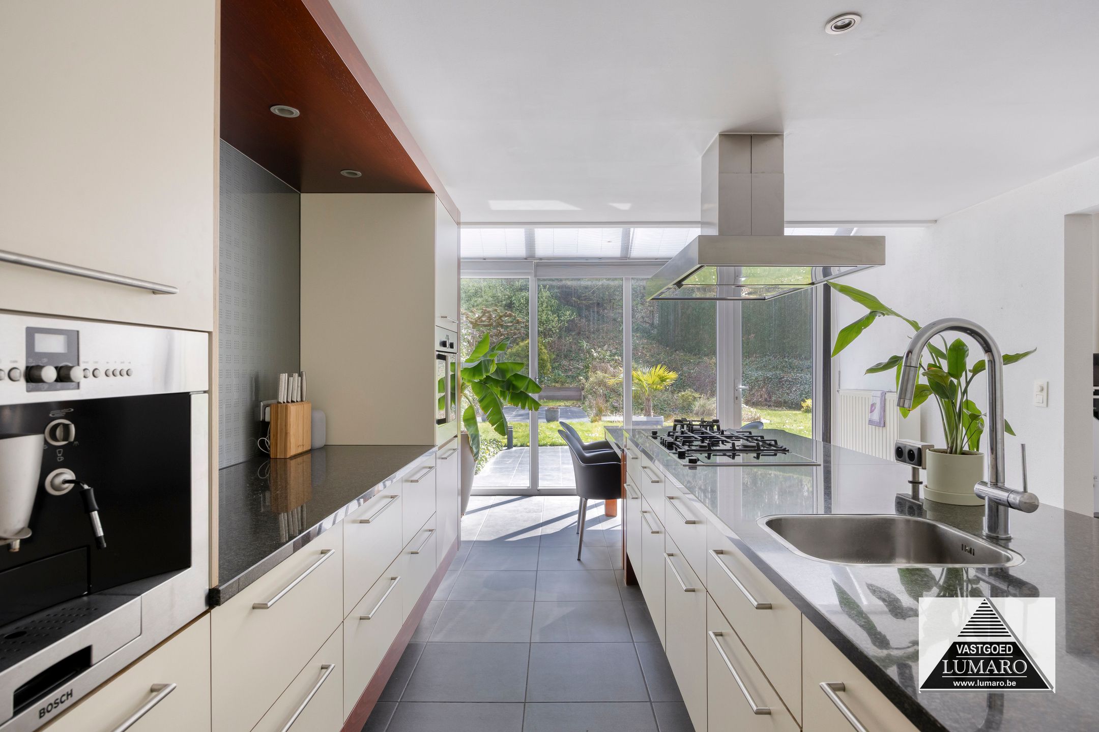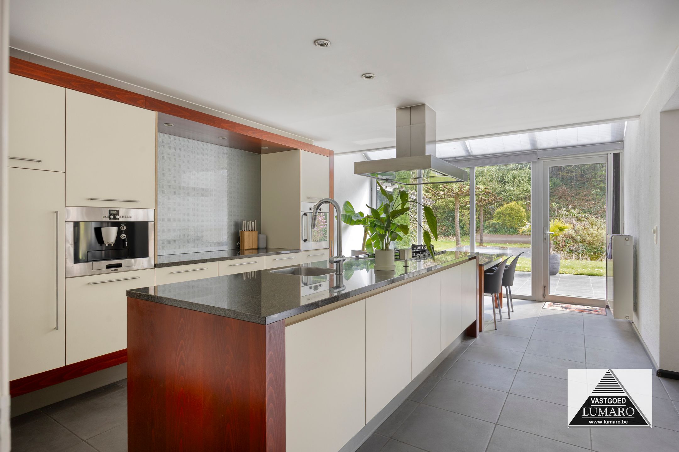 - Keuken : (4,00 m x 6,20 m = 24,80m²) – goed ingerichte keuken met groot spoel- en kookeiland – ruim werkblad – plafond met ingebouwde spots - verplaatsbare eettafel horend bij de keuken – granieten werkblad – onderbouw spoelbak met eengreepsmengkraan – 4-pits gasfornuis – wokpit – grillplaat – inox dampkap (boven fornuis, wok, grill) – ingebouwd koffie-apparaat – combi-oven – vaatwasmachine – ingebouwde koelkast - toestellen merk Bosch – veel kastruimte! – ook de volledige wand van het eiland dat naar de woonkamer uitkijkt is van kasten voorzien – aan de keuken is een mooie glas-erker uitgebouwd met zicht naar terras, tuin en de erachter gelegen bomen.