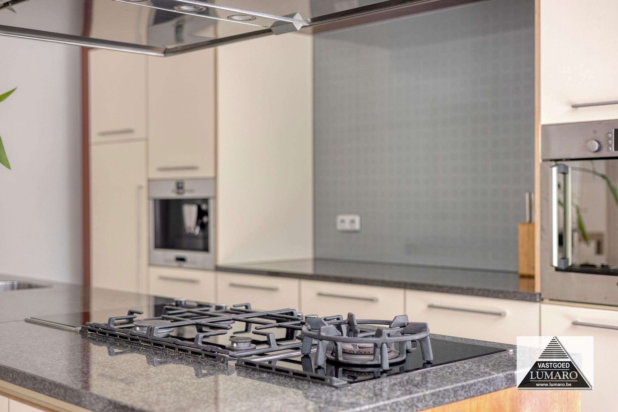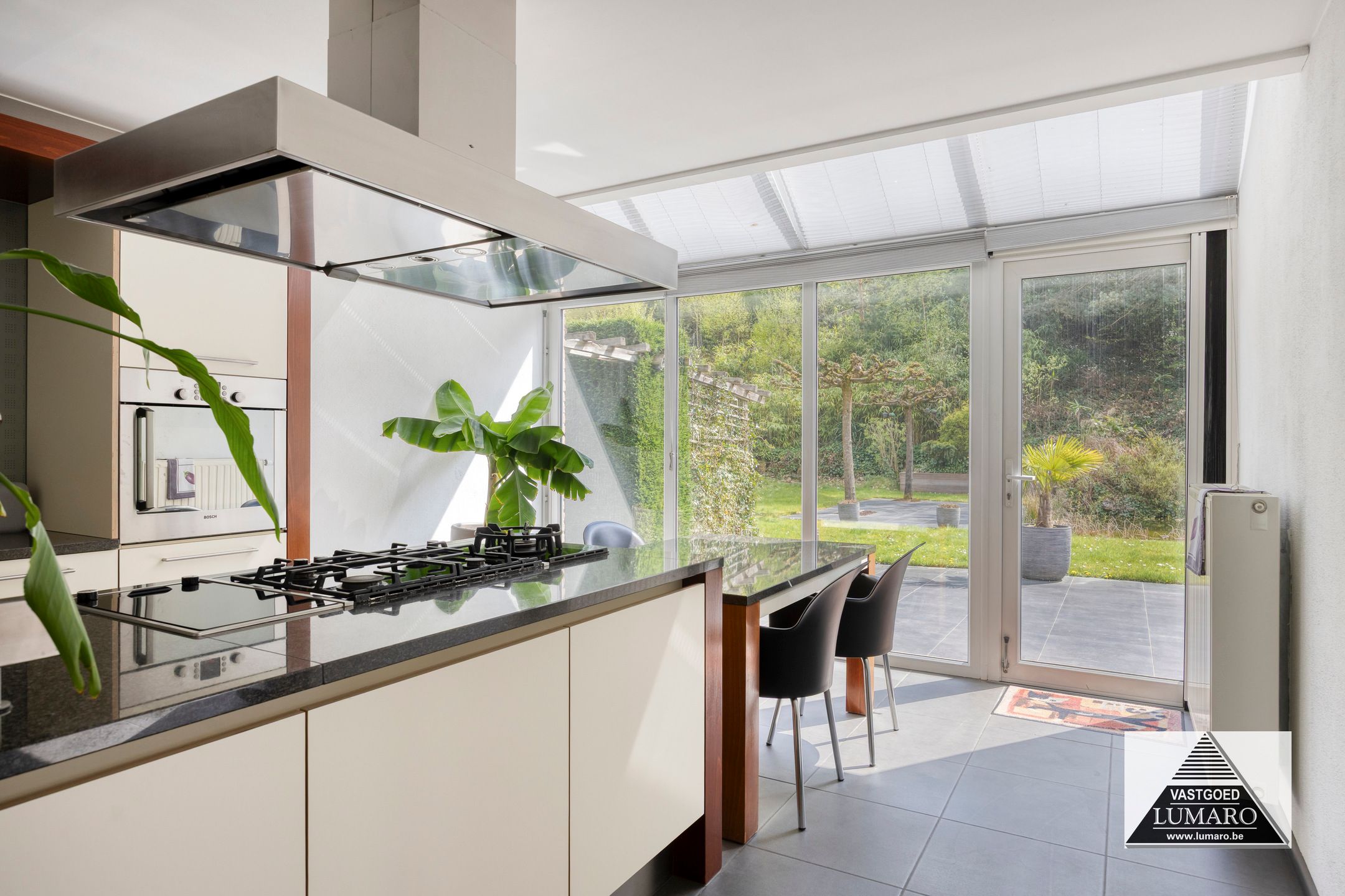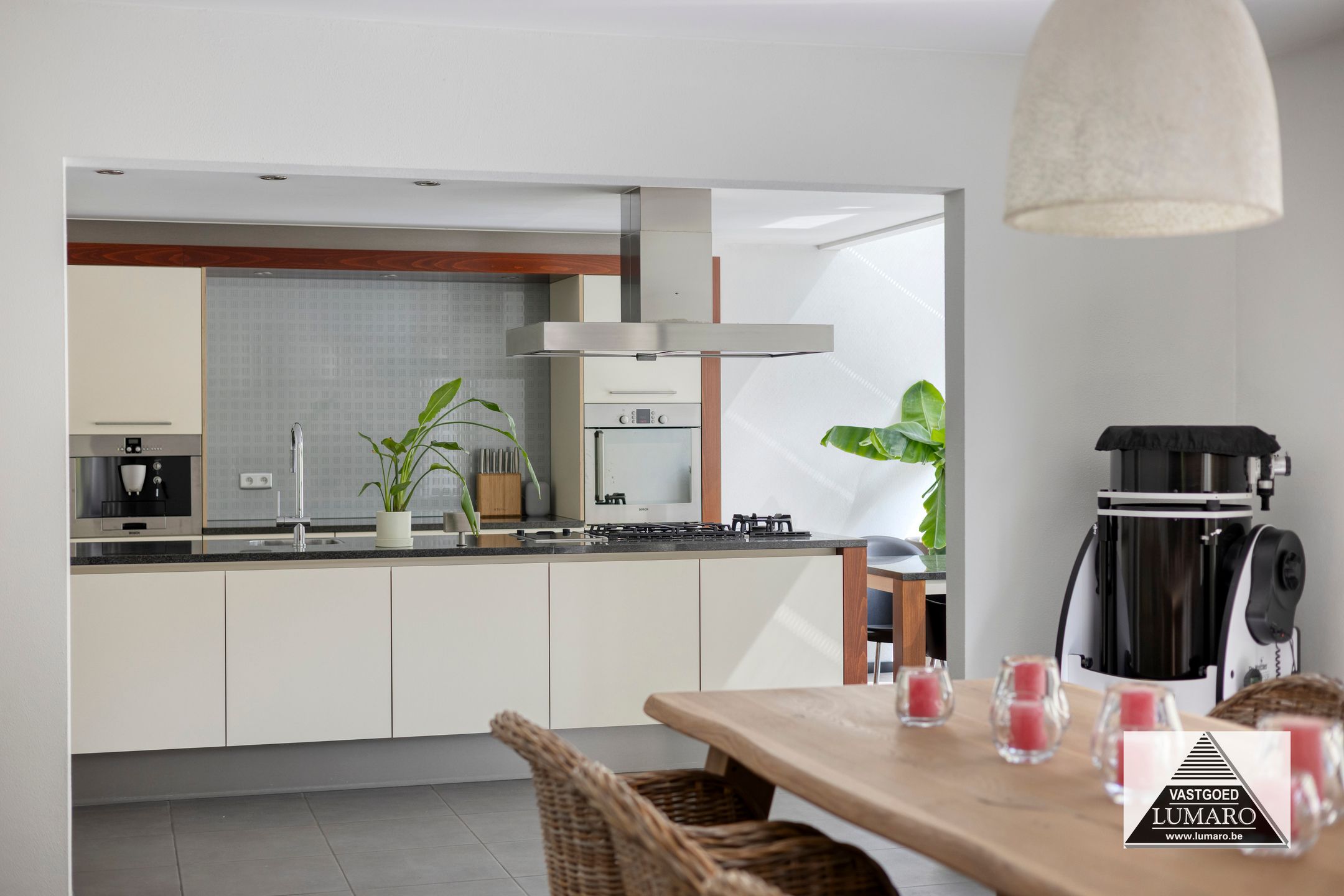 - Keuken : (4,00 m x 6,20 m = 24,80m²) – goed ingerichte keuken met groot spoel- en kookeiland – ruim werkblad – plafond met ingebouwde spots - verplaatsbare eettafel horend bij de keuken – granieten werkblad – onderbouw spoelbak met eengreepsmengkraan – 4-pits gasfornuis – wokpit – grillplaat – inox dampkap (boven fornuis, wok, grill) – ingebouwd koffie-apparaat – combi-oven – vaatwasmachine – ingebouwde koelkast - toestellen merk Bosch – veel kastruimte! – ook de volledige wand van het eiland dat naar de woonkamer uitkijkt is van kasten voorzien – aan de keuken is een mooie glas-erker uitgebouwd met zicht naar terras, tuin en de erachter gelegen bomen.