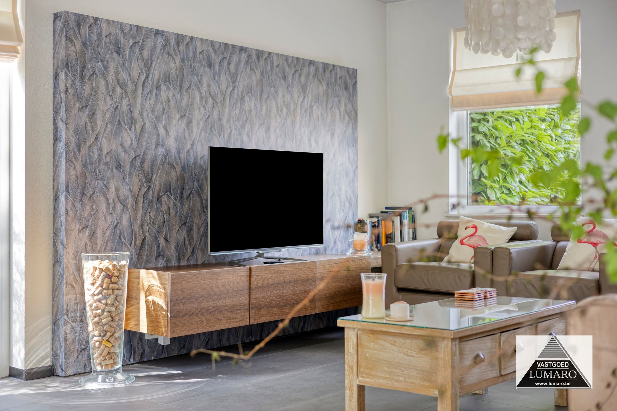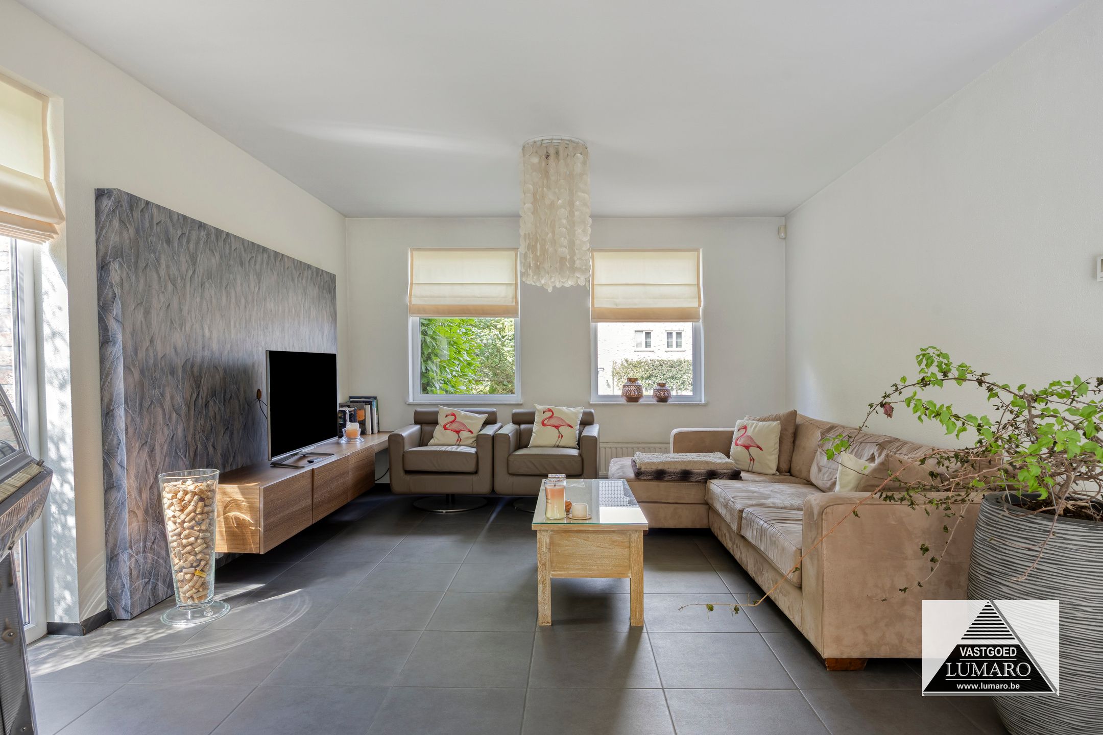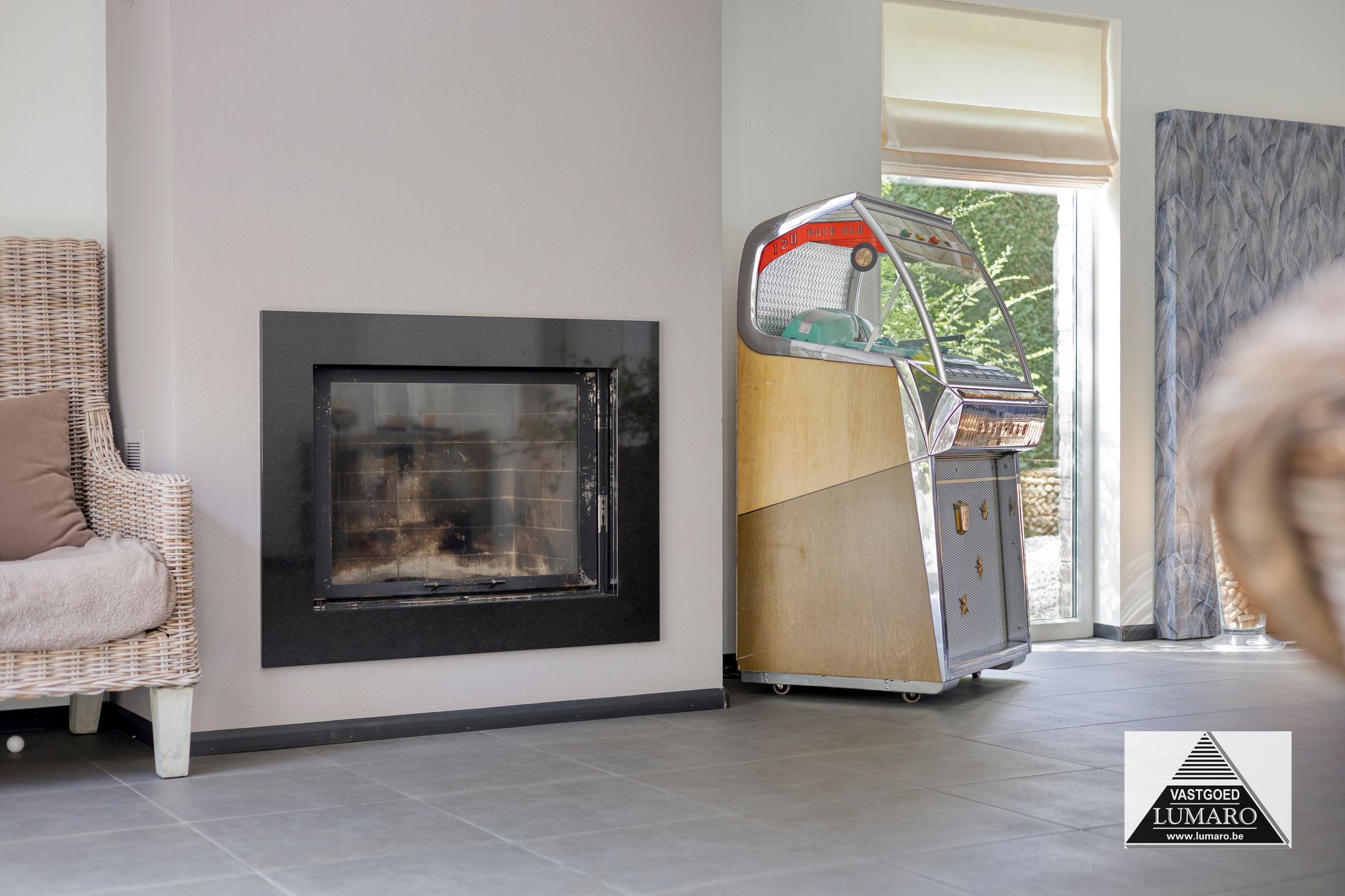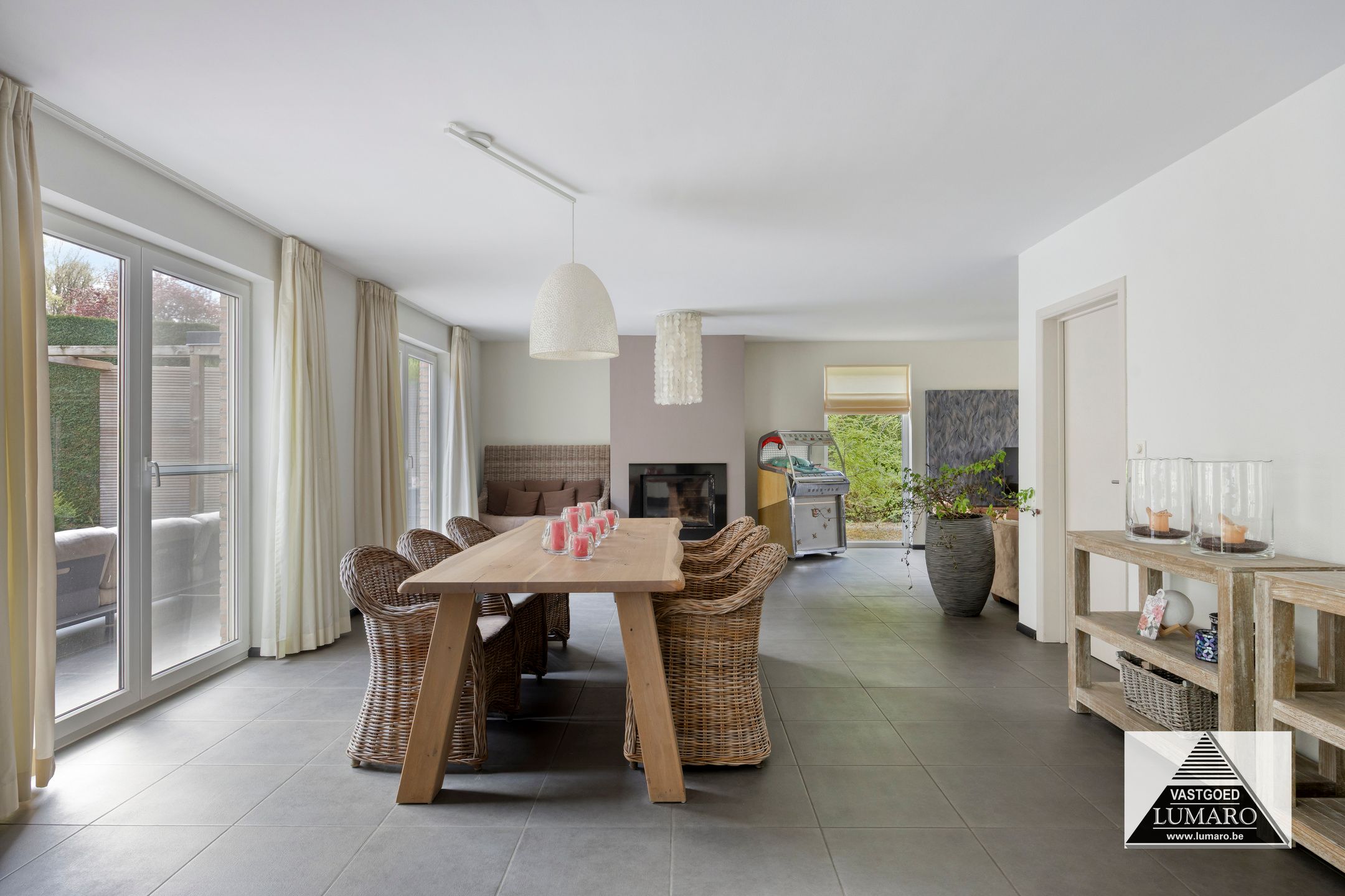 - Woonkamer: (7,95/4,00 m x 8,50 m = 53,37 m²) – tegelvloer – zeer aangename, ruime en lichte leefkamer in L-vorm – eigentijdse schouw met ingebouwde haardcassette –vloerverwarming in woonkamer en keuken (op aardgas) - toegang naar het terras – open doorgang naar de keuken – de woonkamer biedt naast de eetkamer en zithoek nog gemakkelijk ruimte aan een bureel-, hobby- of speelhoek.