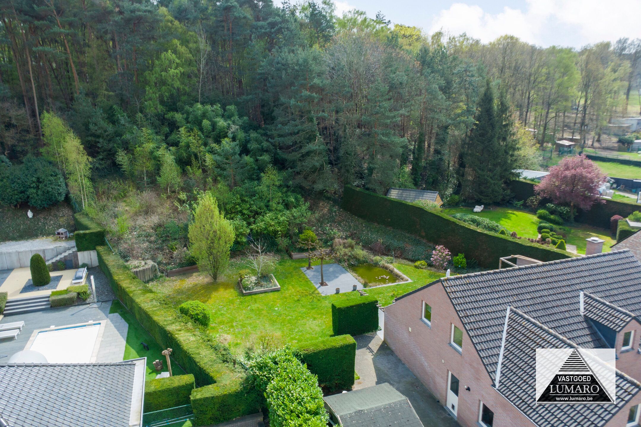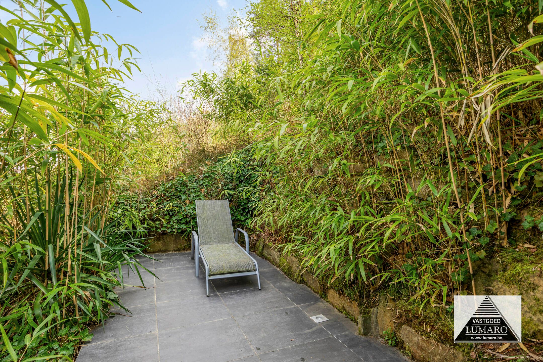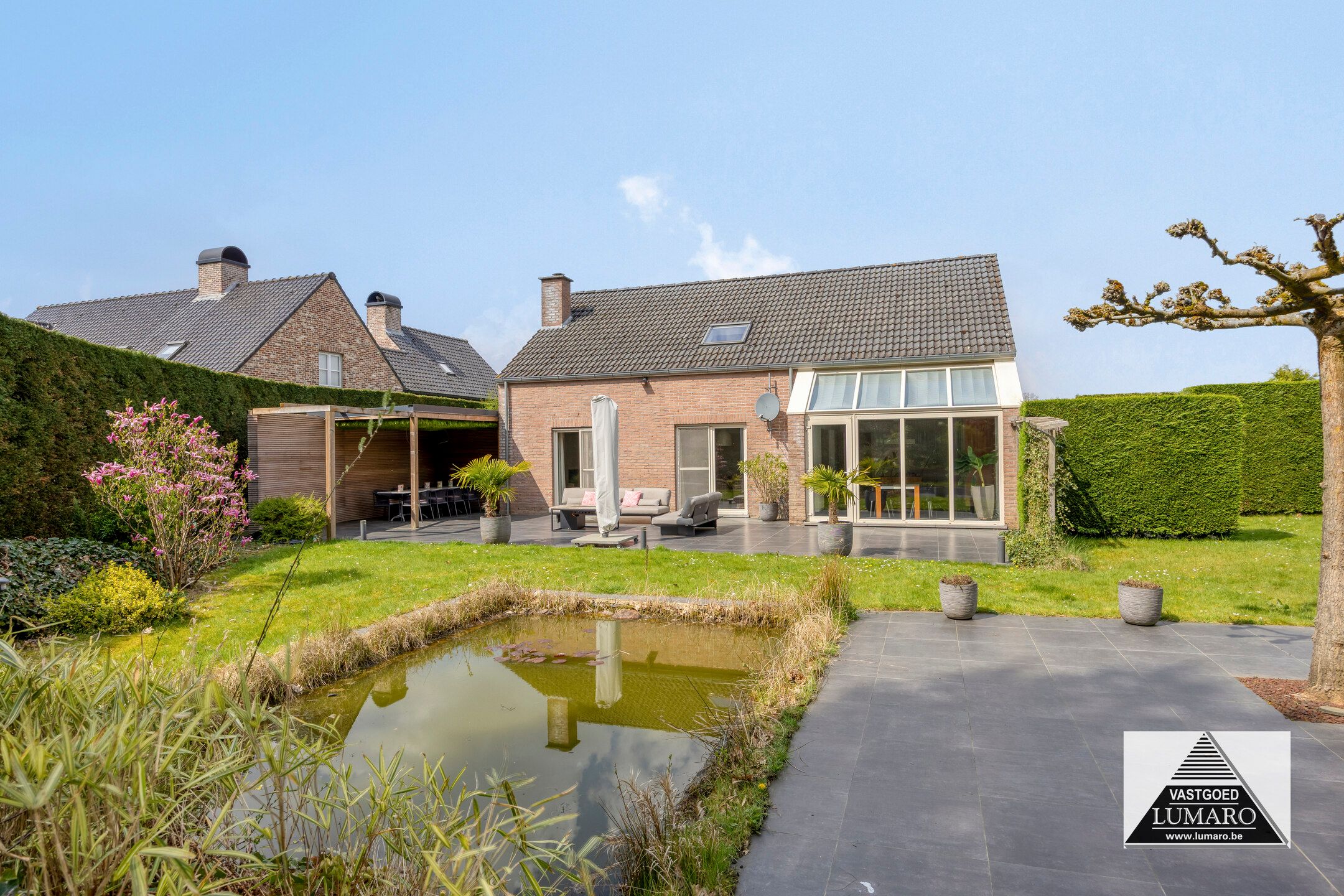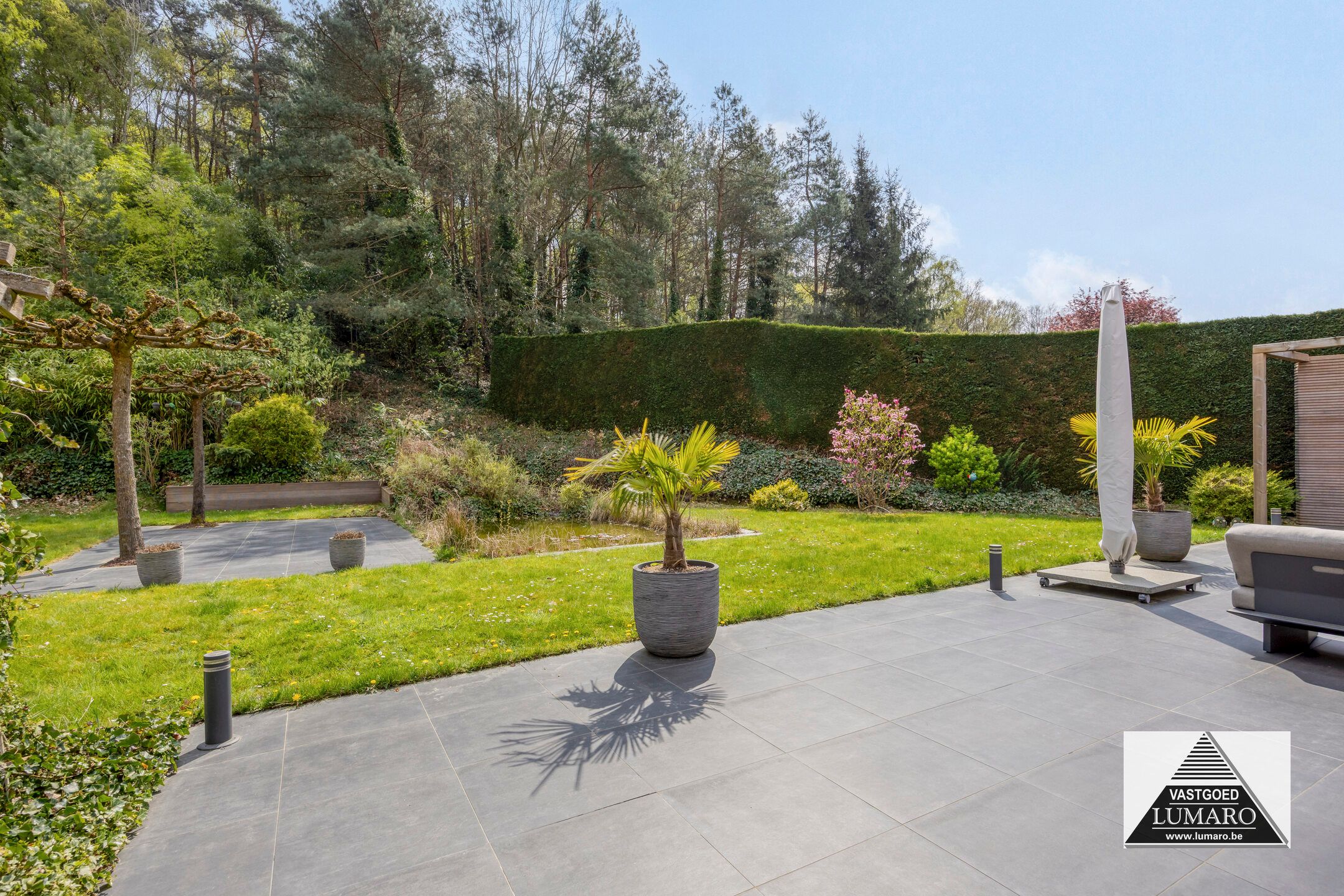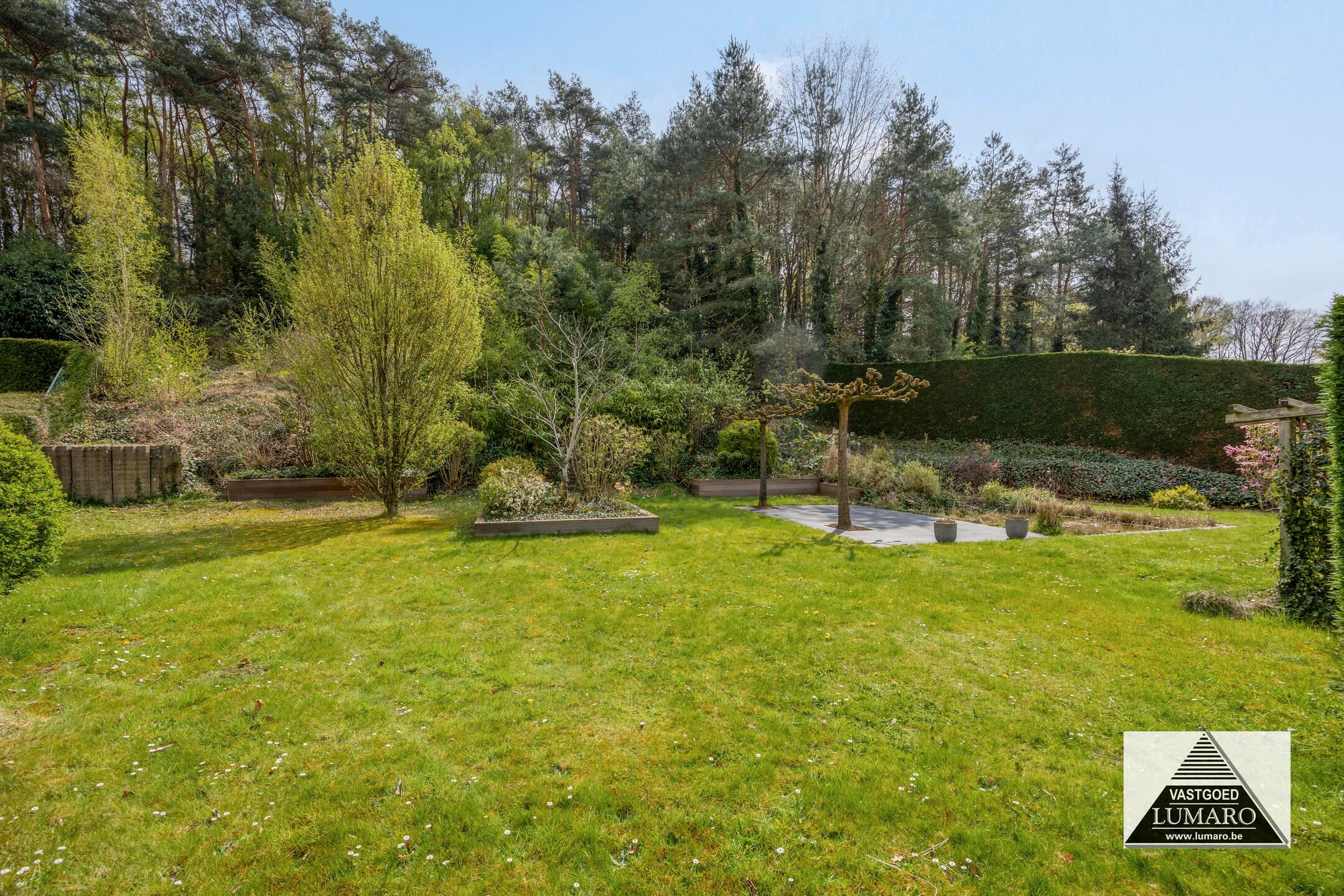 - Terras en tuin zijn zuidelijk georiënteerd! – terras toegankelijk vanuit woonkamer en keuken, over de volledige breedte van de achtergevel aangelegd (12,70 m breed!) – het terras mondt uit in het gazon – iets verder ligt een 2de terras langs een vijver – het perceel helt daarna iets omhoog, deze talud is bekleed met bodembedekkers en beplanting – op de hoogte is het perceel nog 45 m eigendom bij de woning, ook op dezelfde breedte van 25 m.