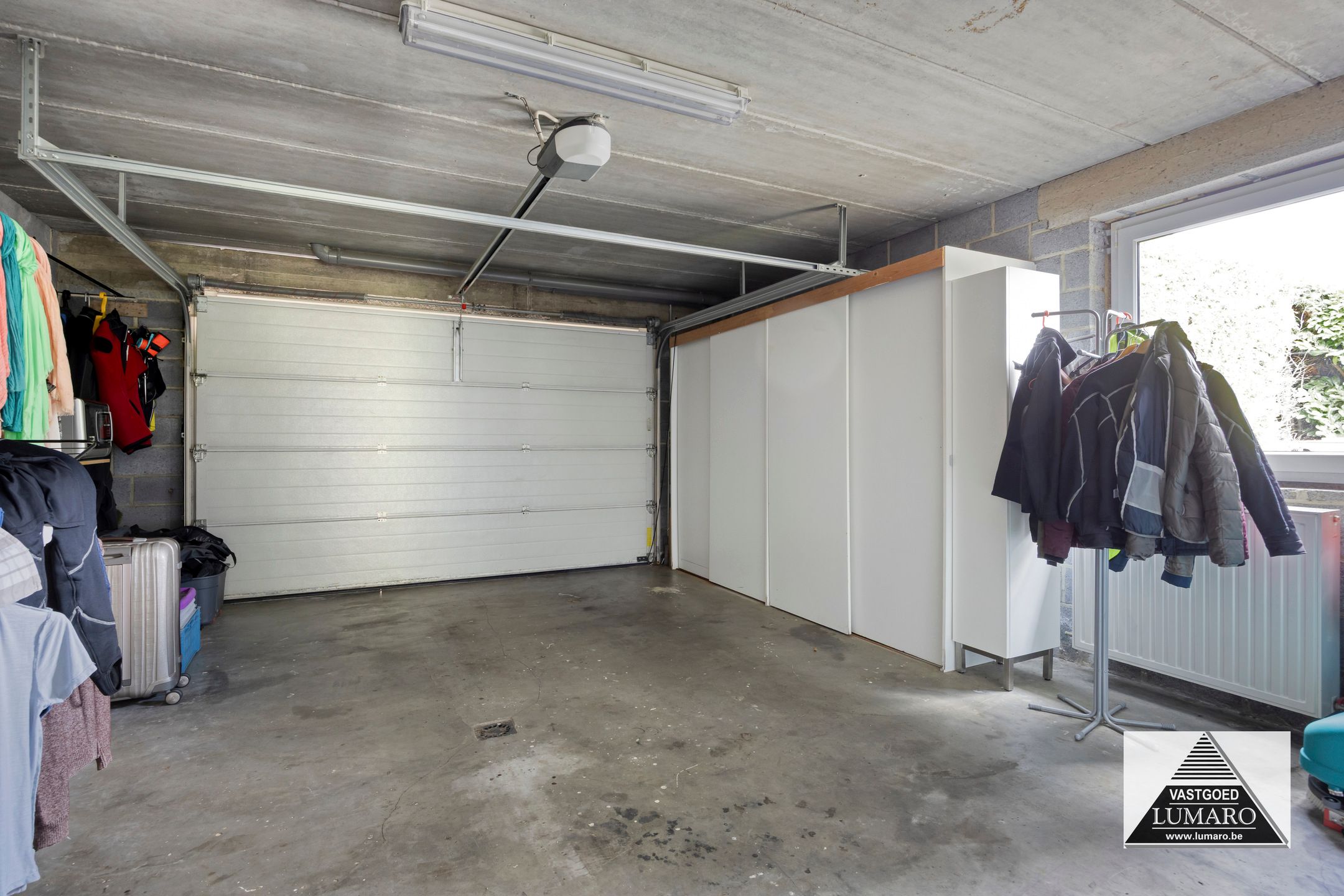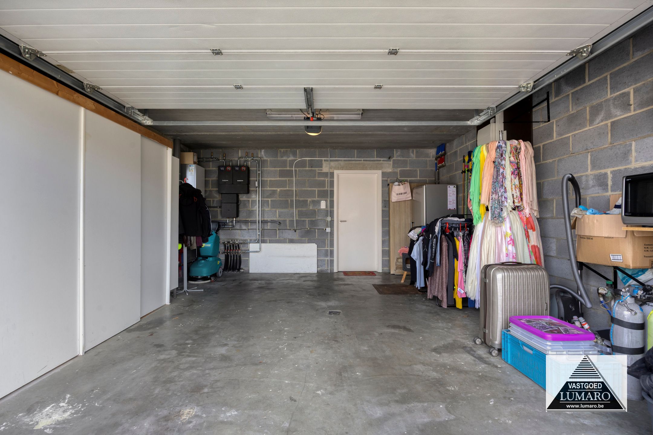 - Garage: (5,10 m x 5,70 m = 29,07 m²) – betonvloer – brede garage met raam op zijgevel – elektrisch bedienbare sectionaalpoort – radiator – hier bevindt zich ook de c.v.-ketel (Chaffoteaux & Maury) met bediening van de vloerverwarming – zekeringenkast en elektriciteitsmeter (dag- en nachttarief) – de regenwaterpomp (put 5.000L, regenwater aangesloten op toiletten en buitenkraan) is tevens in de garage – toegang naar de kruipruimte die onder de volledige woning loopt.