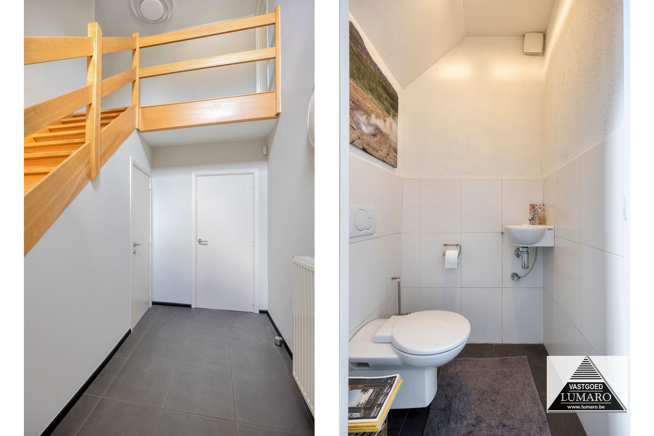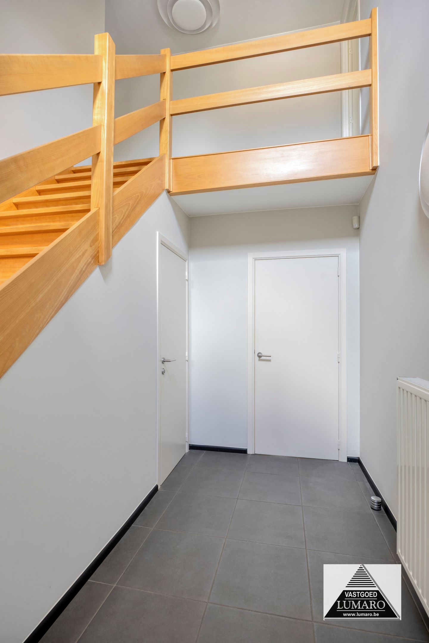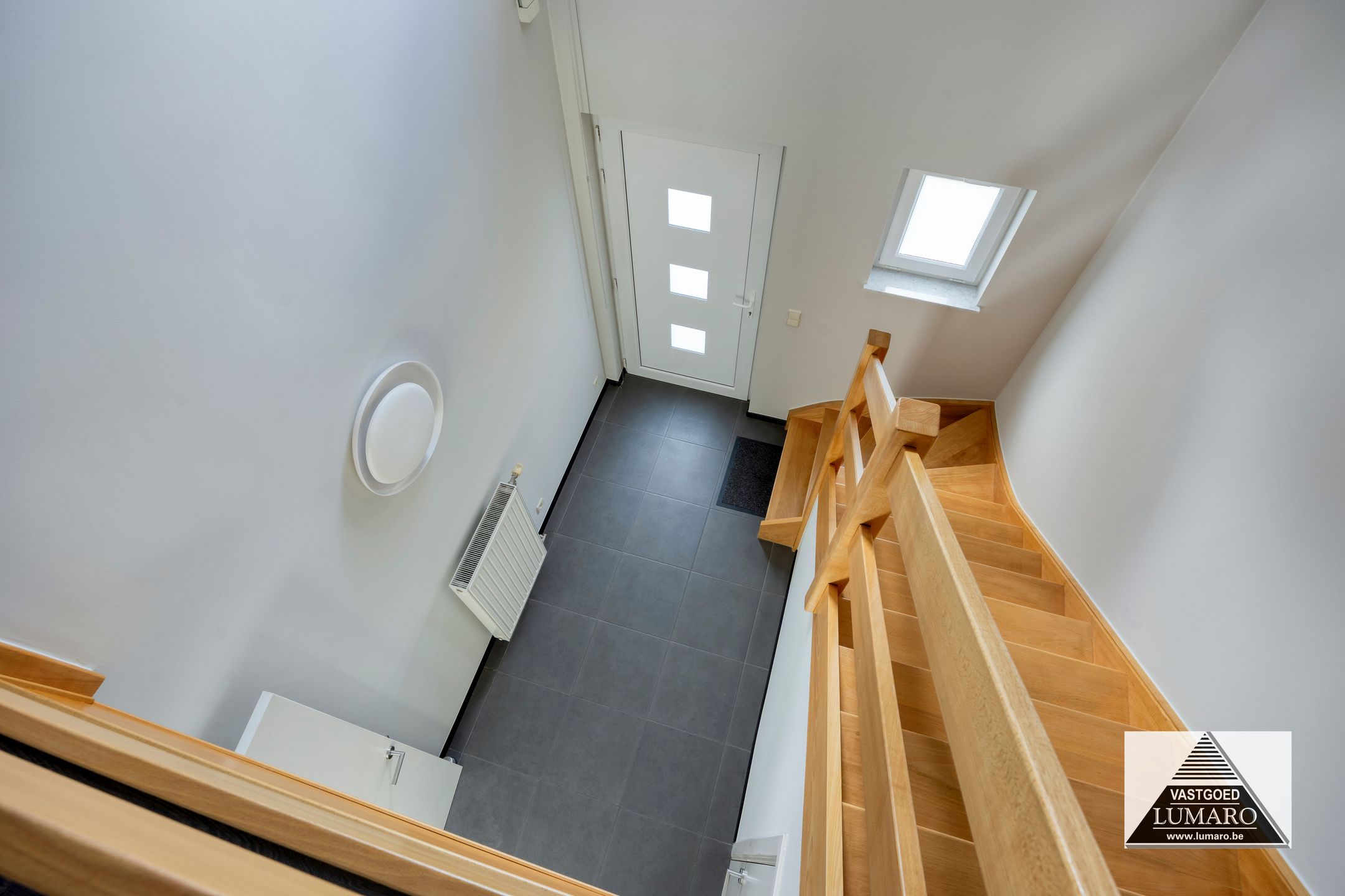 - Inkom: (2,70 m x 3,65 m = 9,86 m²) – tegelvloer – hal met open vide naar de nachthal – gastentoilet met handenwasbakje (Sphinx) – beuken trap naar de verdieping.