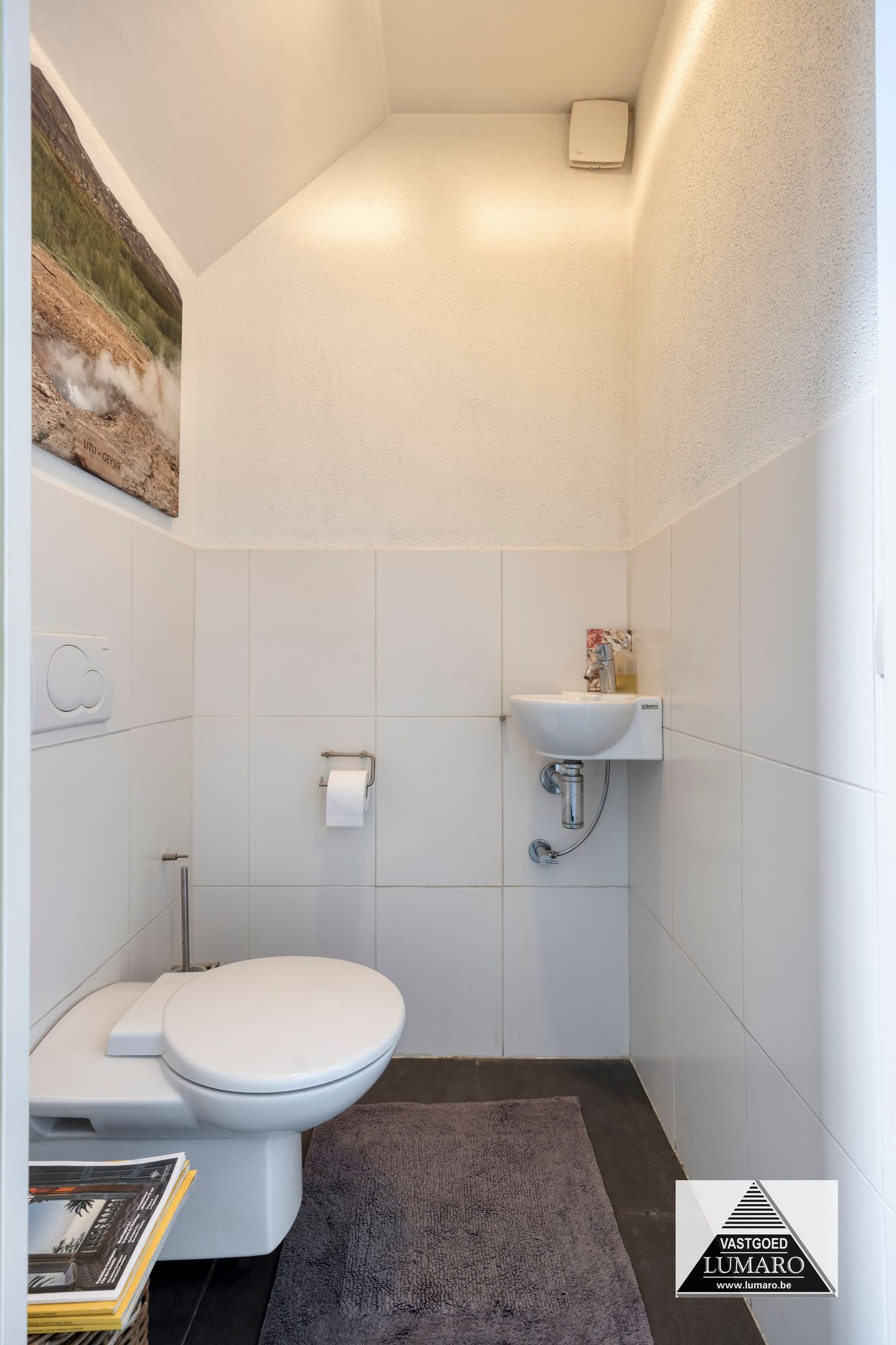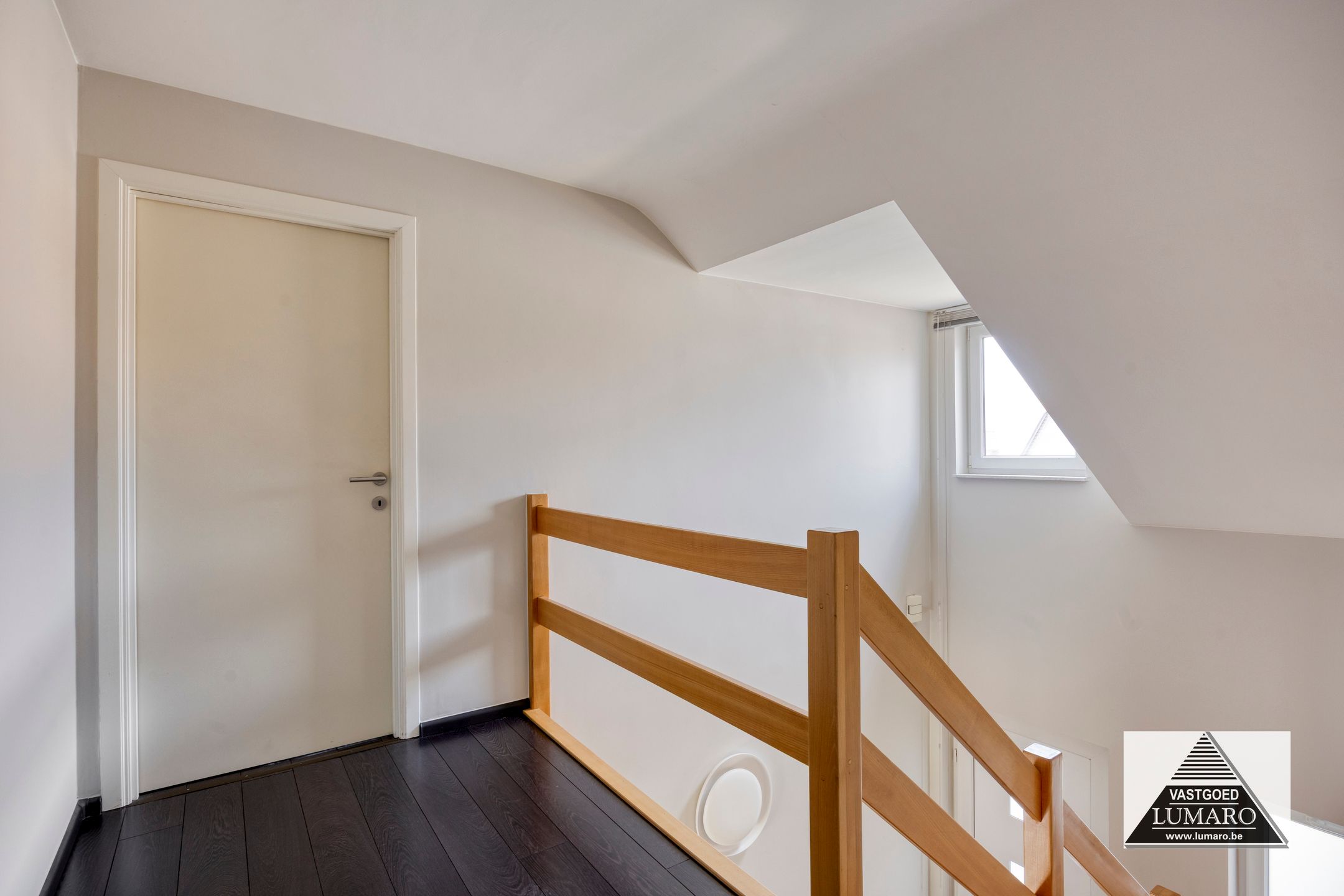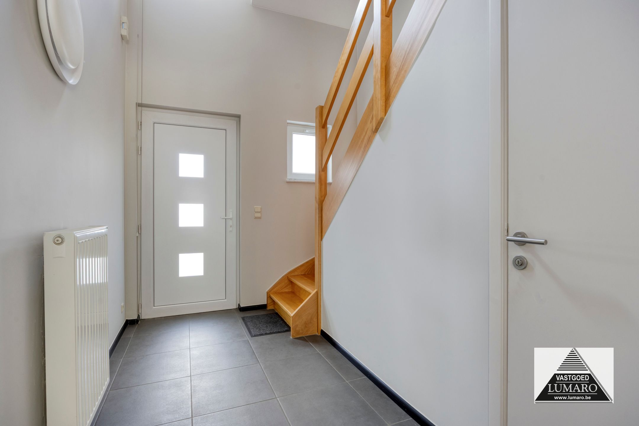 - Inkom: (2,70 m x 3,65 m = 9,86 m²) – tegelvloer – hal met open vide naar de nachthal – gastentoilet met handenwasbakje (Sphinx) – beuken trap naar de verdieping.