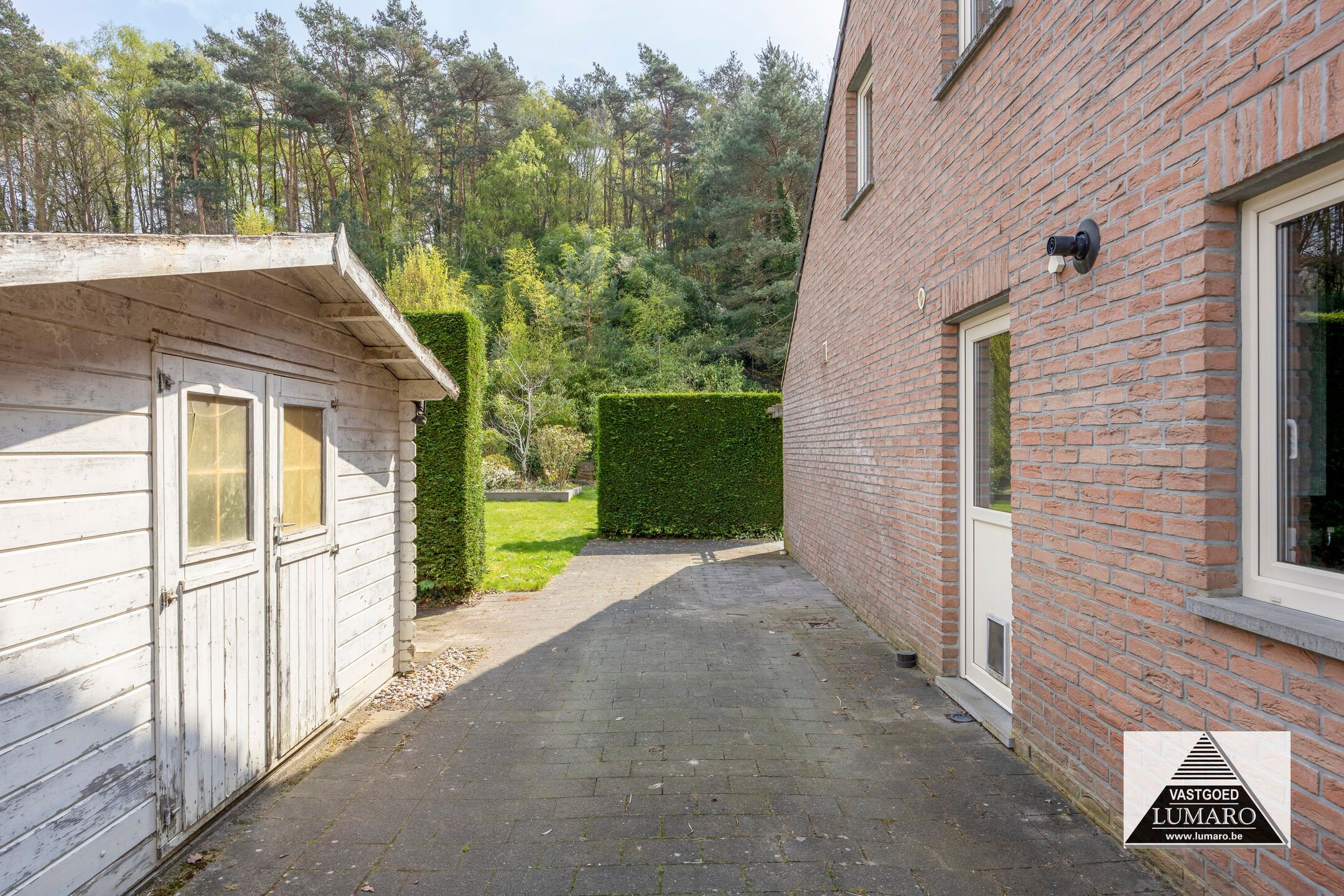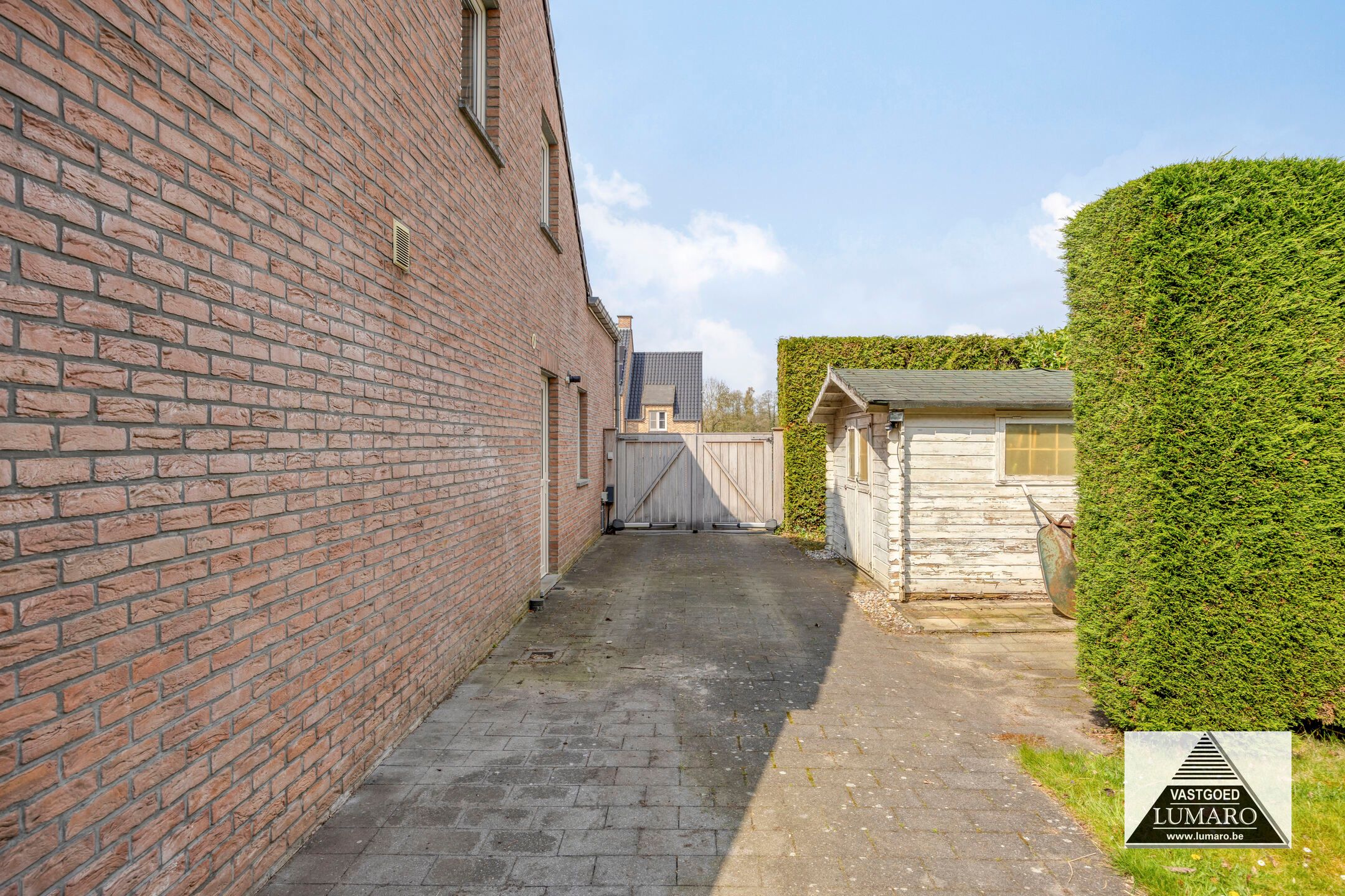 - Links van deze oprijlaan is een 2de oprijlaan in klinkers die langs de woning naar achteraan doorloopt – een hekwerk sluit de oprijlaan af – ook ideaal voor het plaatsen van een aanhangwagen of mobilhome!