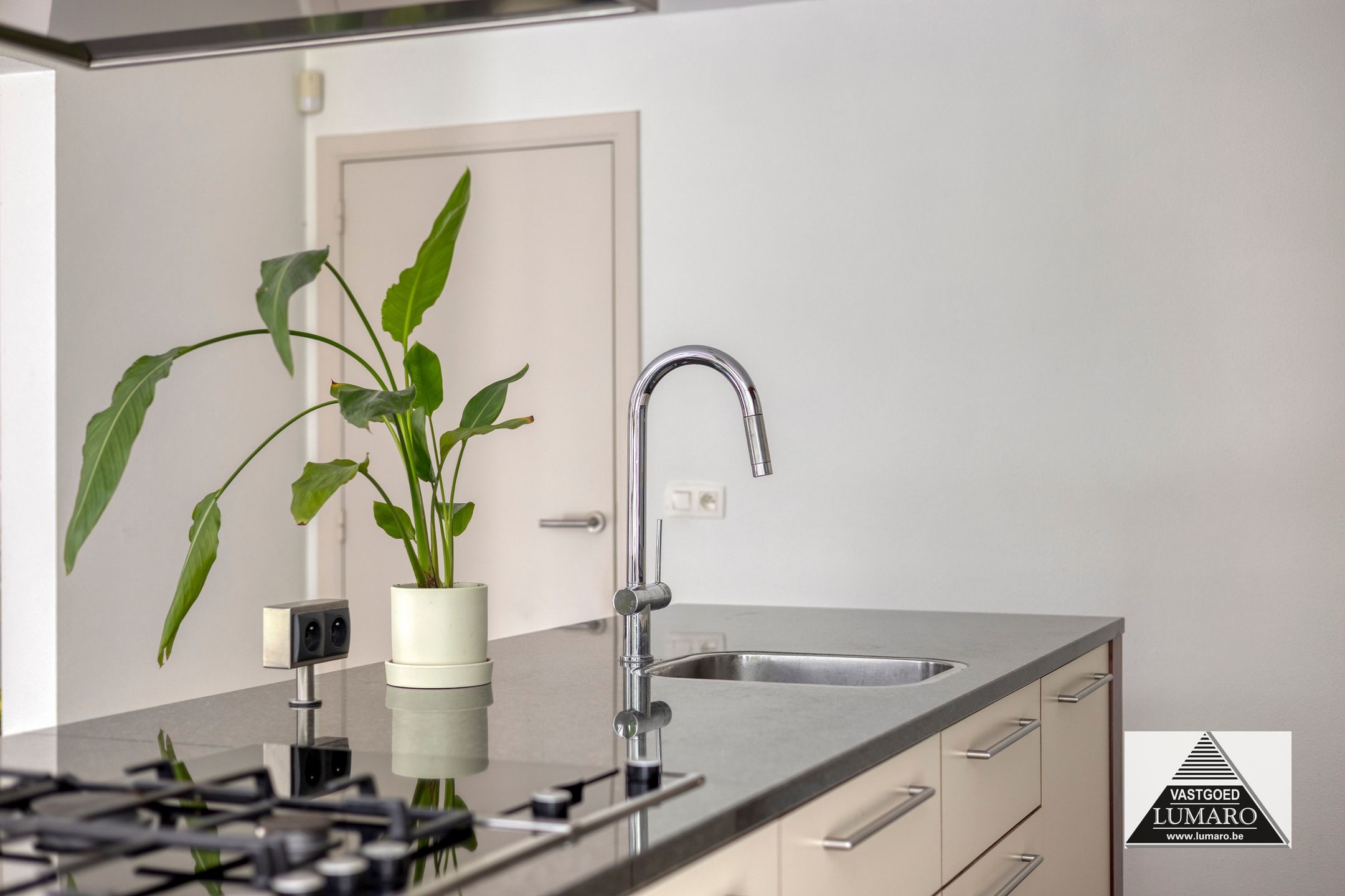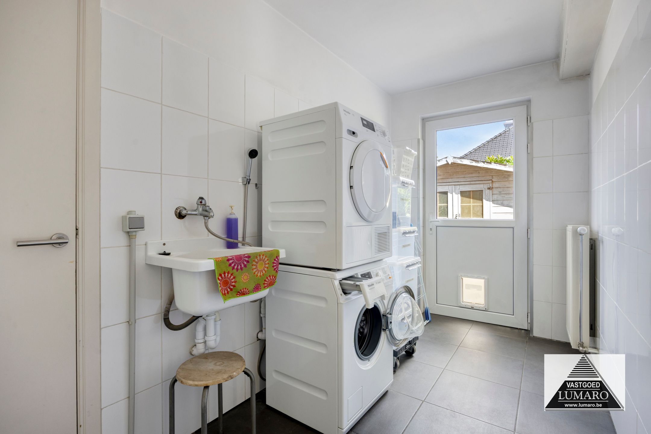 - Bijkeuken/wasplaats: (4,80 m x 1,80 m = 8,64 m²) – tegelvoer – naast de keuken gelegen bergruimte met buitendeur – aansluitingen voor wasmachine – uitgietbak met warm en koud water - ingebouwde kastenwand (1,80 m breed) ideaal als voorraadkast – toegang naar de garage.