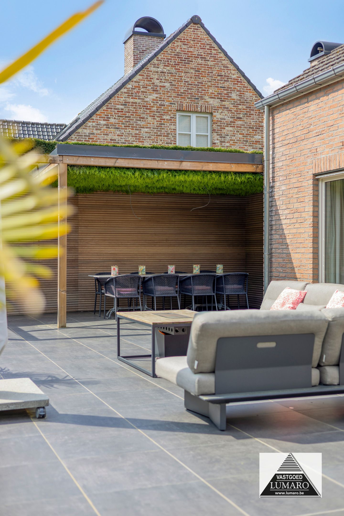 Grote terras over heel de breedte van de achtergevel + overkapping van 3,50 m x 2,50 m.