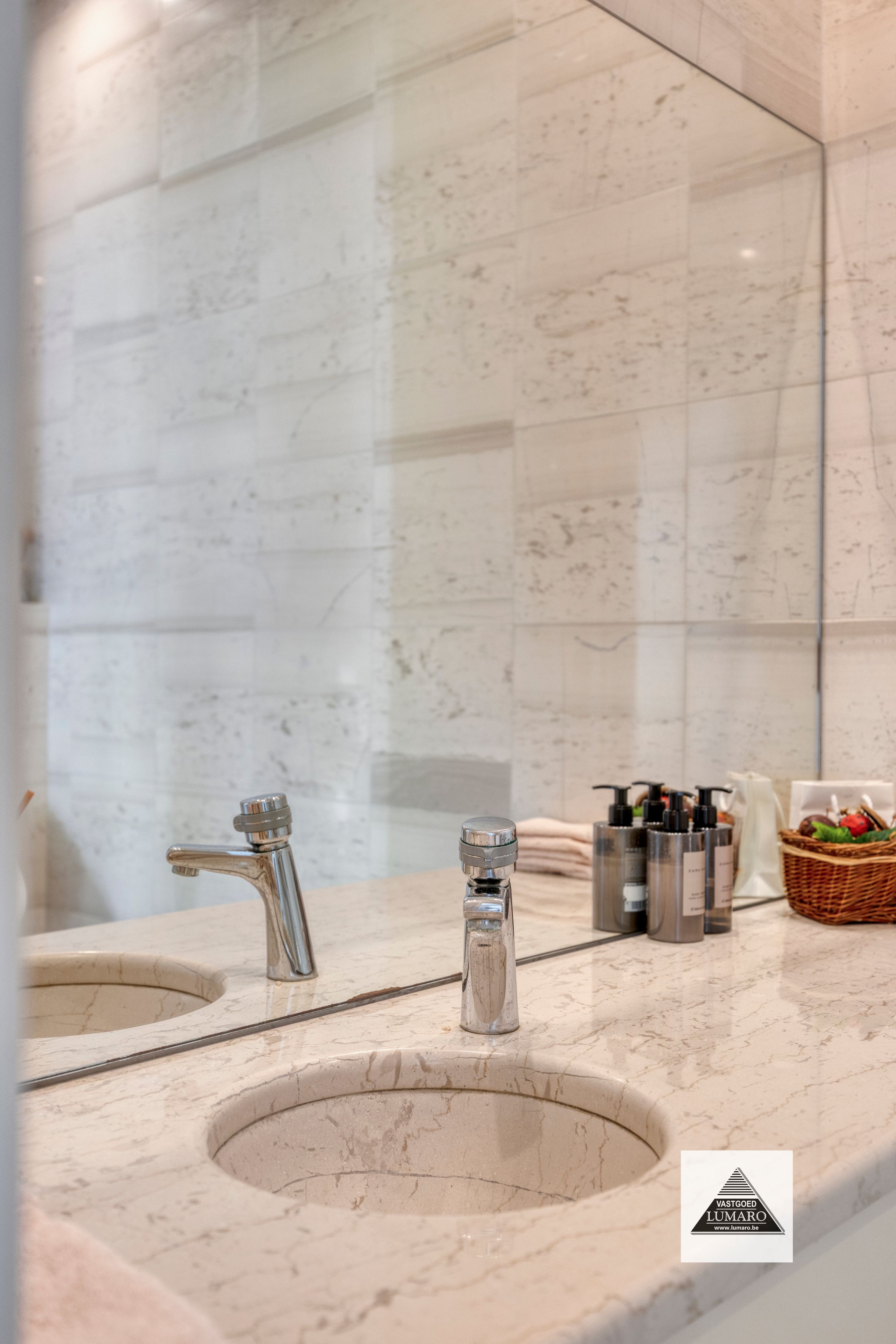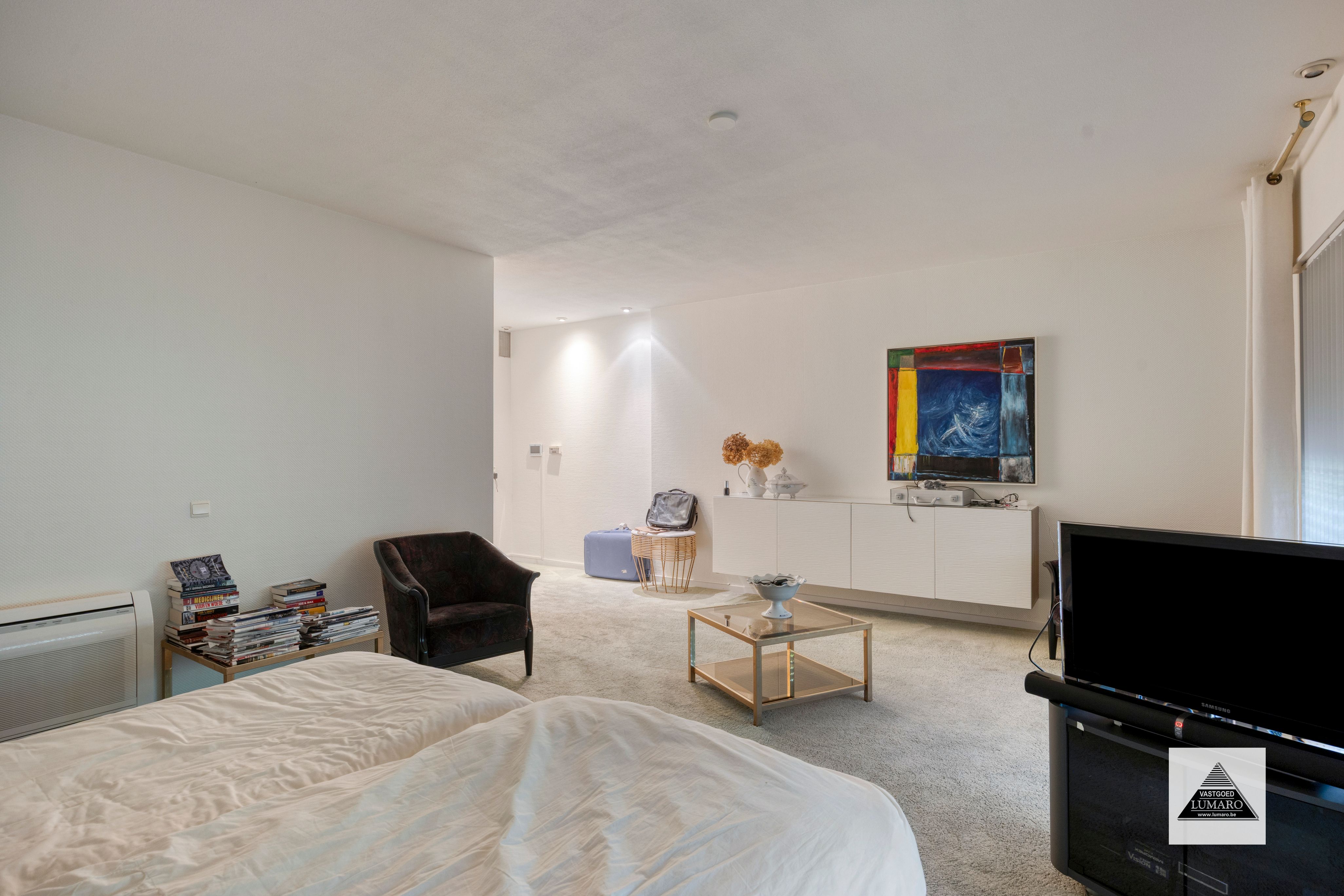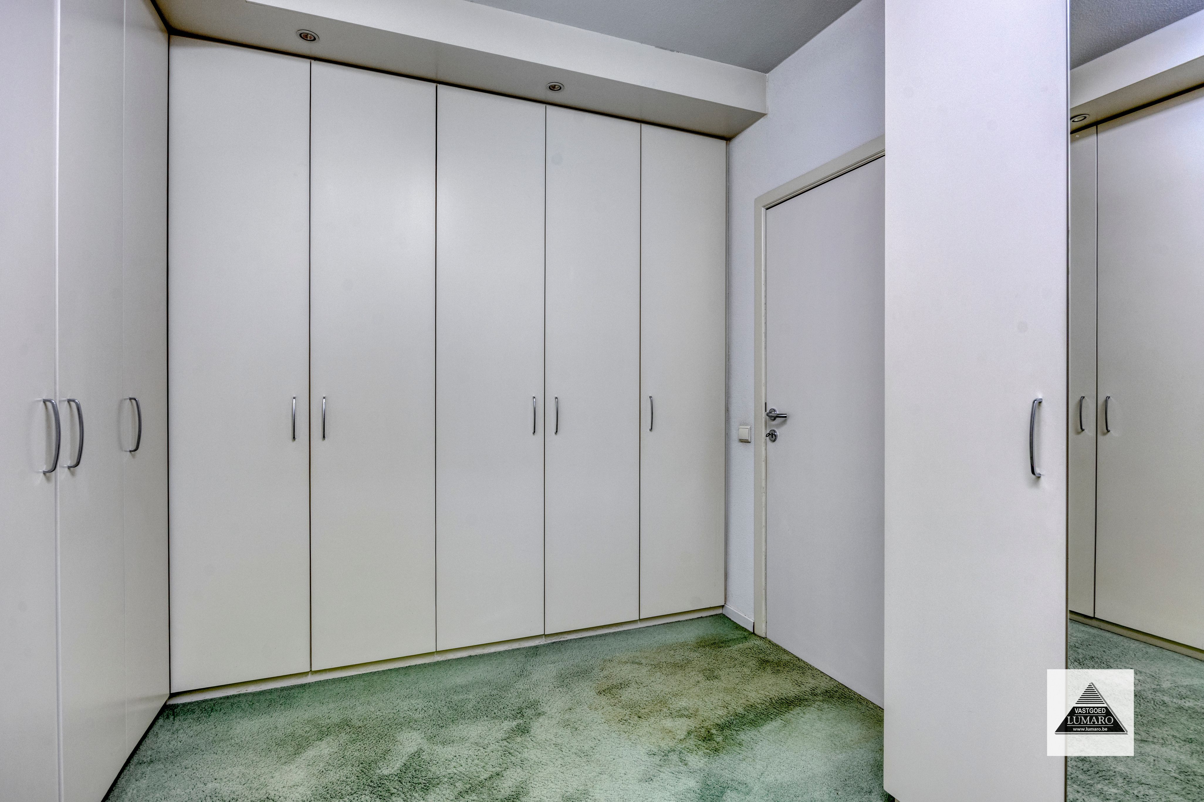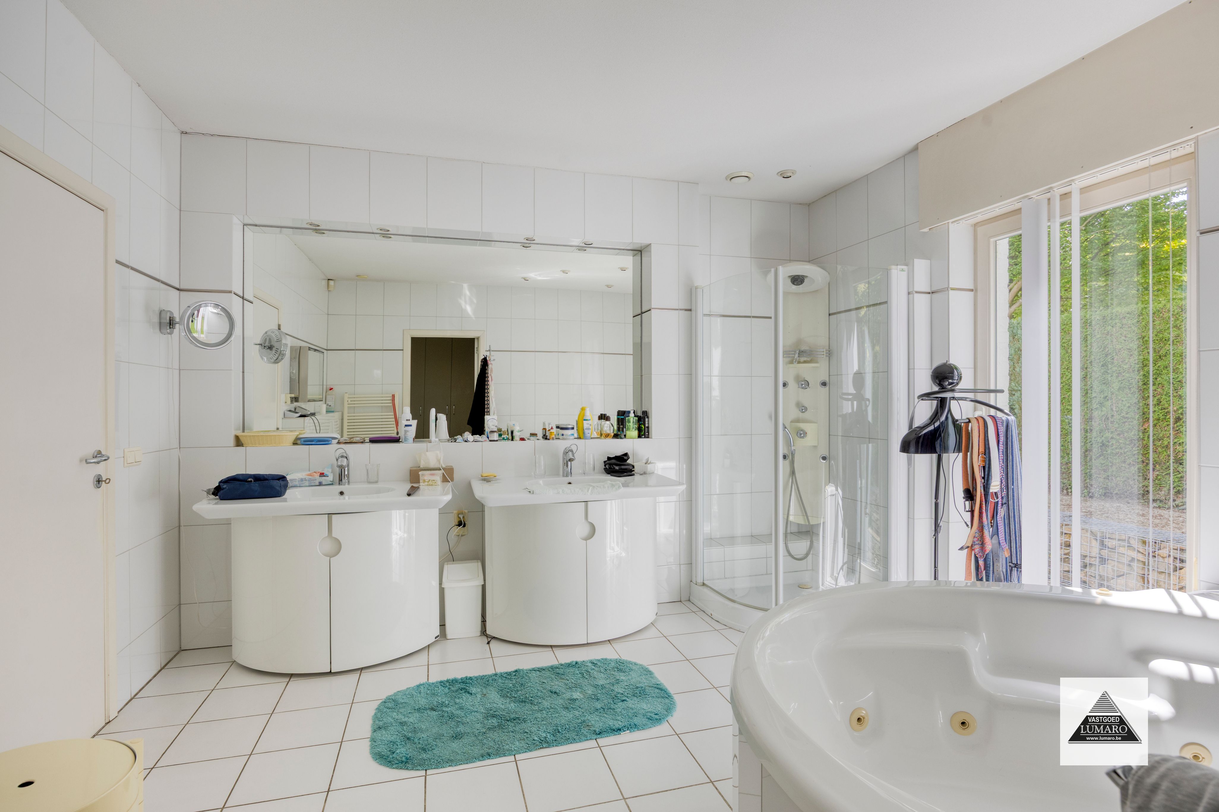 - Slaapkamer 1 met badkamer en dressing: 55 m² - slaapkamer (6,05 m x 4,50 m = 27,23 m²) tapijt – elektrische rolluiken – badkamer (3,80 m x 3,95 m = 15 m²) ingericht met massagebad, massagedouche, 2 lavabo’s, toilet ; dressing ( 3,20 m x 3,95 m = 12,65 m²) kasten