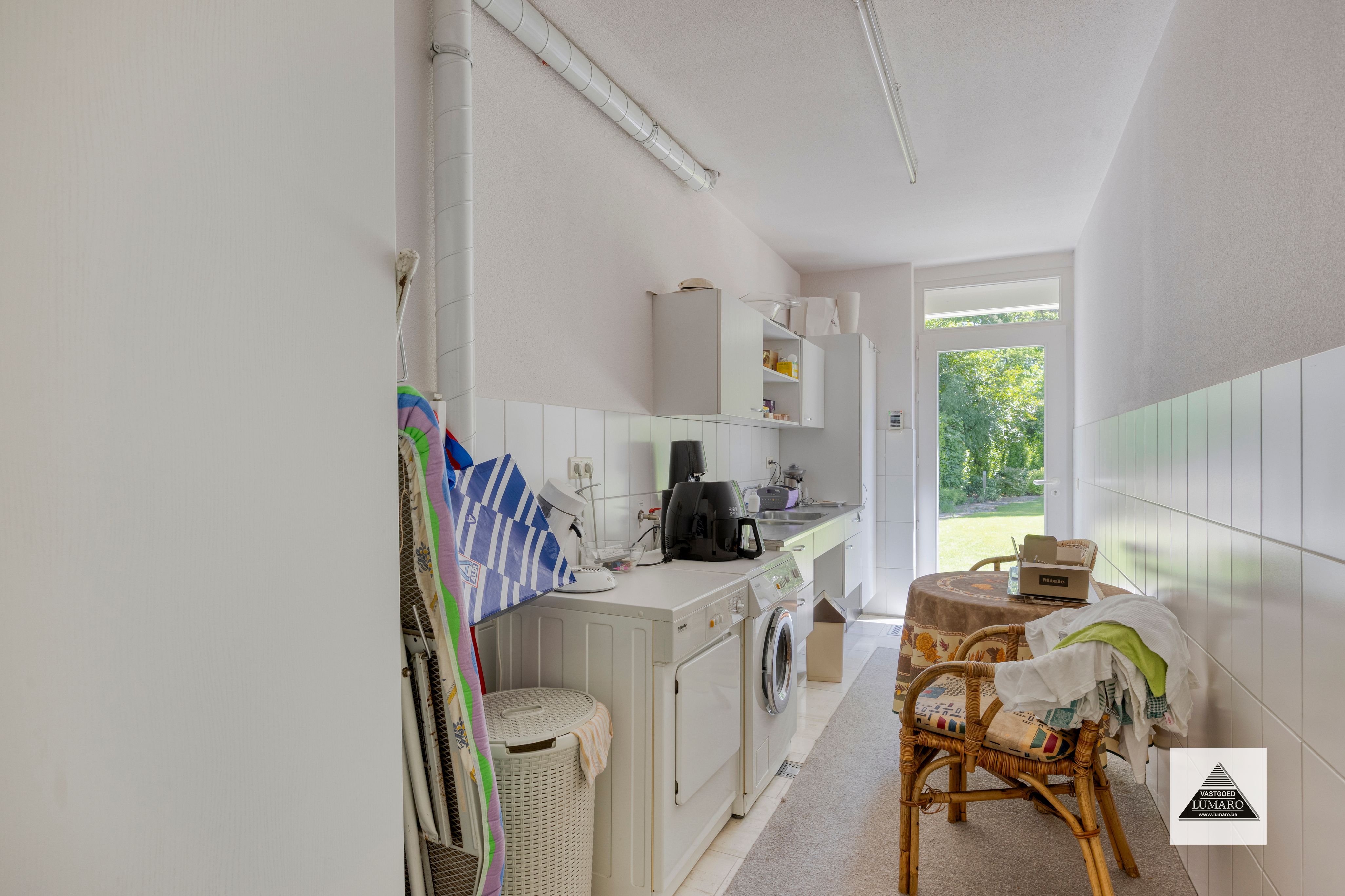 - Bijkeuken: (5,85 m x 1,95 m = 11,41 m²) – aansluitingen voor wasmachine en droger - spoeltafel – kasten - achterdeur naar de tuin en deur naar de gelijkvloers garage