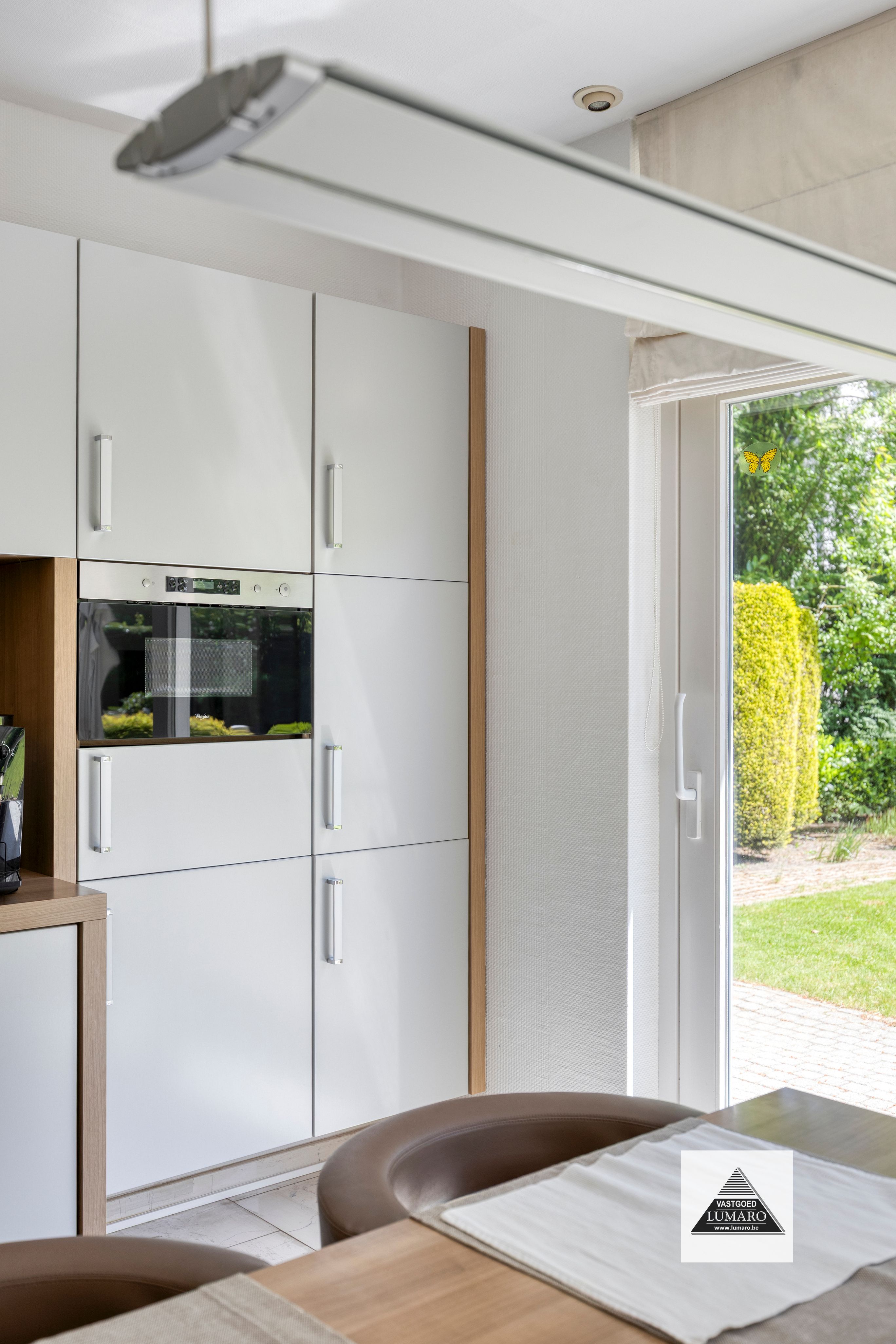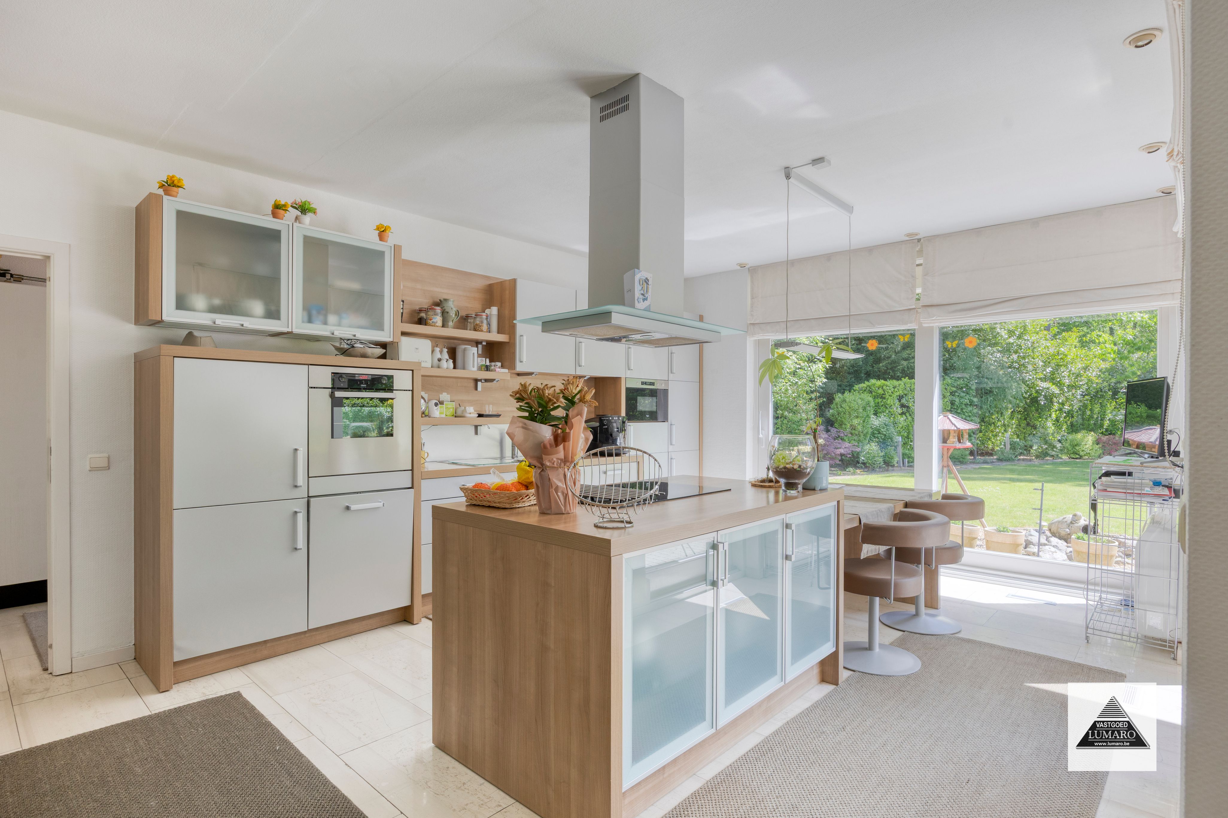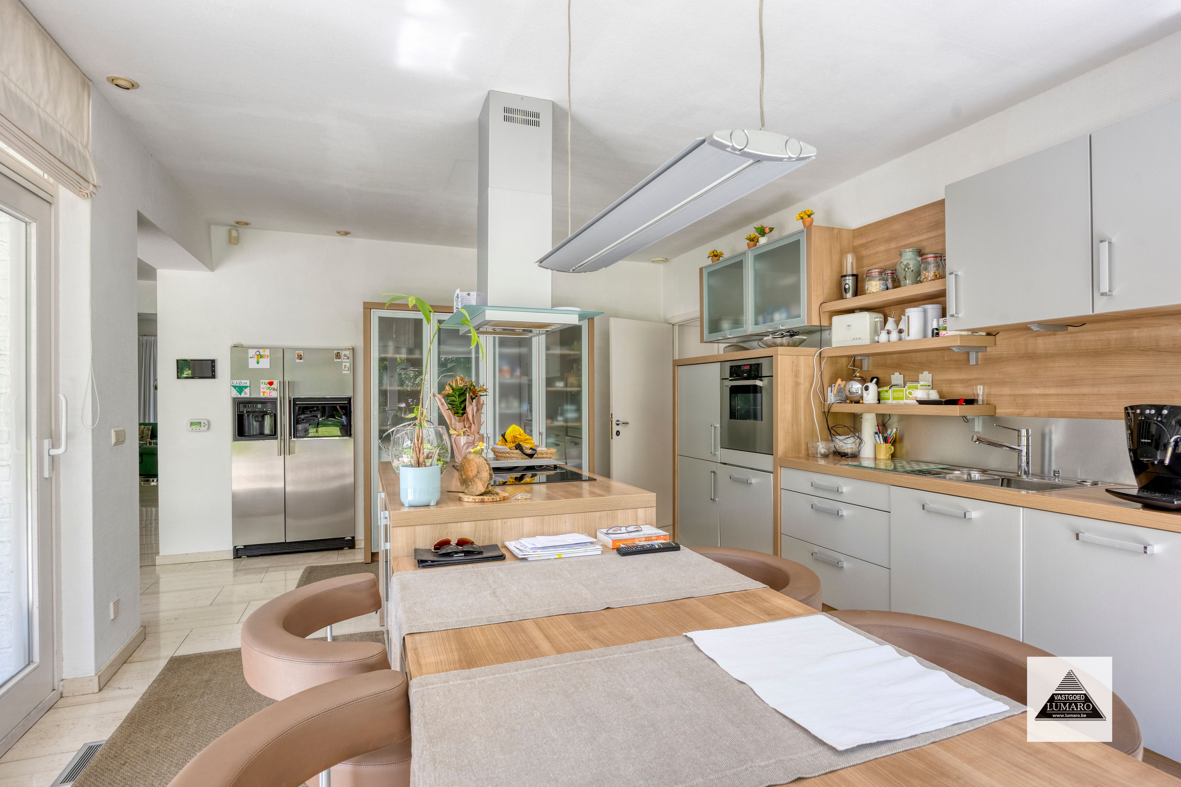 - Leefkeuken : (5,85 m x 4,00 m = 23,40 m²) – natuursteen vloer – volledig ingericht met Amerikaanse koelkast, kookeiland met kookplaat Boretti, koffiemachine, ovens, … - 2 schuifpuien naar de tuin