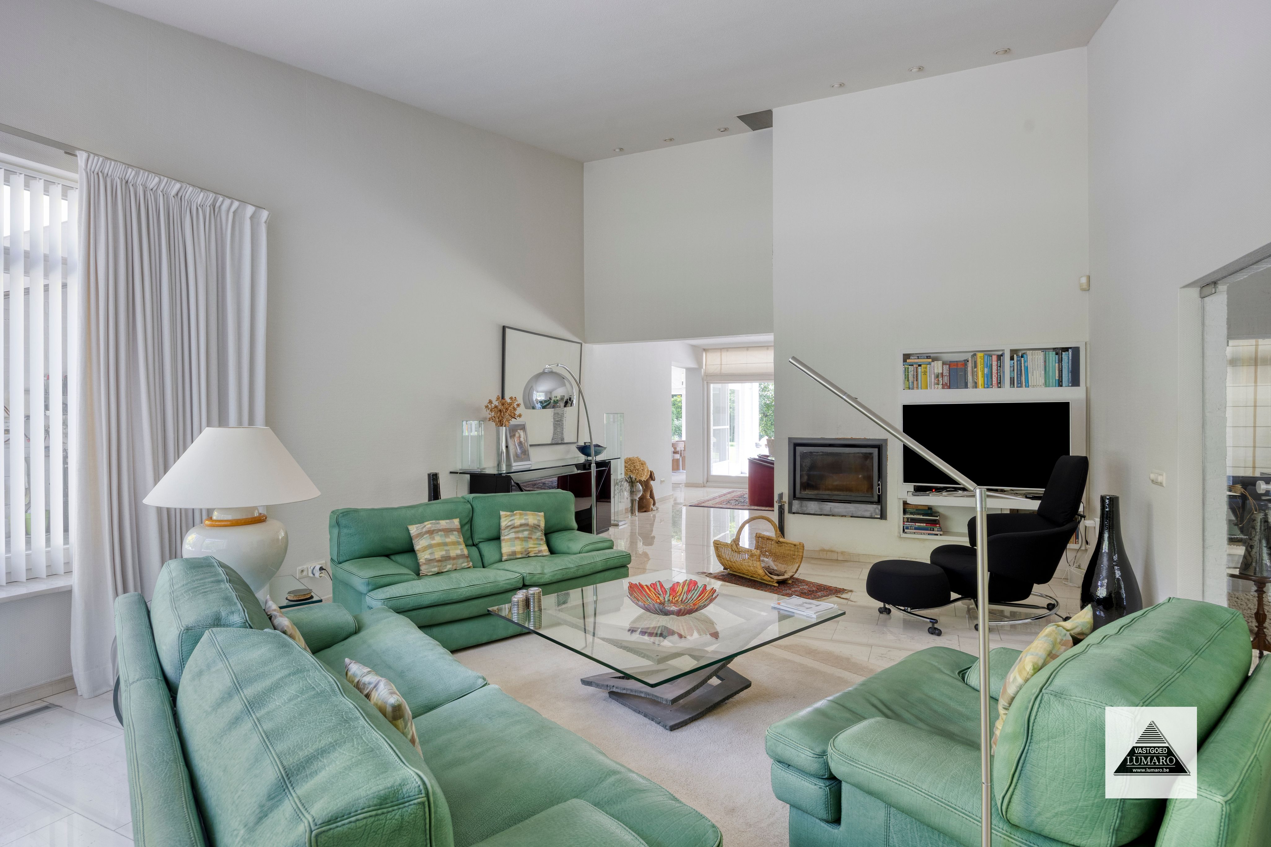 - Leefruimte: eetkamer en zitkamer 78 m² = eetkamer (8,60 m x 4,50 m = 38,70 m²) + zitkamer (7,65 m x 5,10 m = 39,02 m²) – natuursteen vloer - haardcassette - 3 schuifpuien naar de tuin – hoekvenster op de voorgevel - open doorgang naar de keuken