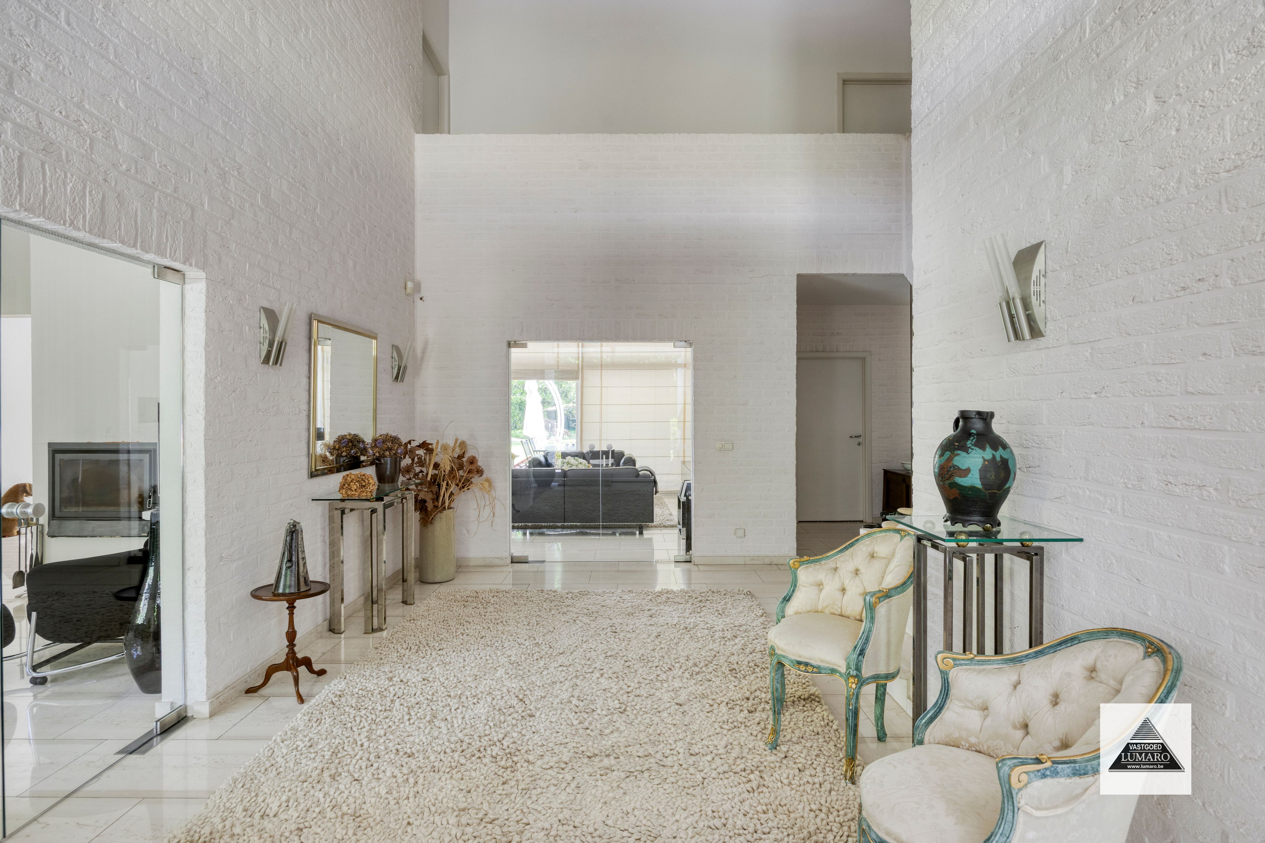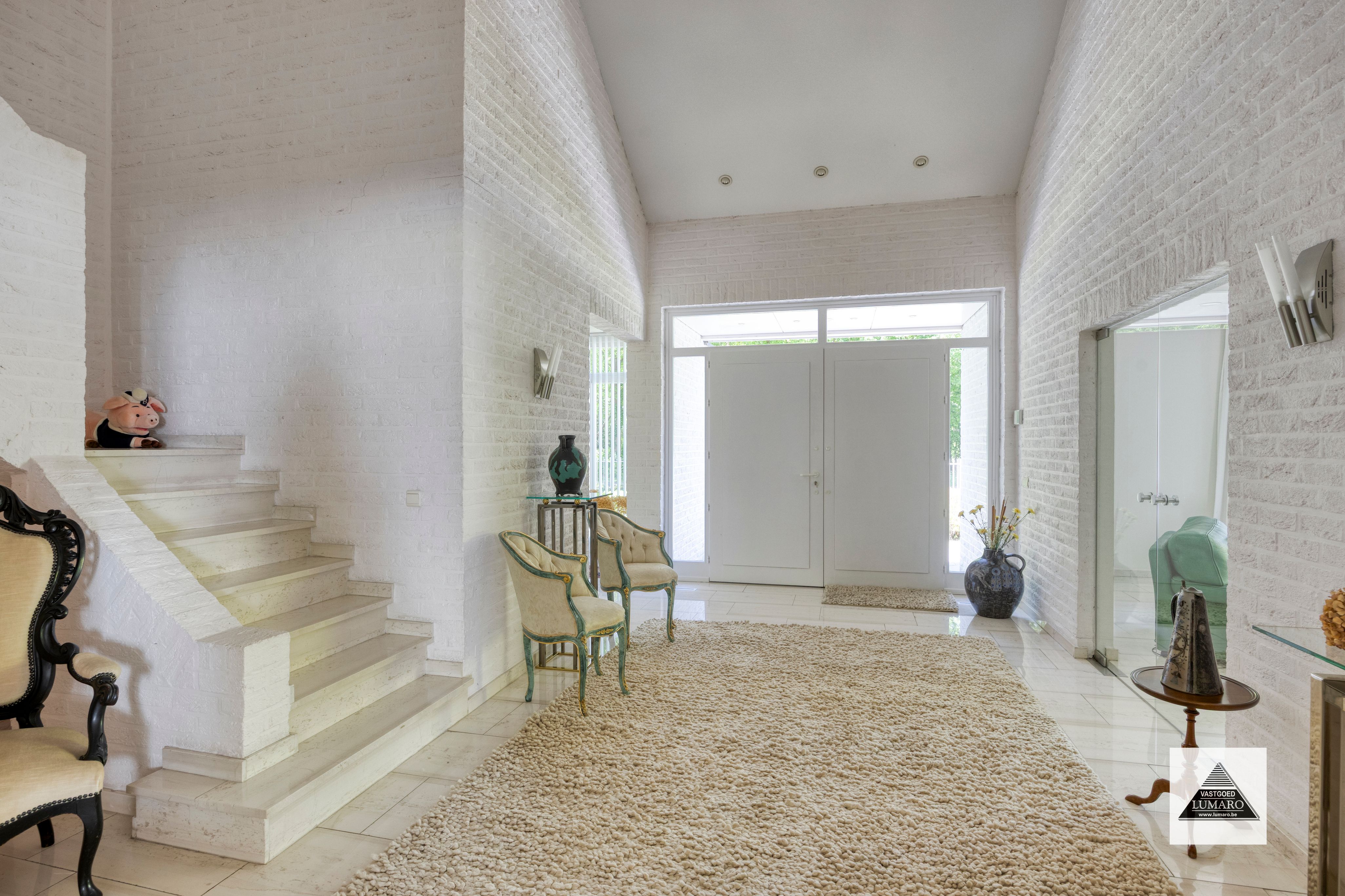 - Inkom: (3,25 m x 6,50 m = 21,16 m²) – natuursteen vloer - - toilet – vestiaire - natuurstenen trap naar het verdiep – hoge hal (vide) – 2 x dubbele glasdeur naar de leefruimte -- onmiddellijk tuincontact
