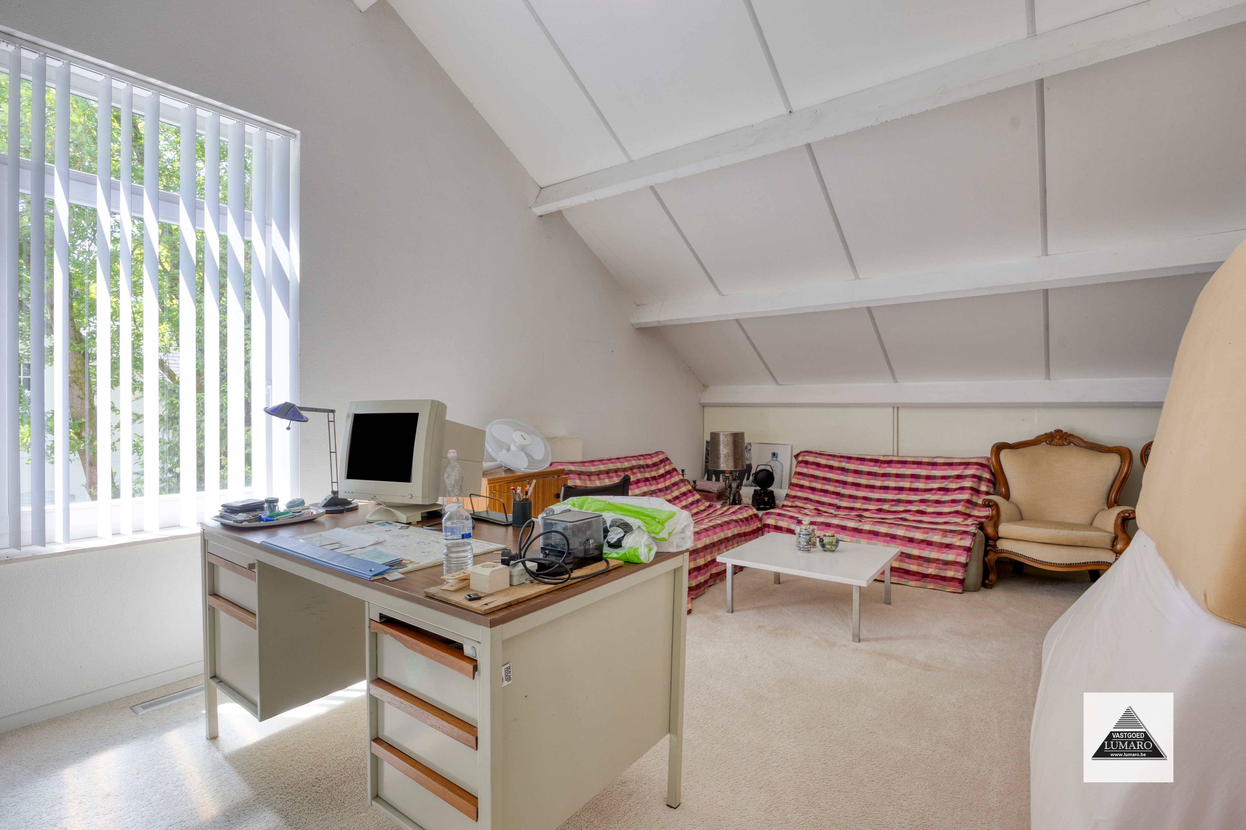 - Bureel : (4,05 m x 4,50 m = 18,23 m²) – vloerbekleding – venster op voorgevel en op zijgevel