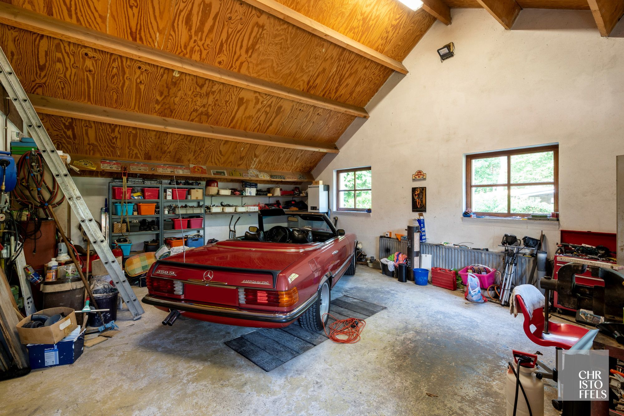 De westelijk georiënteerde tuin is volledig aangelegd en voorzien van een zwembad. Achteraan het perceel is een bijgebouw aanwezig dat perfect dienst kan doen als werkplaats voor hobby's zoals sleutelen aan auto’s, of als bijkomende opslagruimte.