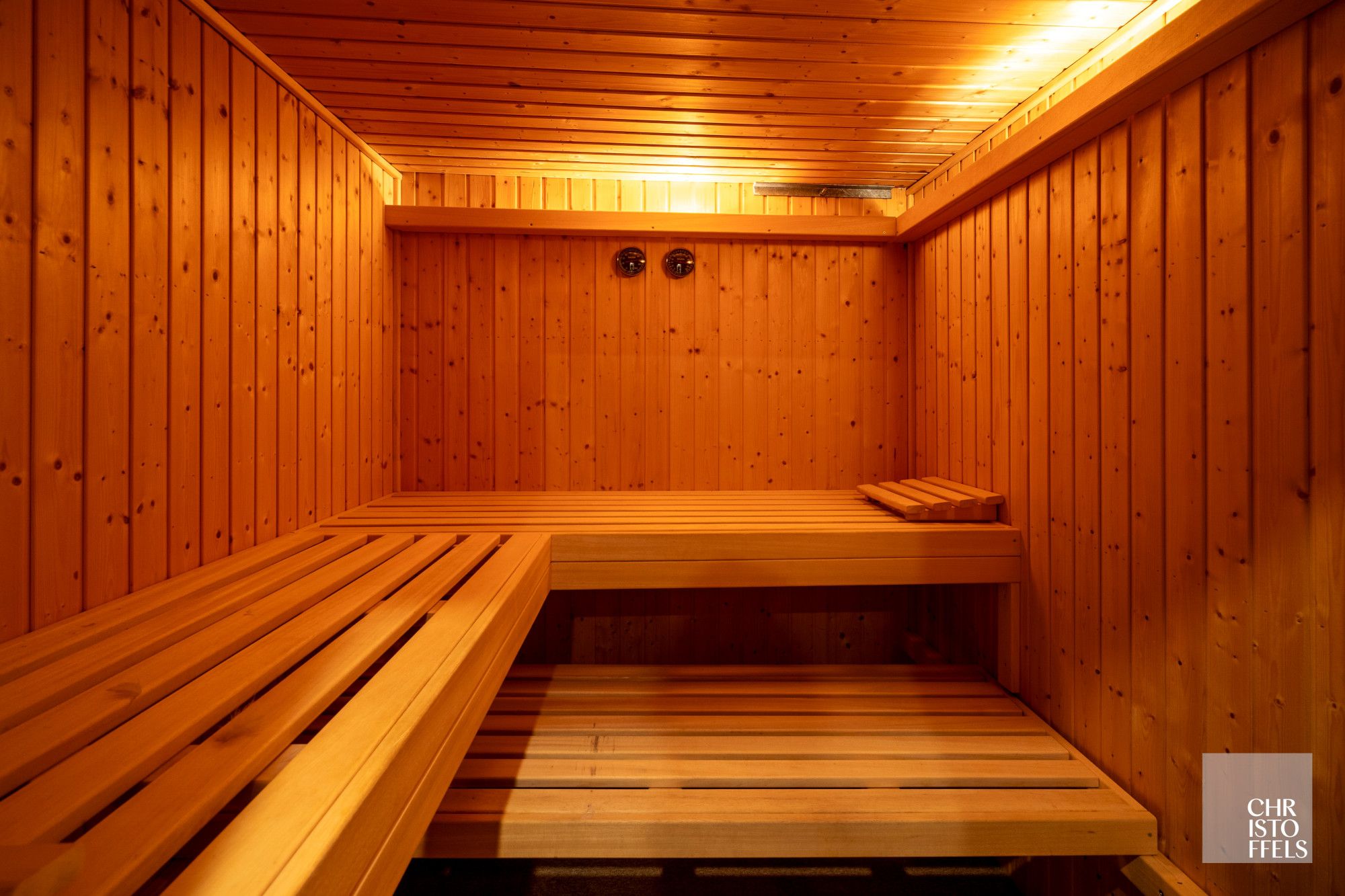 Op de eerste verdieping bevindt zich een nachthal die toegang biedt tot drie bijkomende slaapkamers. Verder is er een eenvoudige douchekamer, Tot slot is er een aparte wellnessruimte met een sauna.