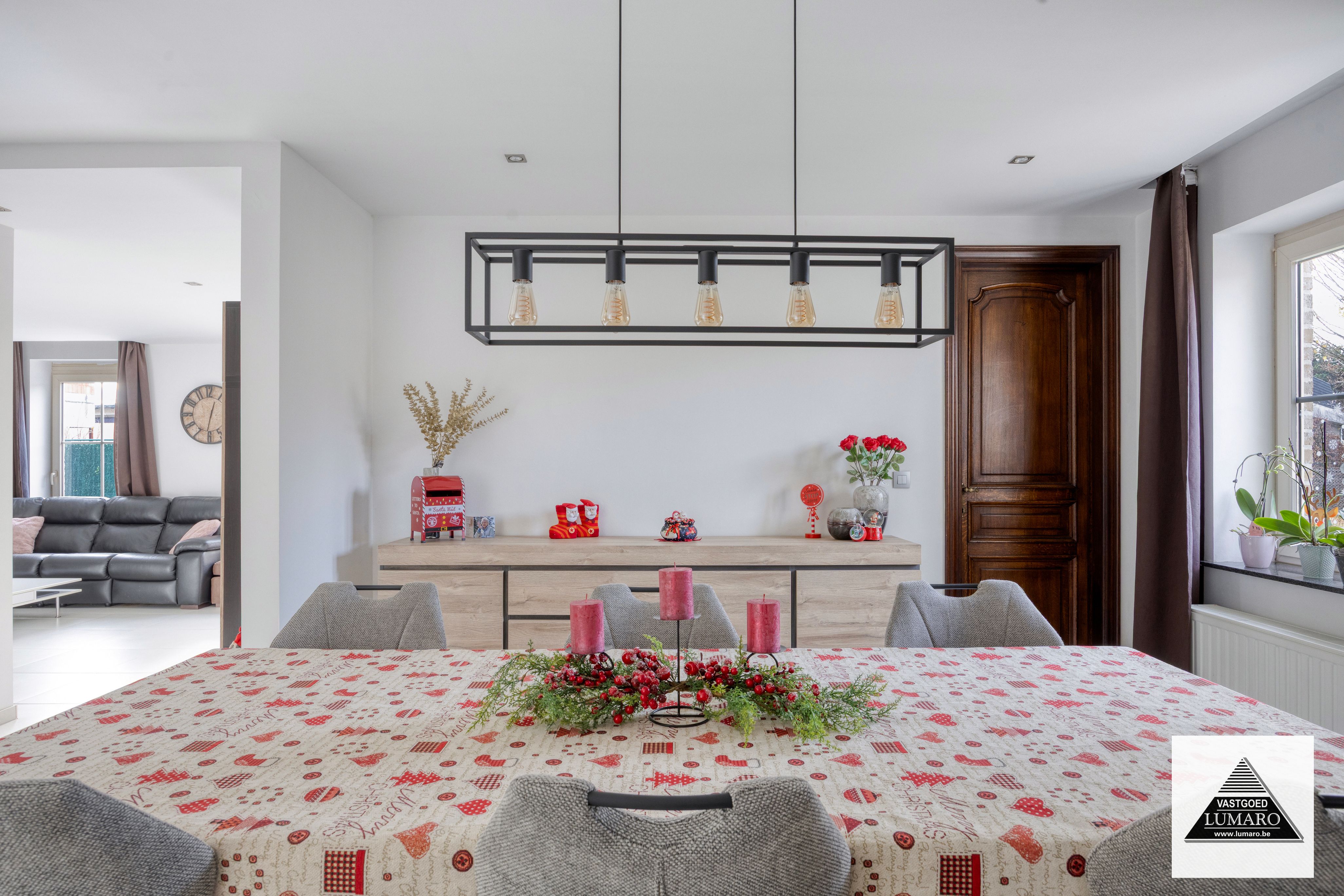 - Keuken : (5,90 m x 3,95 m / 5,30 m = 26,20 m²) – tegels – leefkeuken volledig ingericht (13 j), vaatwasser en frigo (3j), microgolfoven en oven, inductiefornuis,..