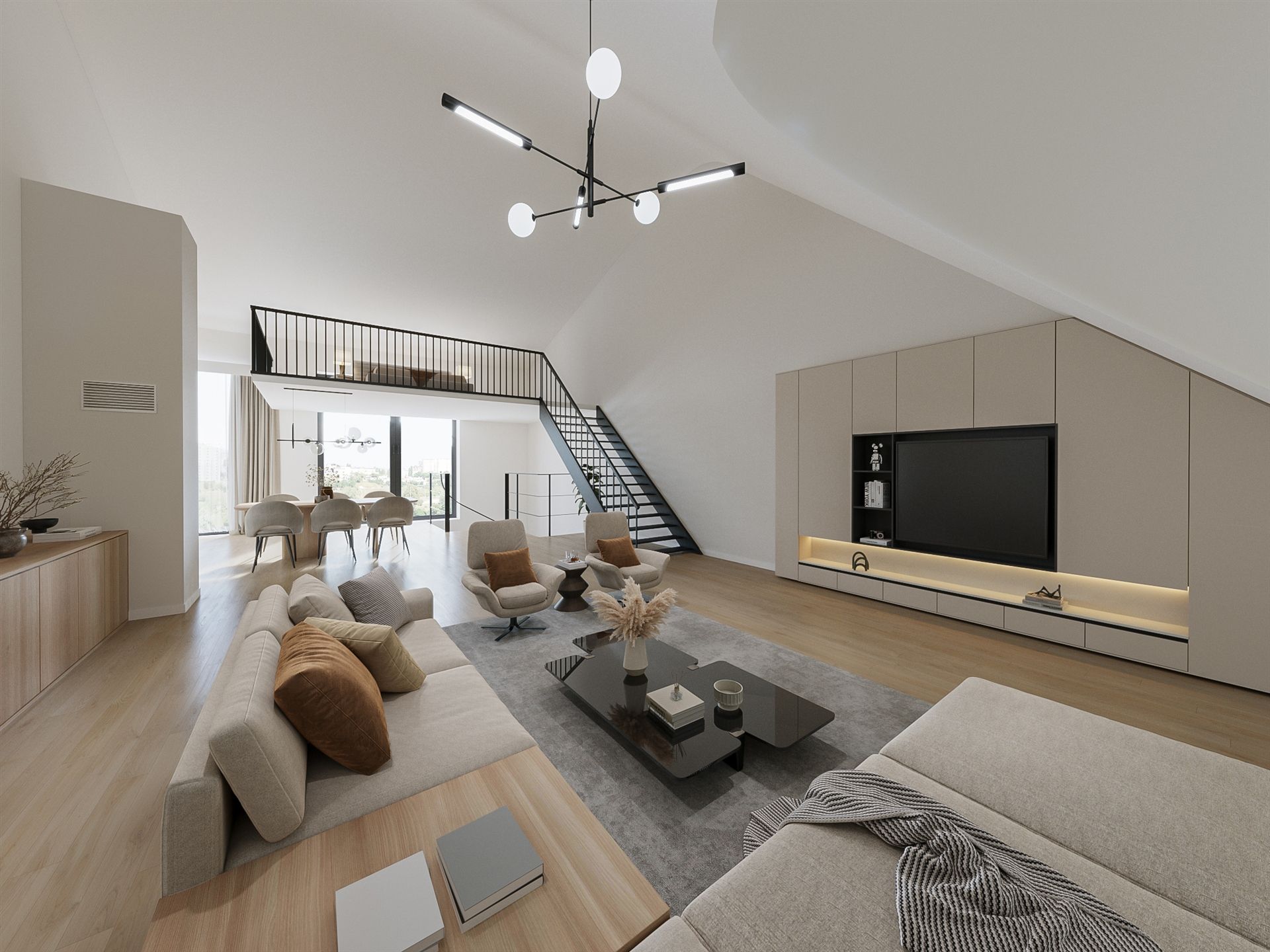 De inkomhal op de eerste verdieping geeft u toegang tot twee slaapkamers, waarvan één is uitgerust met een geïntegreerde badkamer. Deze kamer heeft een open en luxueus karakter, ideaal voor wie houdt van een moderne, loftachtige sfeer.