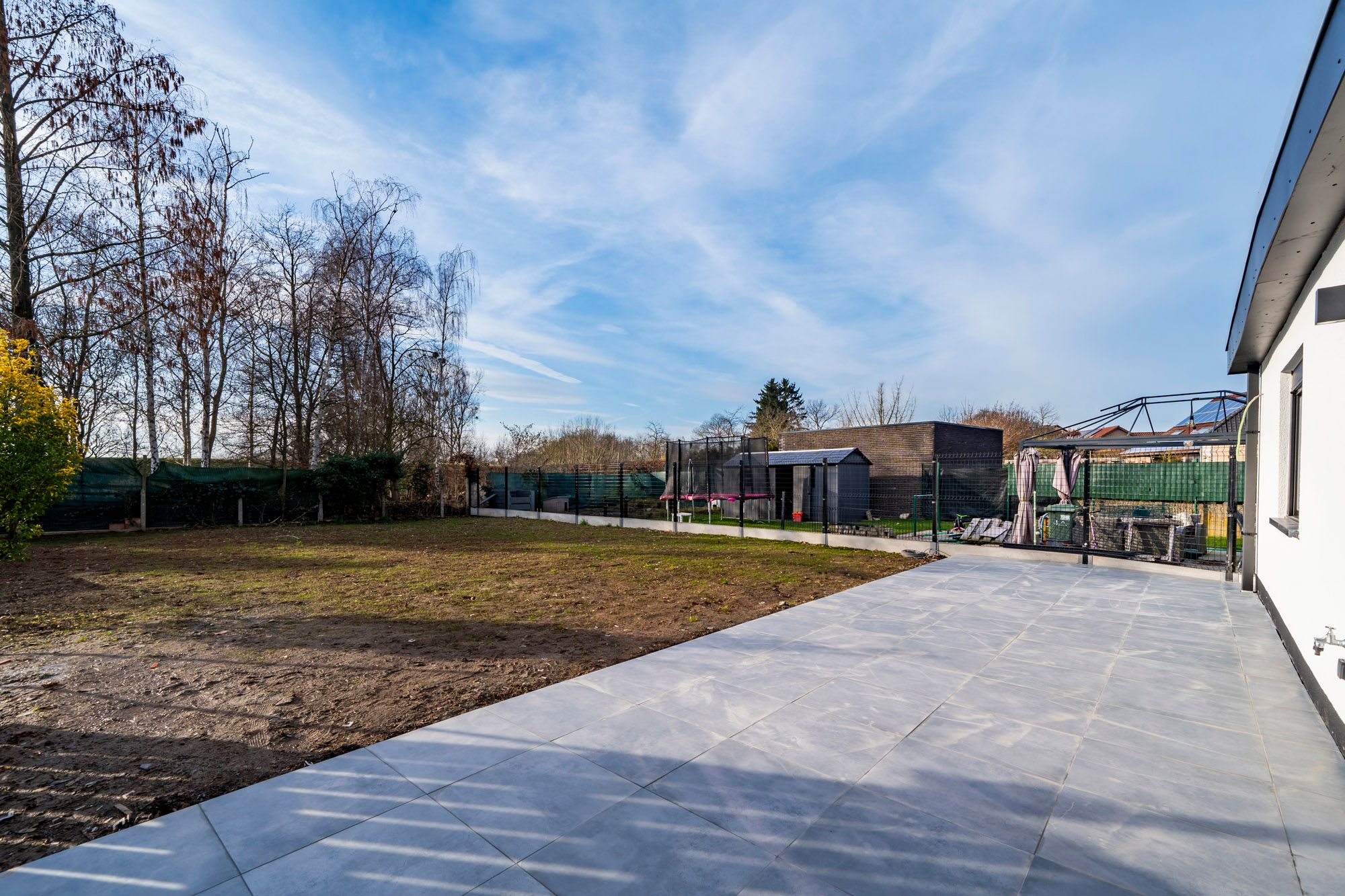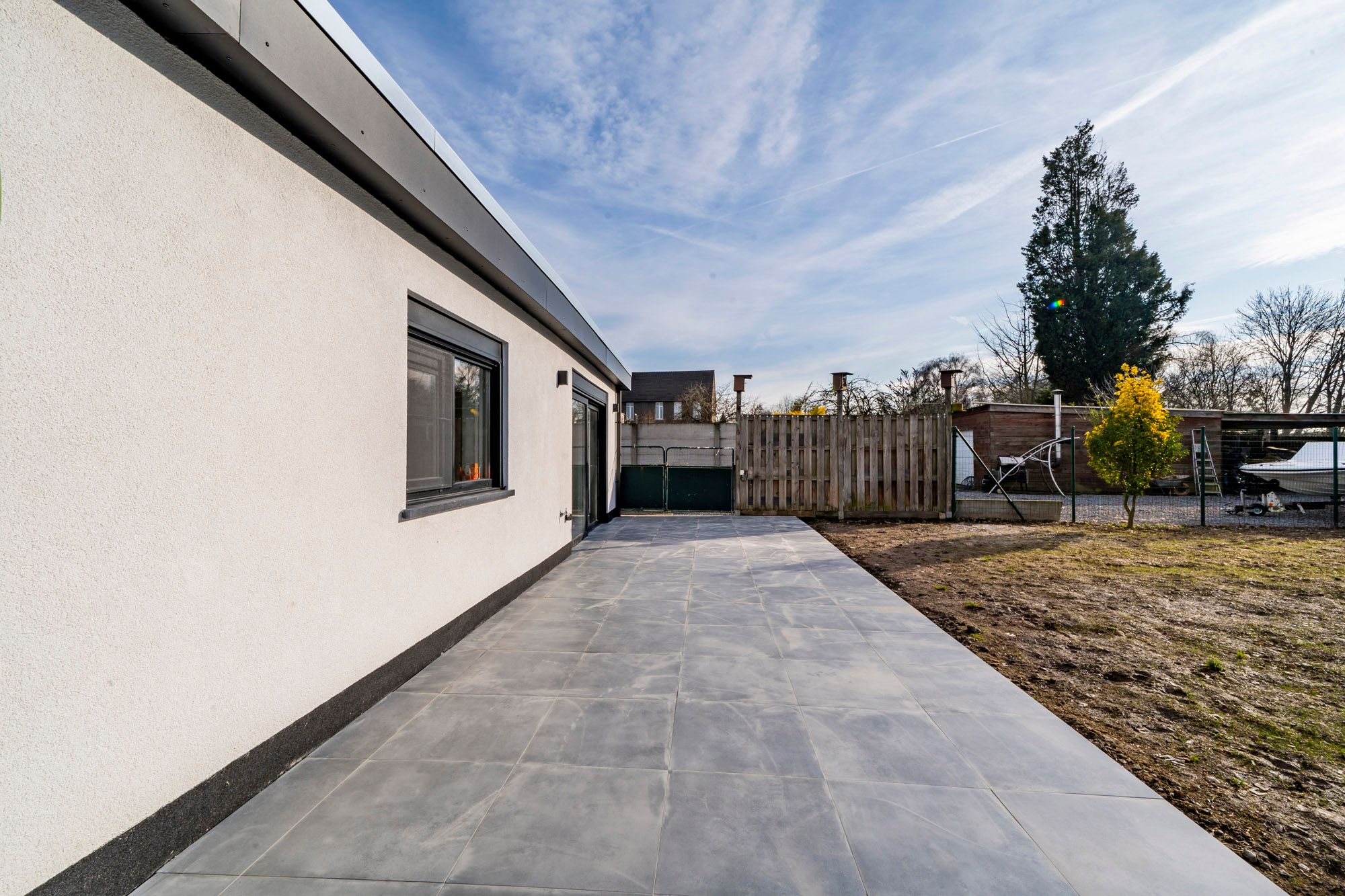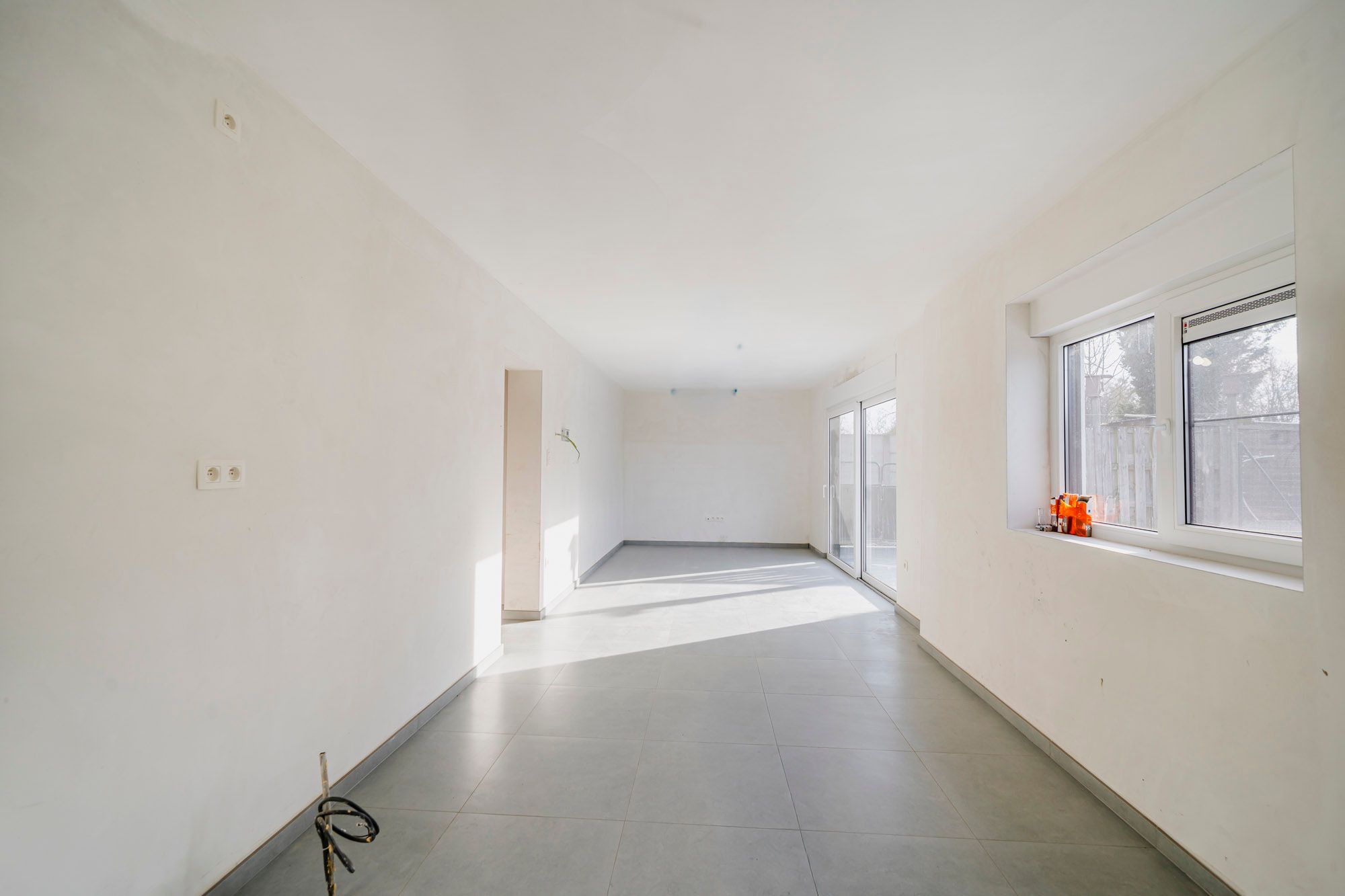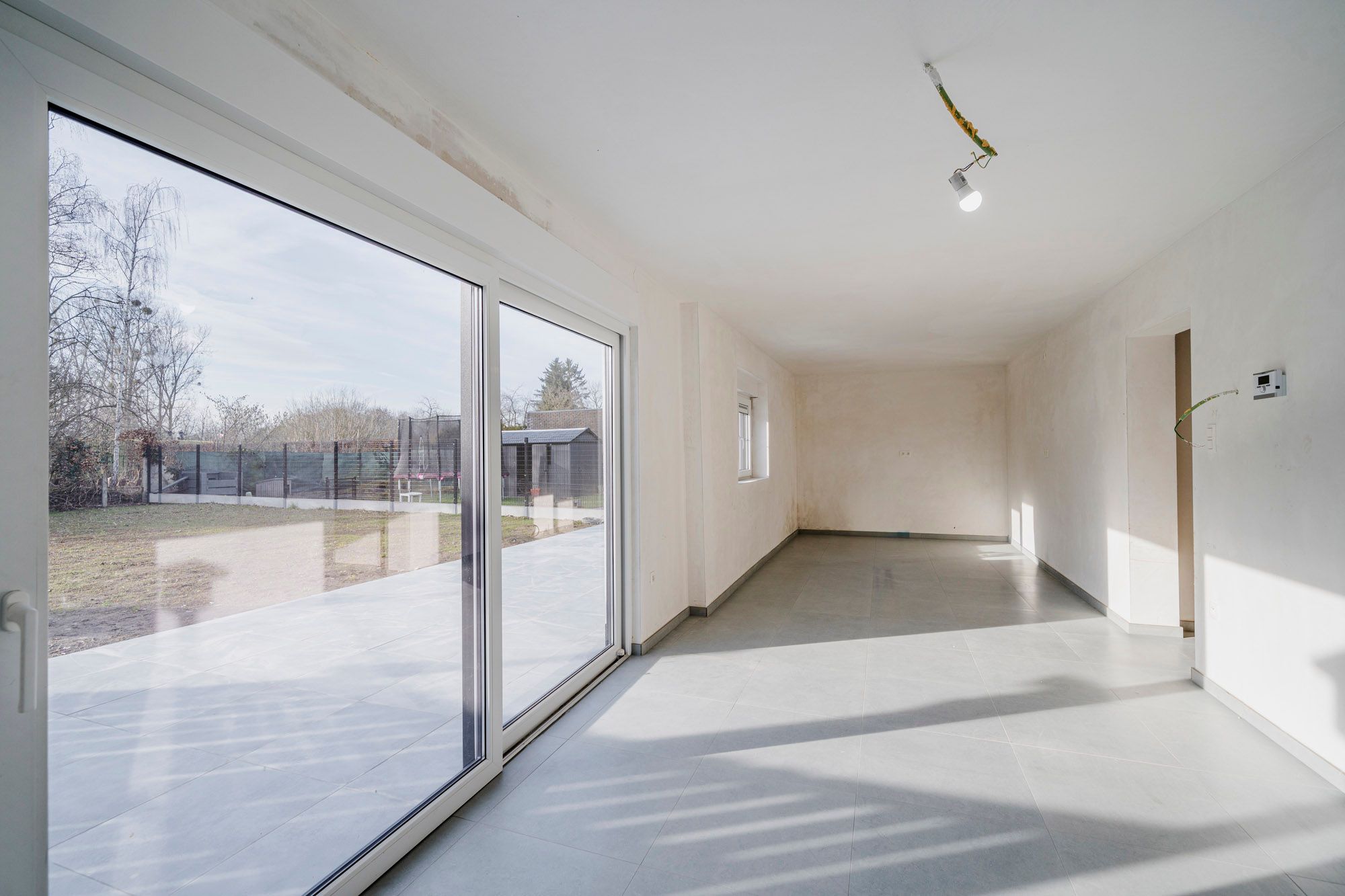 Aansluitend op de woonkamer met open keuken is er via schuifpui een terras over heel de breedte van de woning.