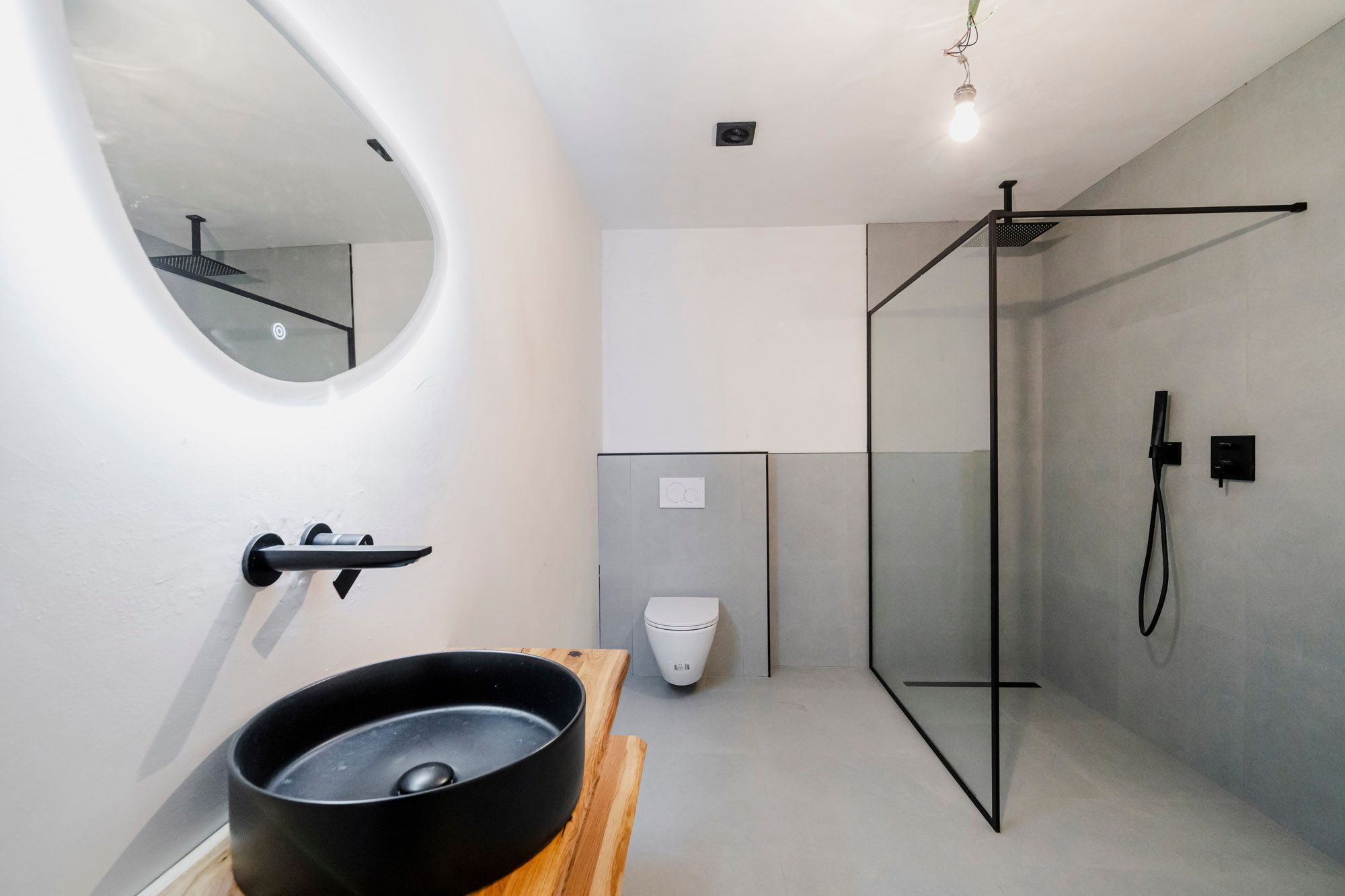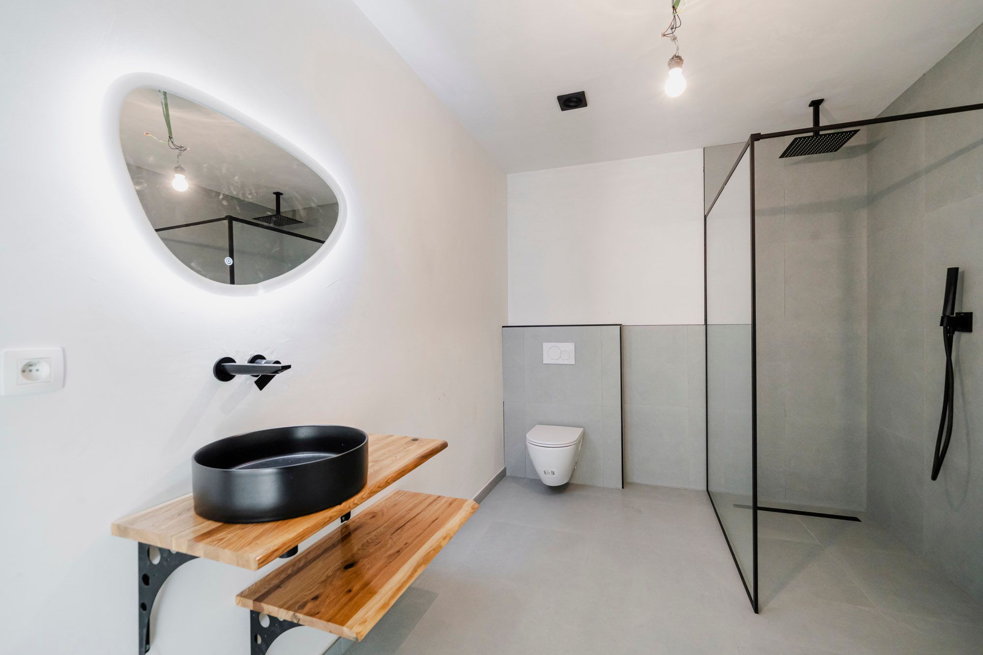 - Badkamer: (3,97 m x 2,50 m = 9,93 m²) – tegelvloer – nieuw ingericht met inloopdouche, opzetlavabo, toilet