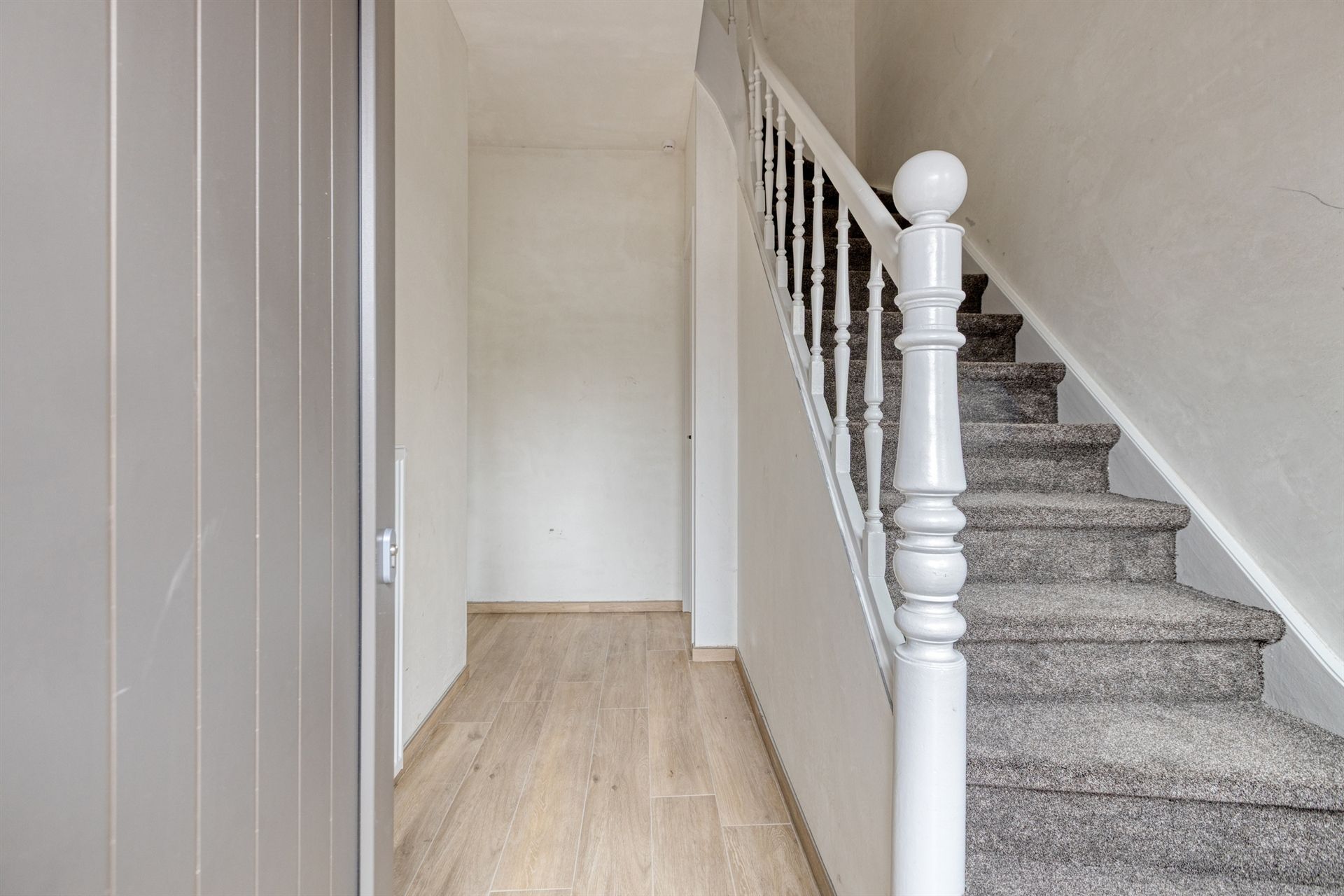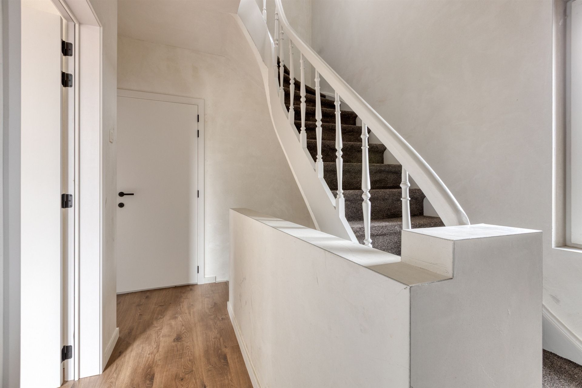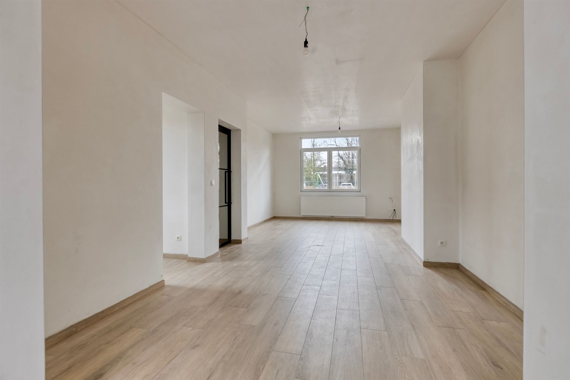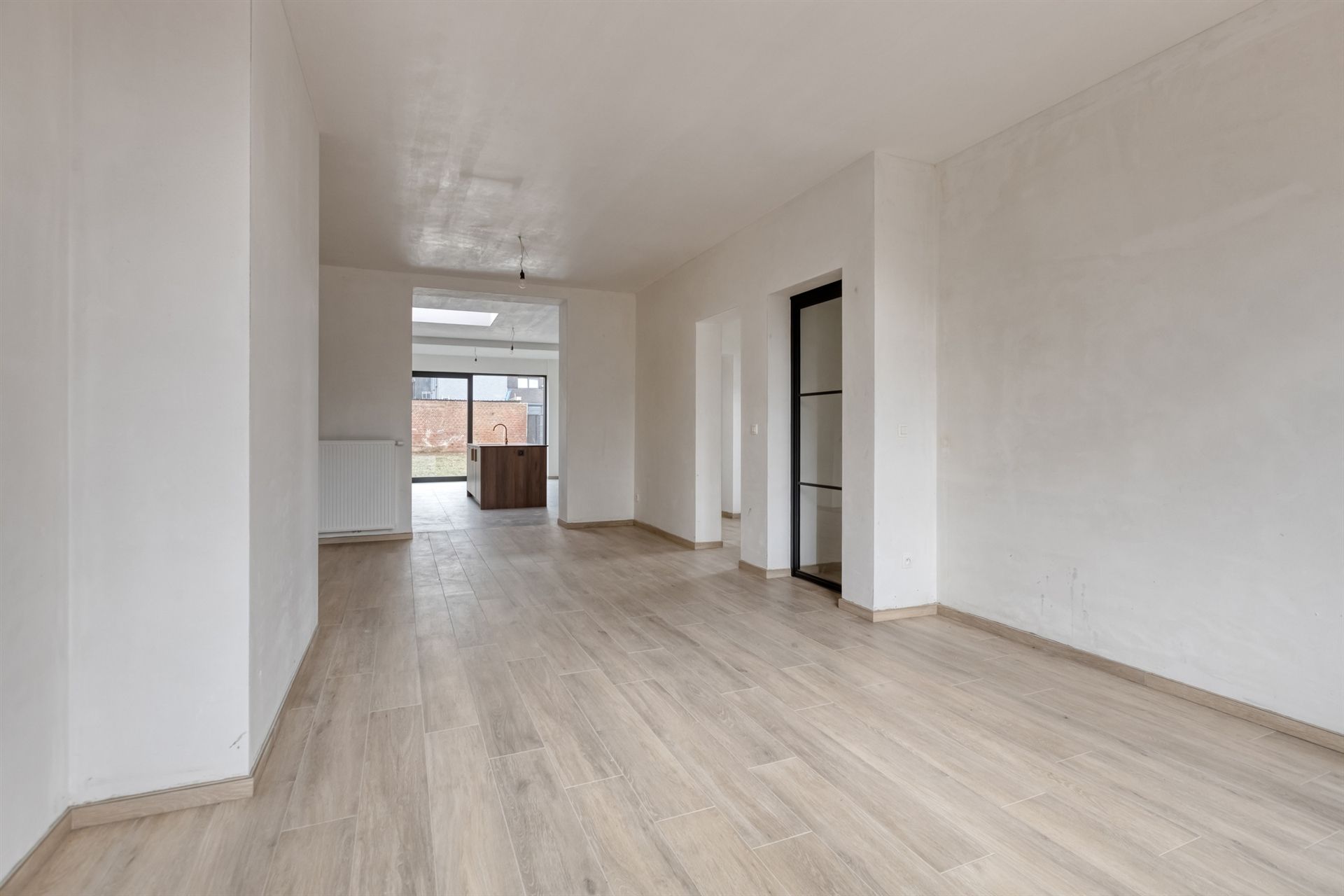 Bij binnenkomst word je verwelkomd in een stijlvolle inkomhal met parkettegels, die doorlopen in de ruime, lichtrijke woonkamer. Dankzij de grote raampartijen geniet je hier van een overvloed aan natuurlijk licht.