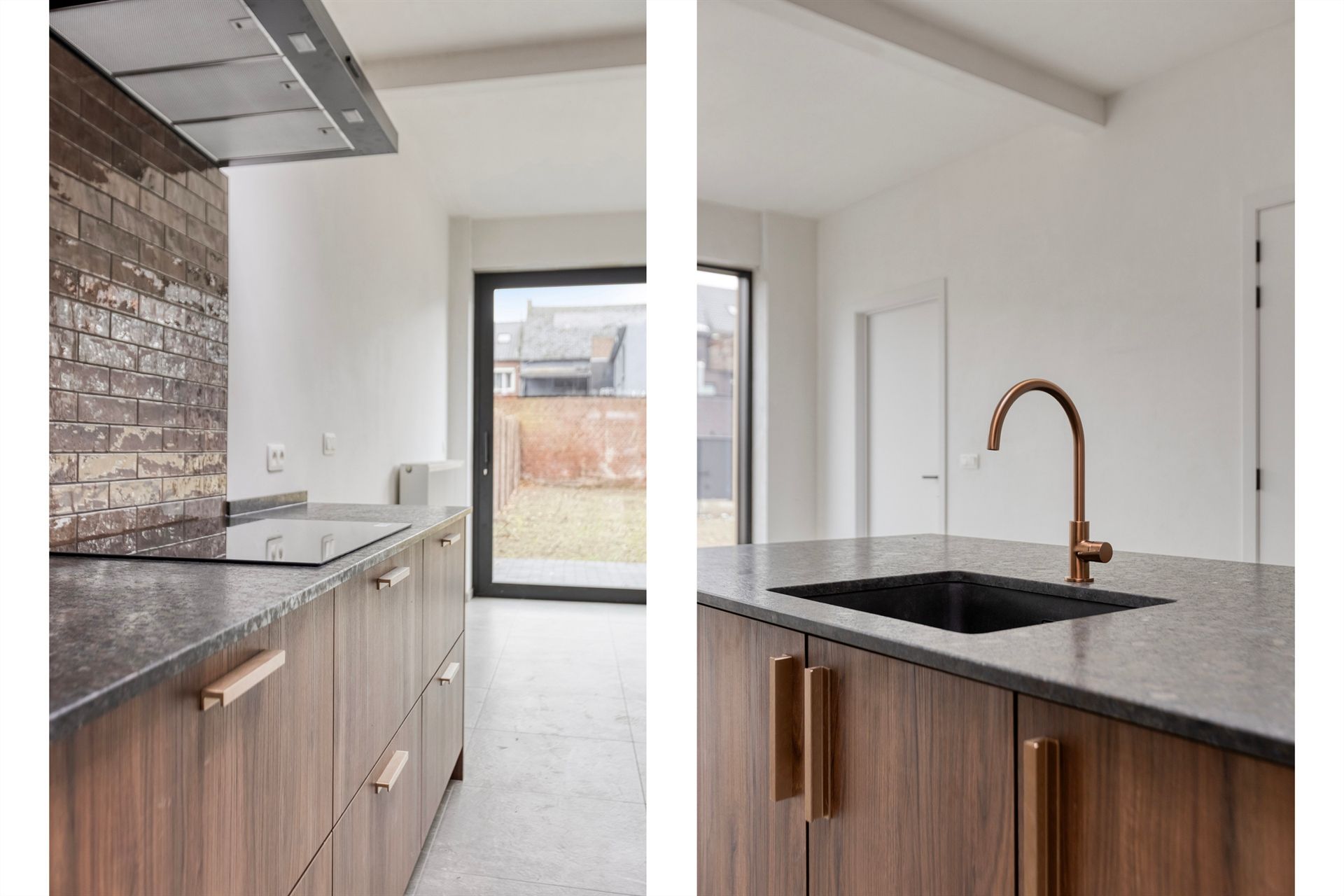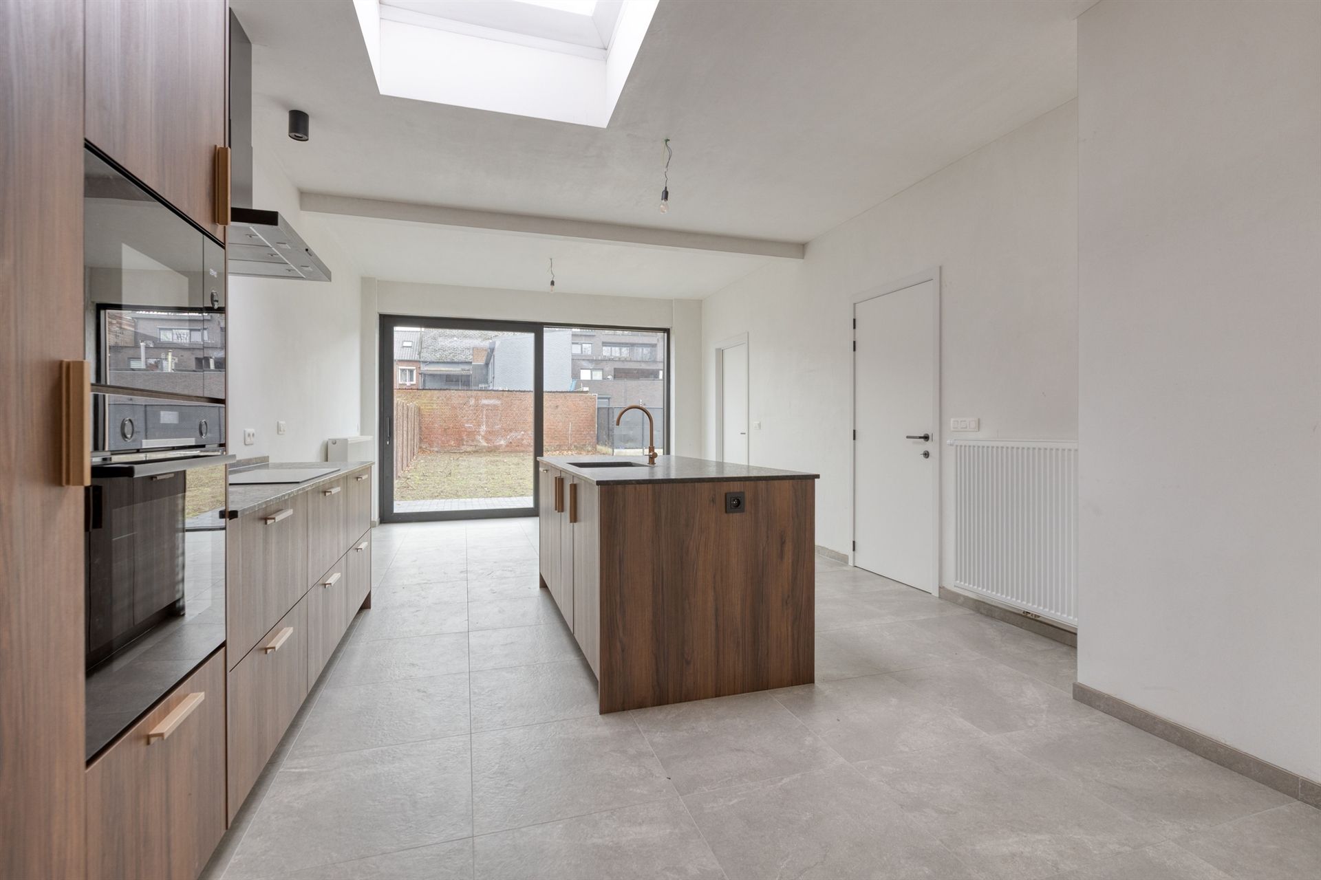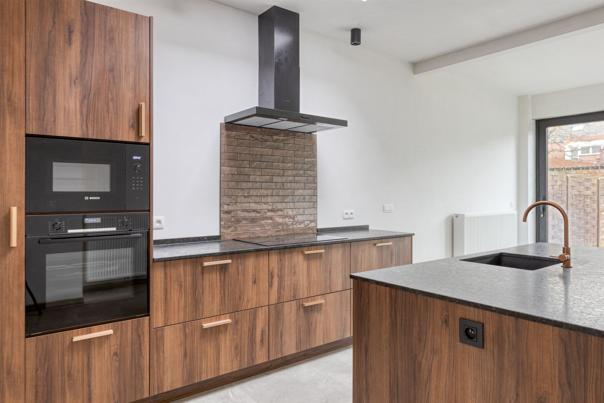 De volledig nieuwe keuken is uitgerust met kwalitatieve toestellen van Bosch: ingebouwde microgolf, oven, dampkap en vaatwasser. De keramische tegelvloer, de lichtkoepel boven het aanrecht en het prachtige zicht op de zuidgerichte tuin maken van deze keuken een echte eyecatcher. Via de grote schuifraam heb je rechtstreeks toegang tot het terras en de tuin.