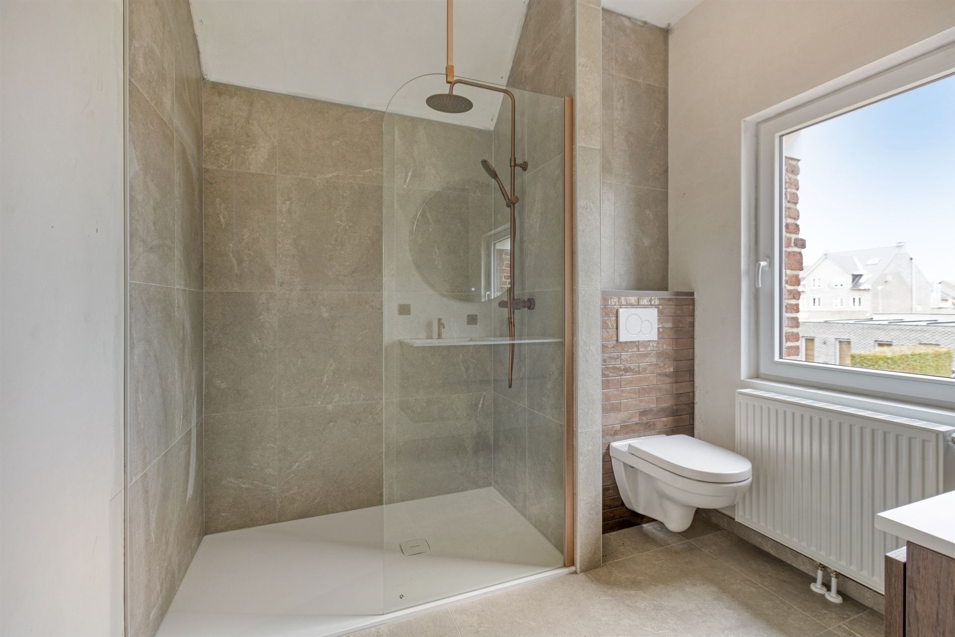 Op de eerste verdieping bevinden zich twee slaapkamers en een volledig vernieuwde badkamer, ingericht met een moderne inloopdouche, dubbele wastafel en hangtoilet.