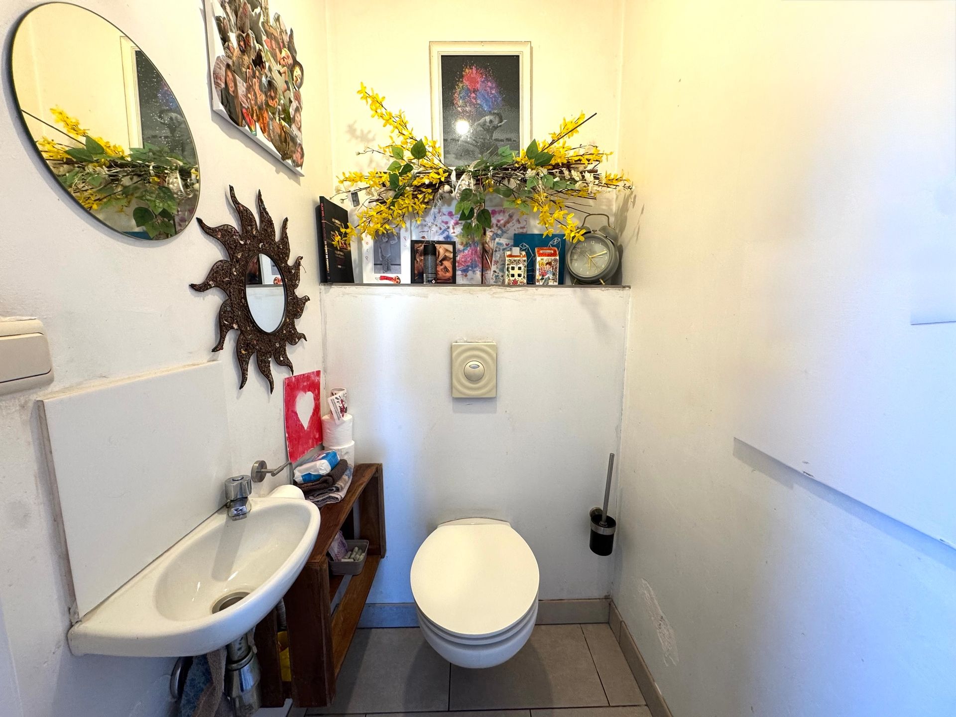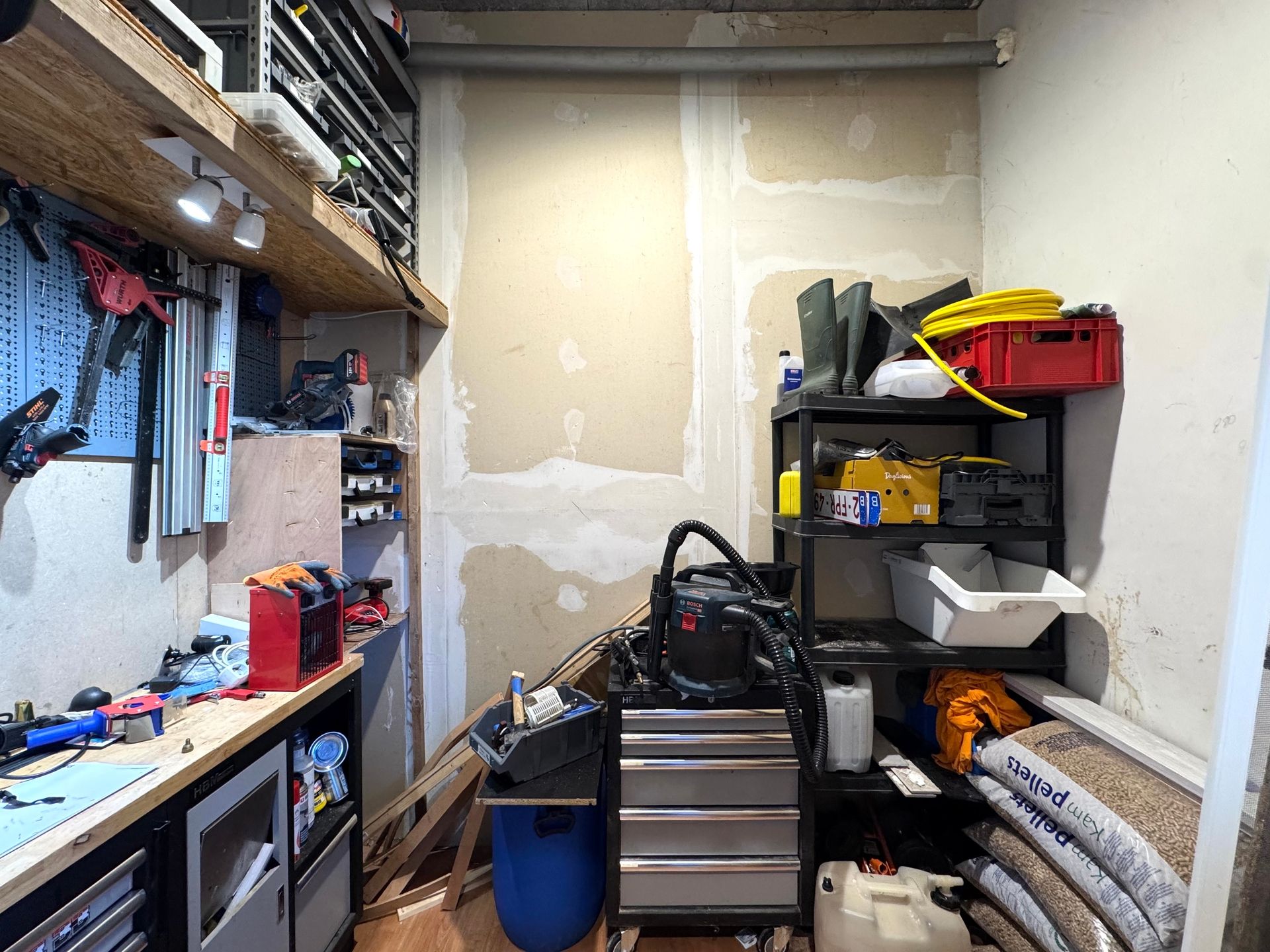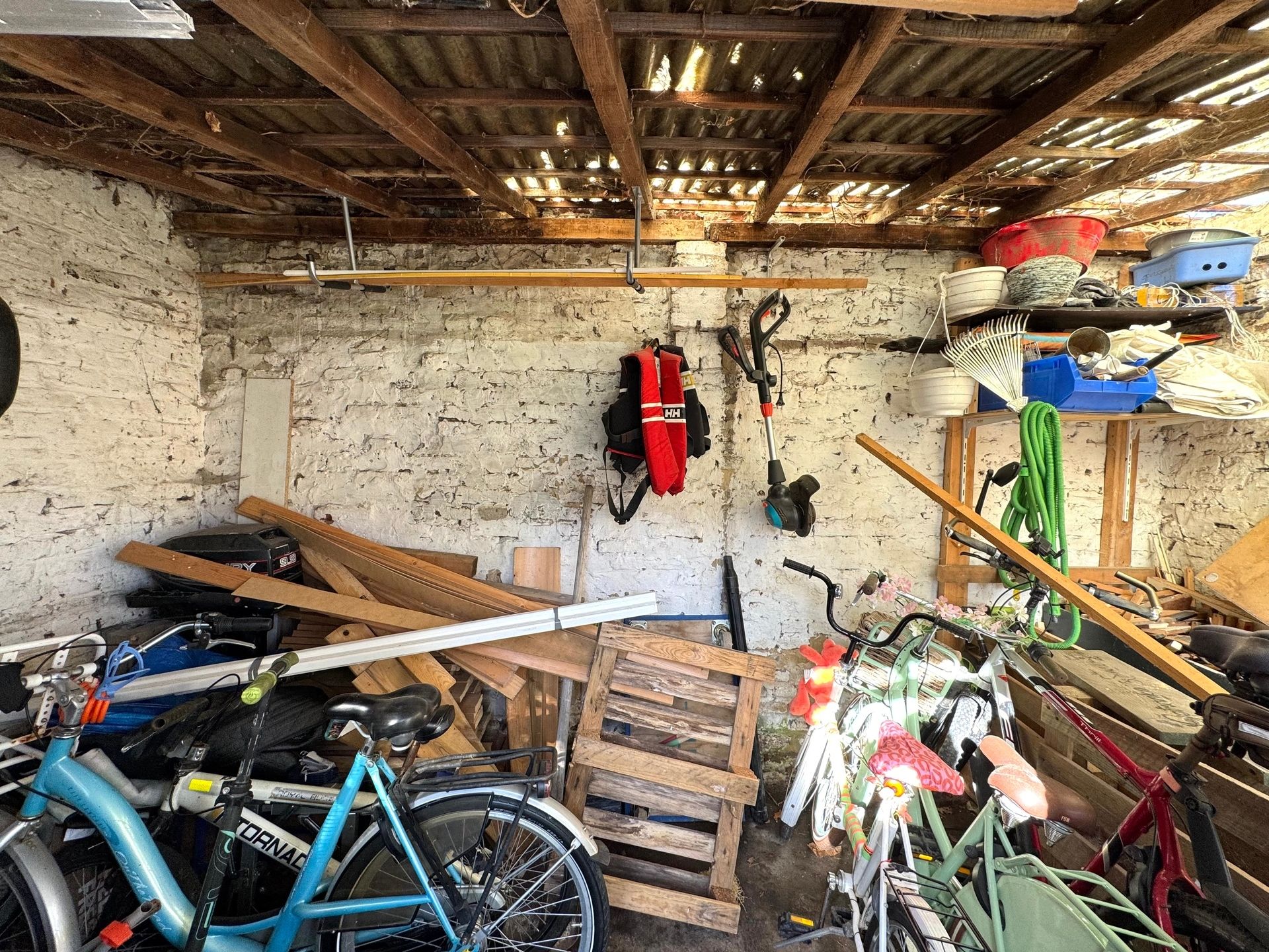 Via de zijdeur bereiken we de badkamer, voorzien van een bad, douche en lavabo. Verder beschikt de woning over een apart gastentoilet, een praktische voorraadruimte en een wasplaats met toegang tot de werkruimte en de volledig omheinde tuin.
