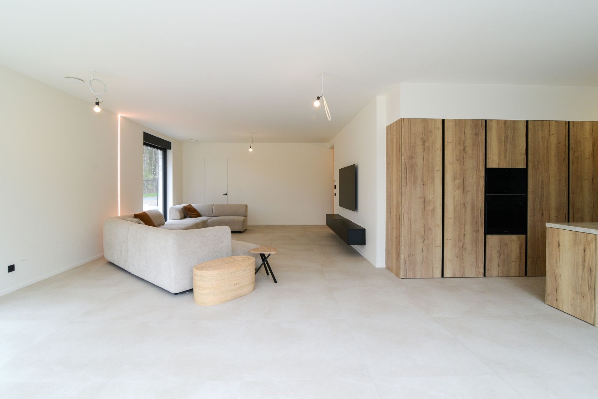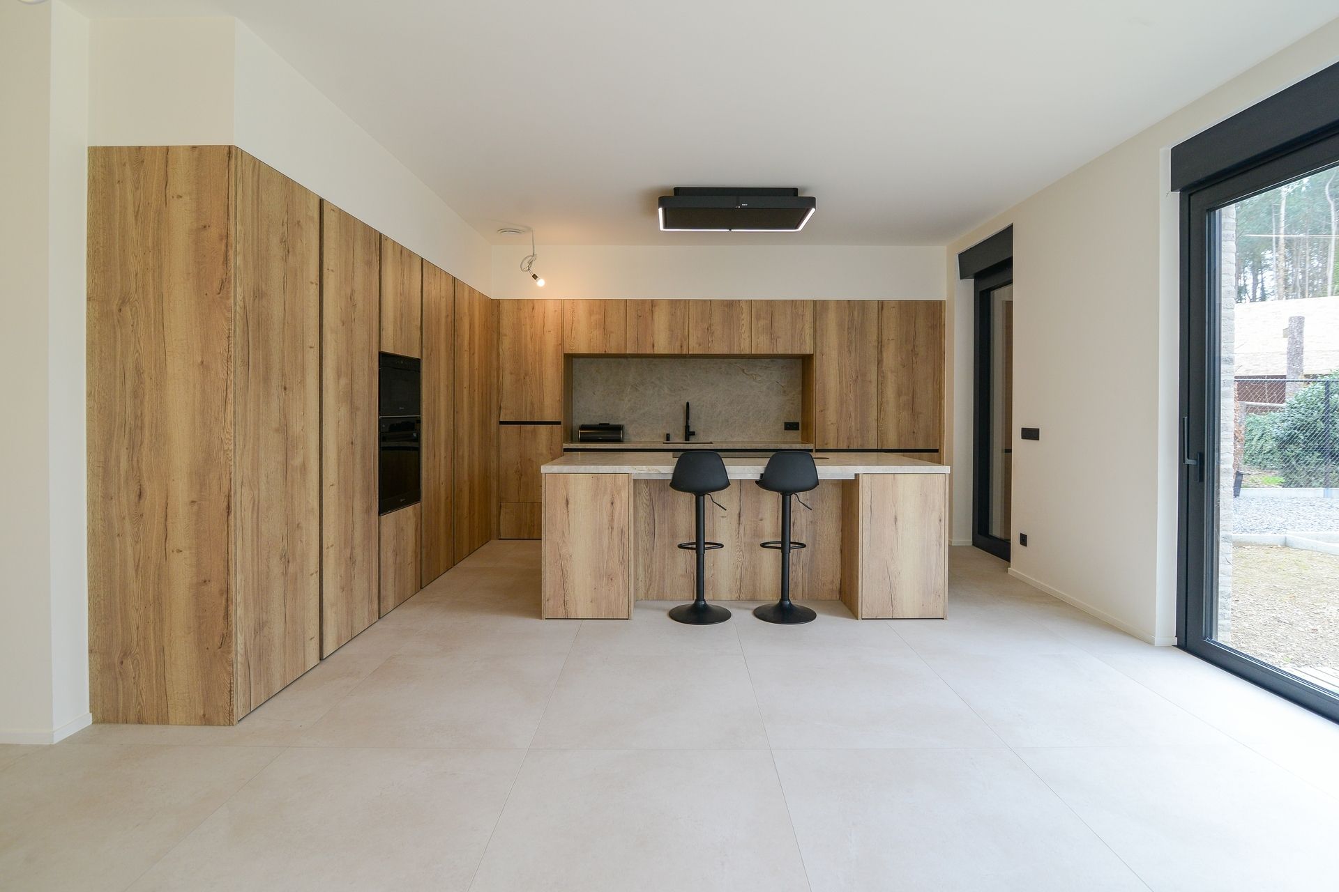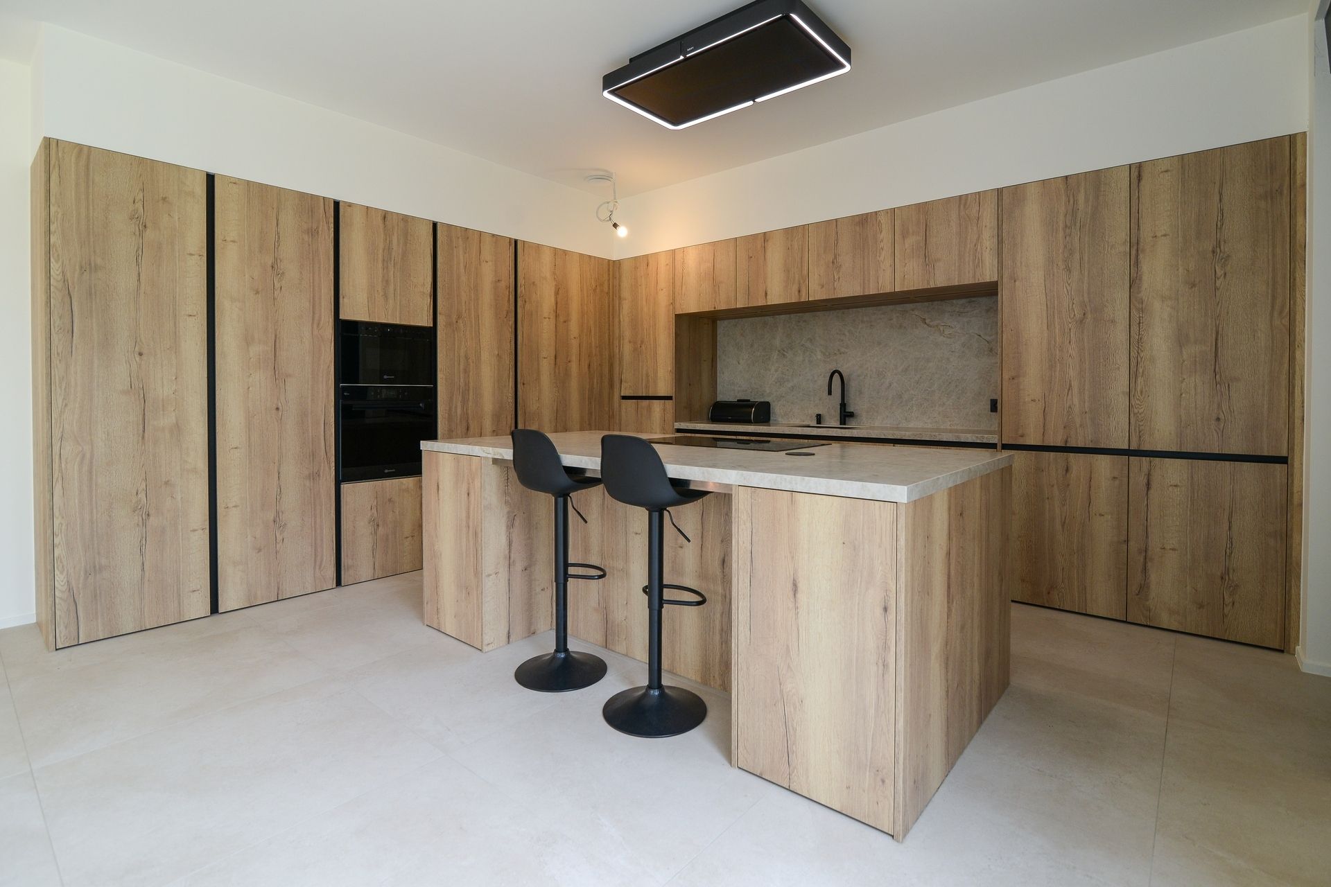 De keuken is afgewerkt met een keramisch werkblad met verdikte randen en uitgerust met alle moderne toestellen: inductiekookplaat, Novy dampkap, oven, microgolfoven, vaatwasser en koelkast van Bauknecht. Daarnaast beschikt de keuken over een Quooker (kokendwaterkraan) en handige ingebouwde stopcontacten in het werkblad. Via een discreet ingewerkte deur bereikt u de ruime berging, die ook rechtstreeks toegankelijk is via een buitendeur.